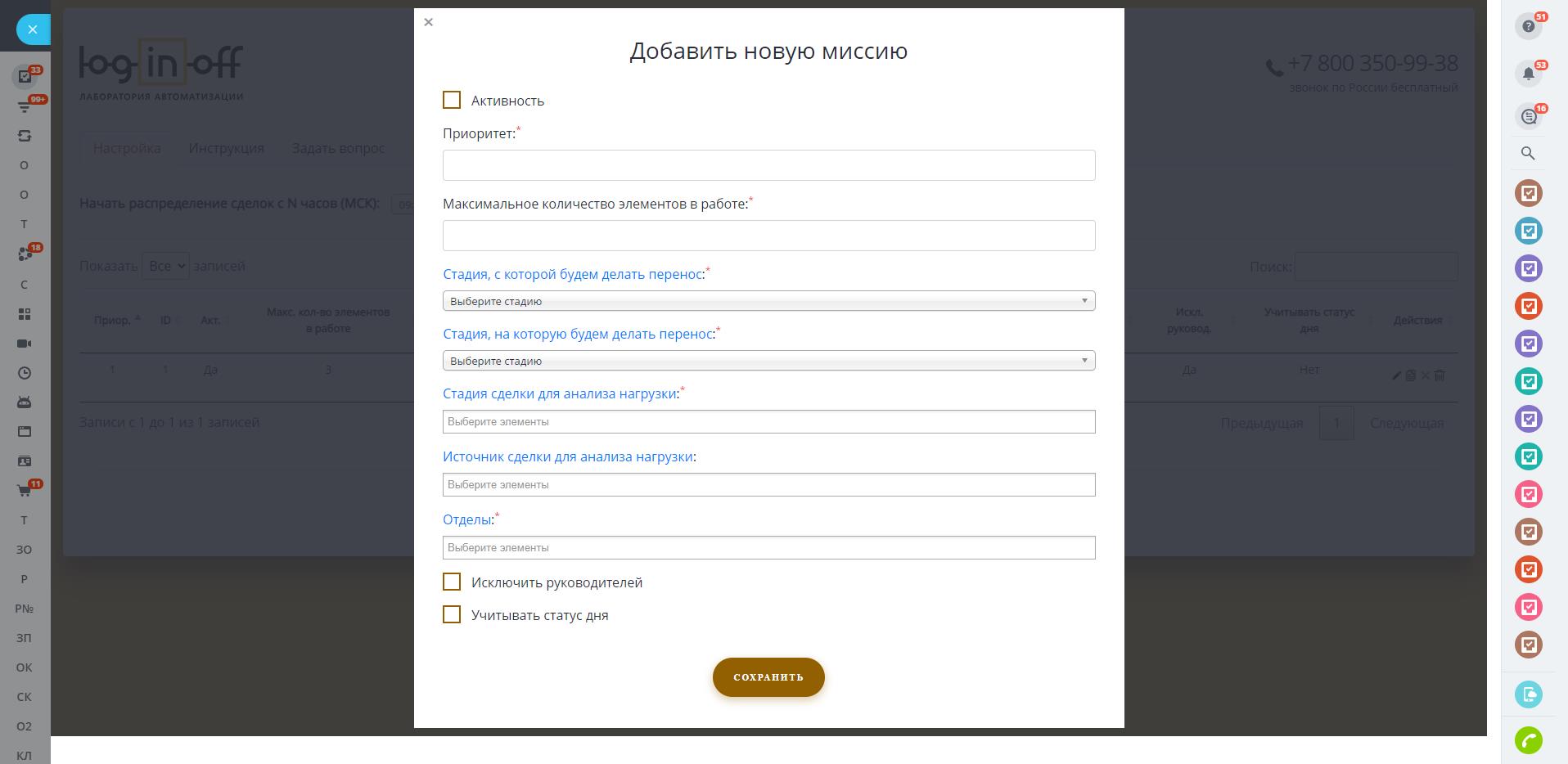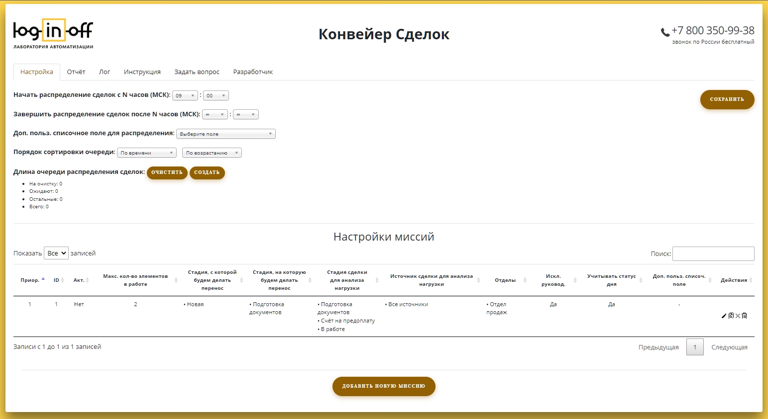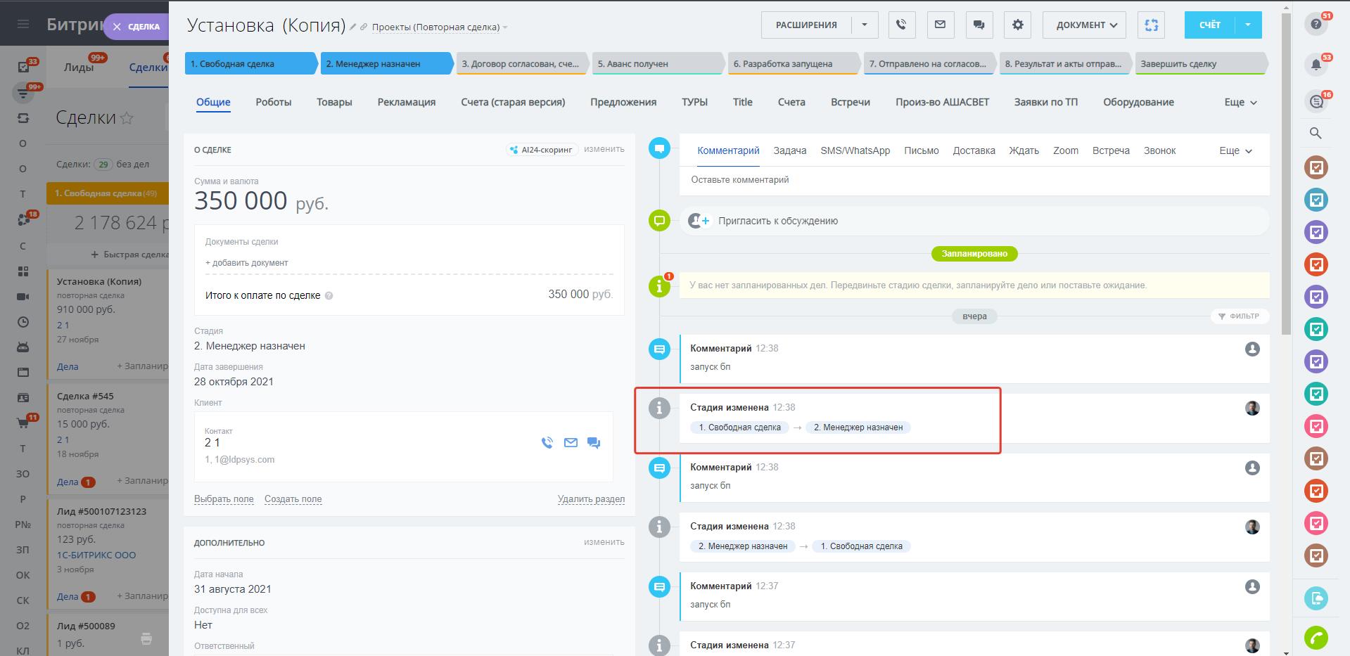 Автоматическое распределение сделок по сотрудникам на отдел, с учетом их рабочего дня и нагрузки.