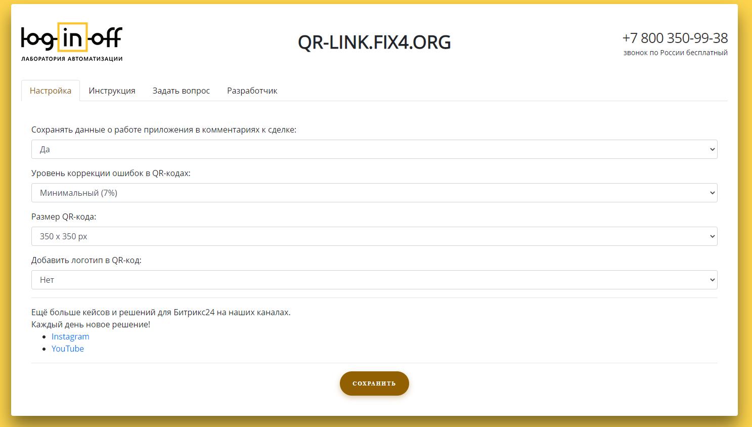 - Флажок [QR-LINK.FIX4.ORG] Сгенерировать QR со значениями «Да/Нет» — служит ключом ручного старта генерации кода.