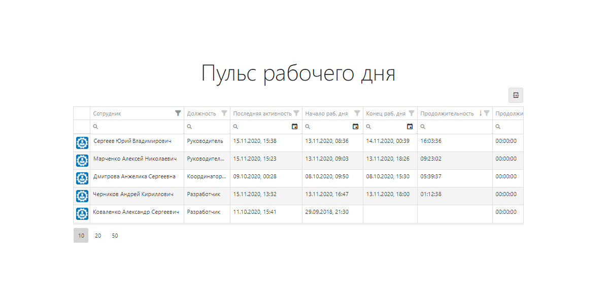Если ваш тариф позволяет вести учет рабочего времени, приложение соберет и представит данные о текущей активности сотрудников, а также проверит, откуда сотрудники начинают и завершают рабочий день.