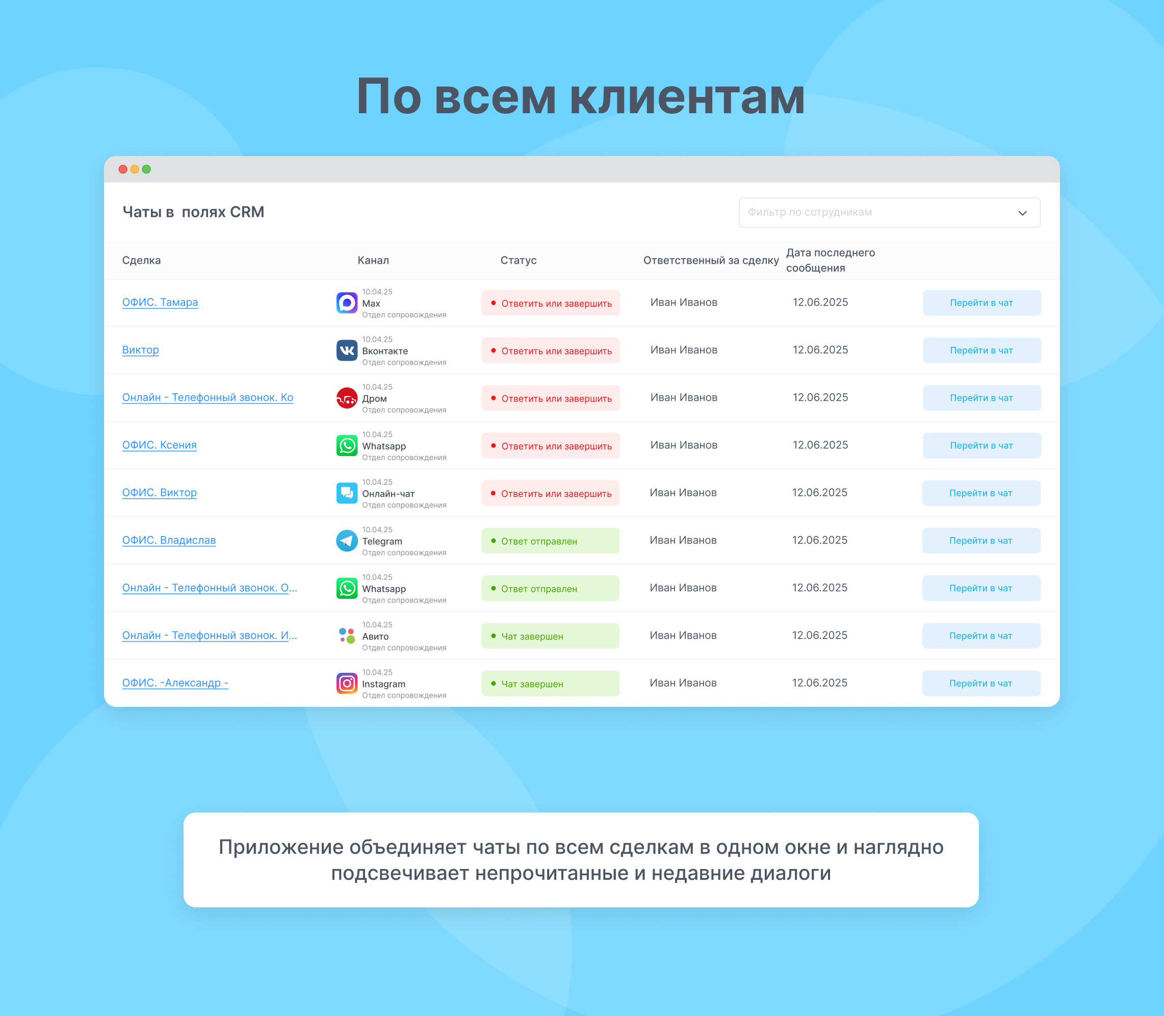 Приложение встраивается в поля сущностей вашей CRM-системы (лиды, сделки, контакты, компании) и предоставляет всю необходимую информацию о чатах с клиентами. Вы всегда будете в курсе, в каком мессенджере происходит общение, кто из сотрудников компании участвует в коммуникации, и сможете быстро отреагировать на сообщения.