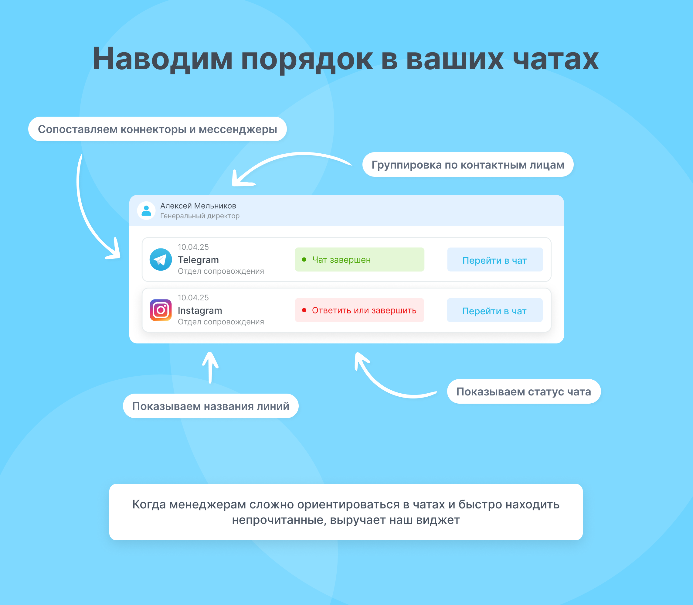 Быстрый доступ к информации - вы быстро получите доступ ко всем ключевым данным о чате, что ускорит вашу реакцию на входящие сообщения.