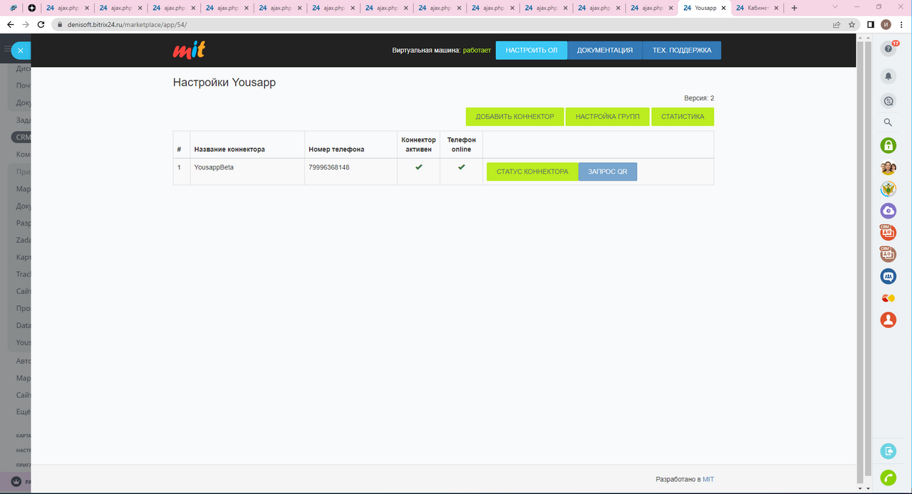 По Подписке Битрикс24.Маркет Плюс вы получаете полнофункциональную версию приложения, со всеми возможностями, доступными вам по тарифу Битрикс24 (работа в чатах открытых линий, роботы, триггеры, отправка сообщений через SMS коннектор, CRM маркетинг, подключение групп Whatsapp). Подключение трех номеров бесплатно, дополнительные номера согласно тарифам.