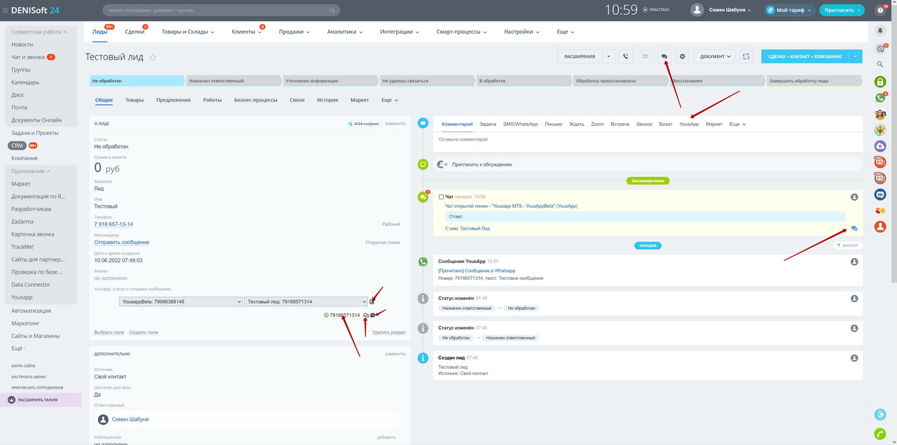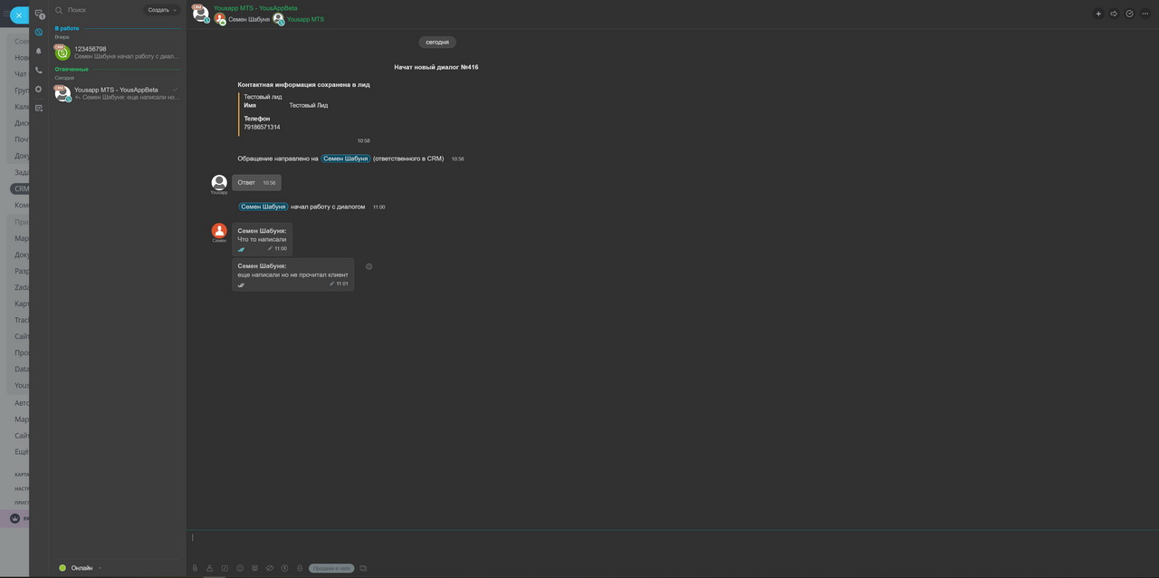 - Индикация статуса доставки и почтенности сообщения, отправленного из бизнес-процессов, роботов и приложения отправки сообщений в карточке CRM.