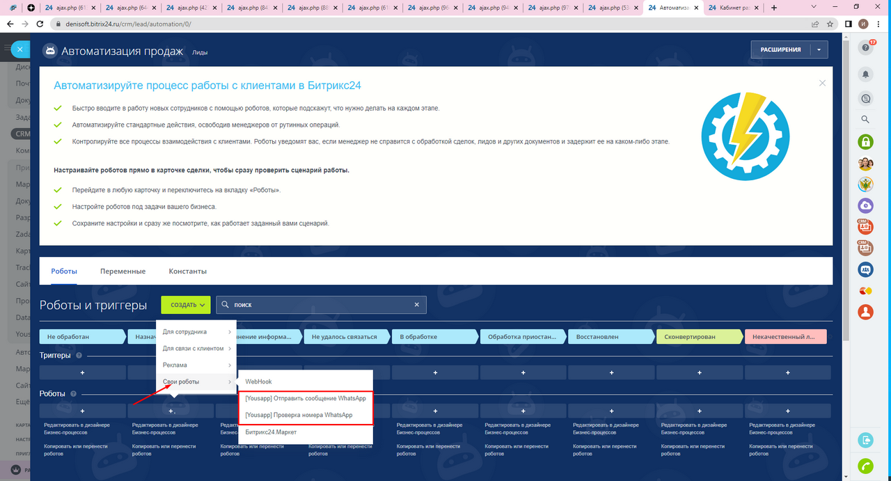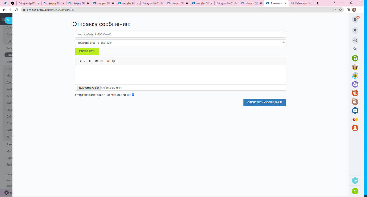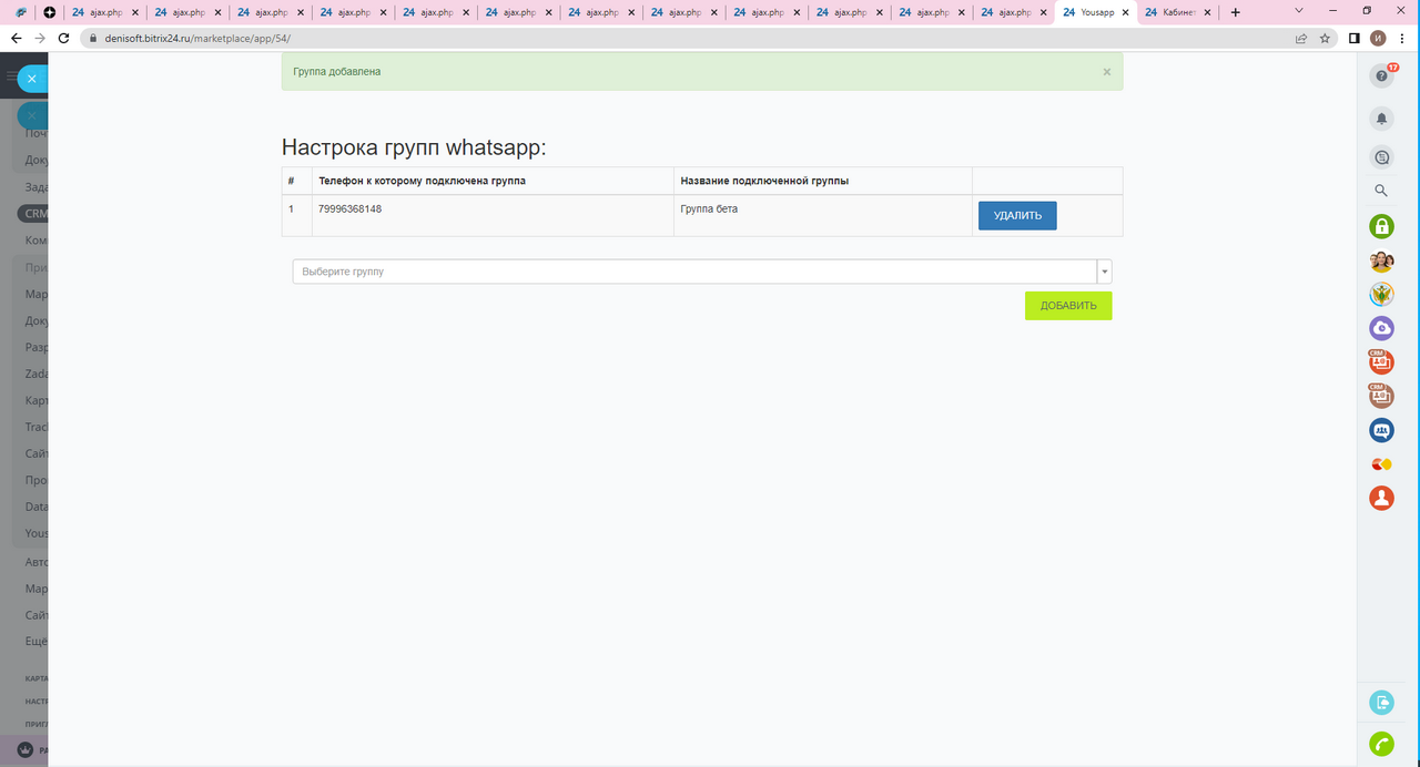 - Рассылка сообщений через CRM маркетинг Битрикс24 (ограничение 15 сообщений в минуту, но это не значит, что можно рассылать спам, мы против спама, возможна полная блокировка вашего номера в приложении Whatsapp)