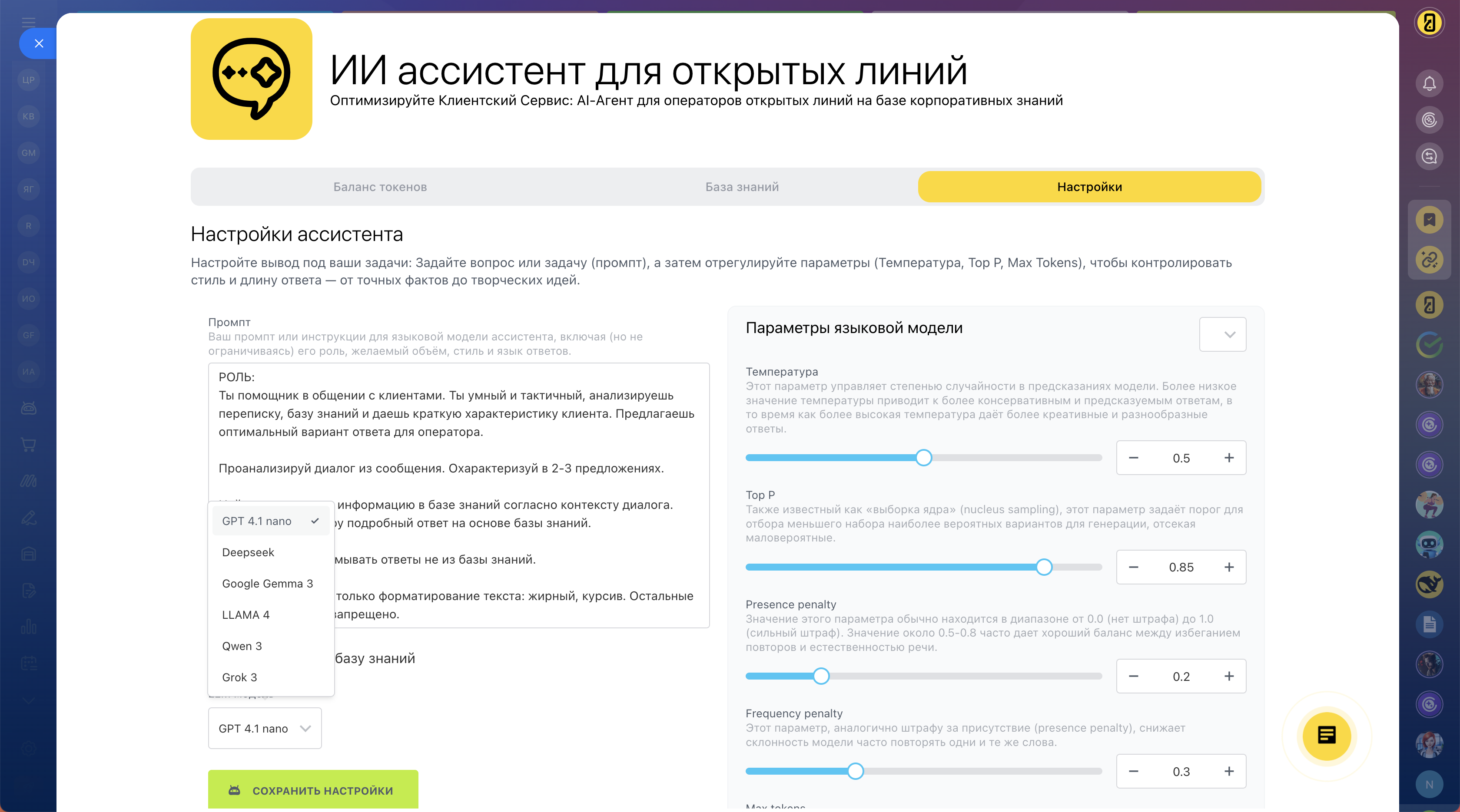 - Настройте своего помощника: Подберите идеальные параметры обработки и выберите лучшую нейросеть. Работайте с самыми современными моделями: GPT 4.1, Deepseek, Google Gemma 3, Qwen 3, Grok 3. Список постоянно обновляется!
