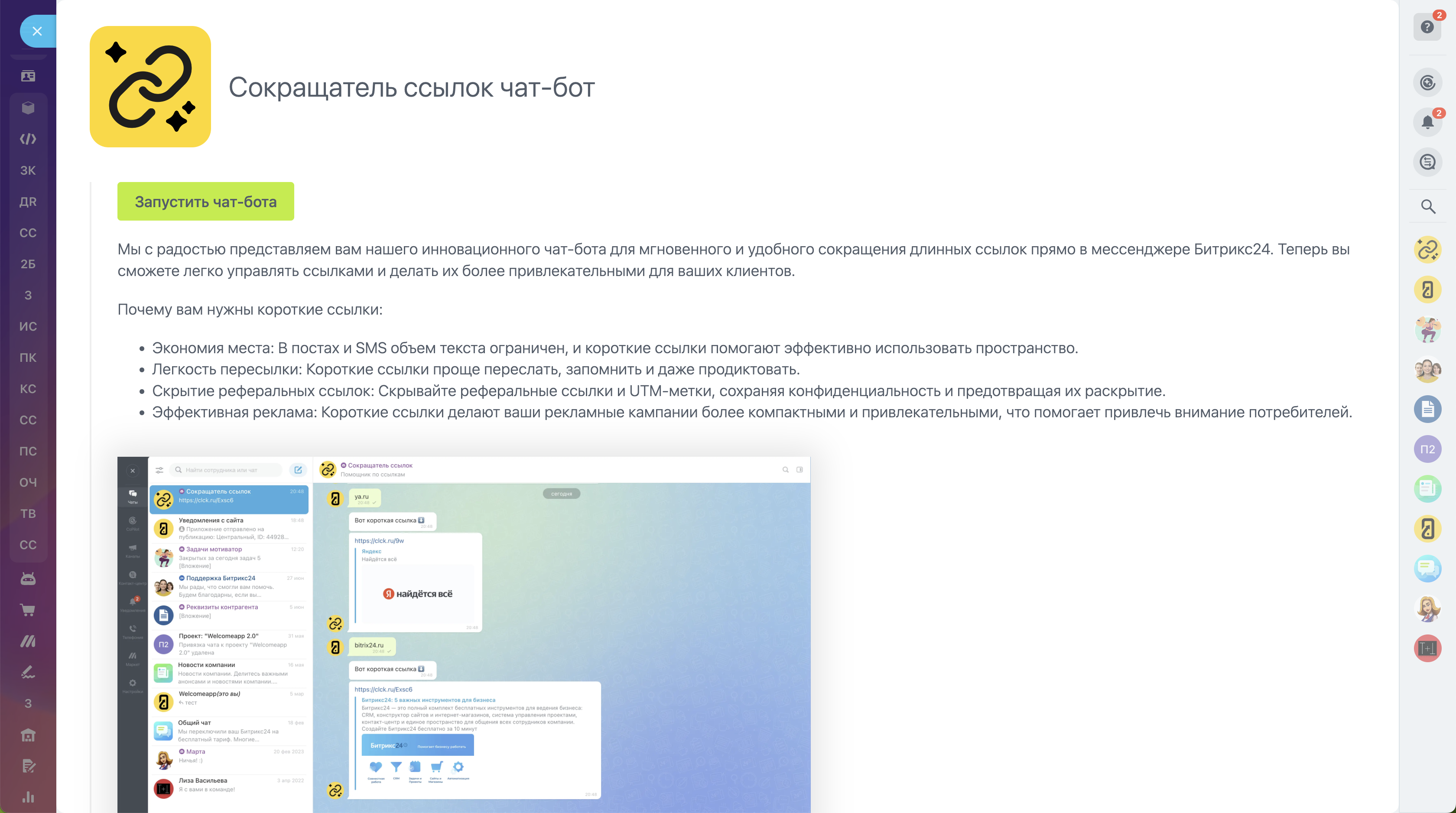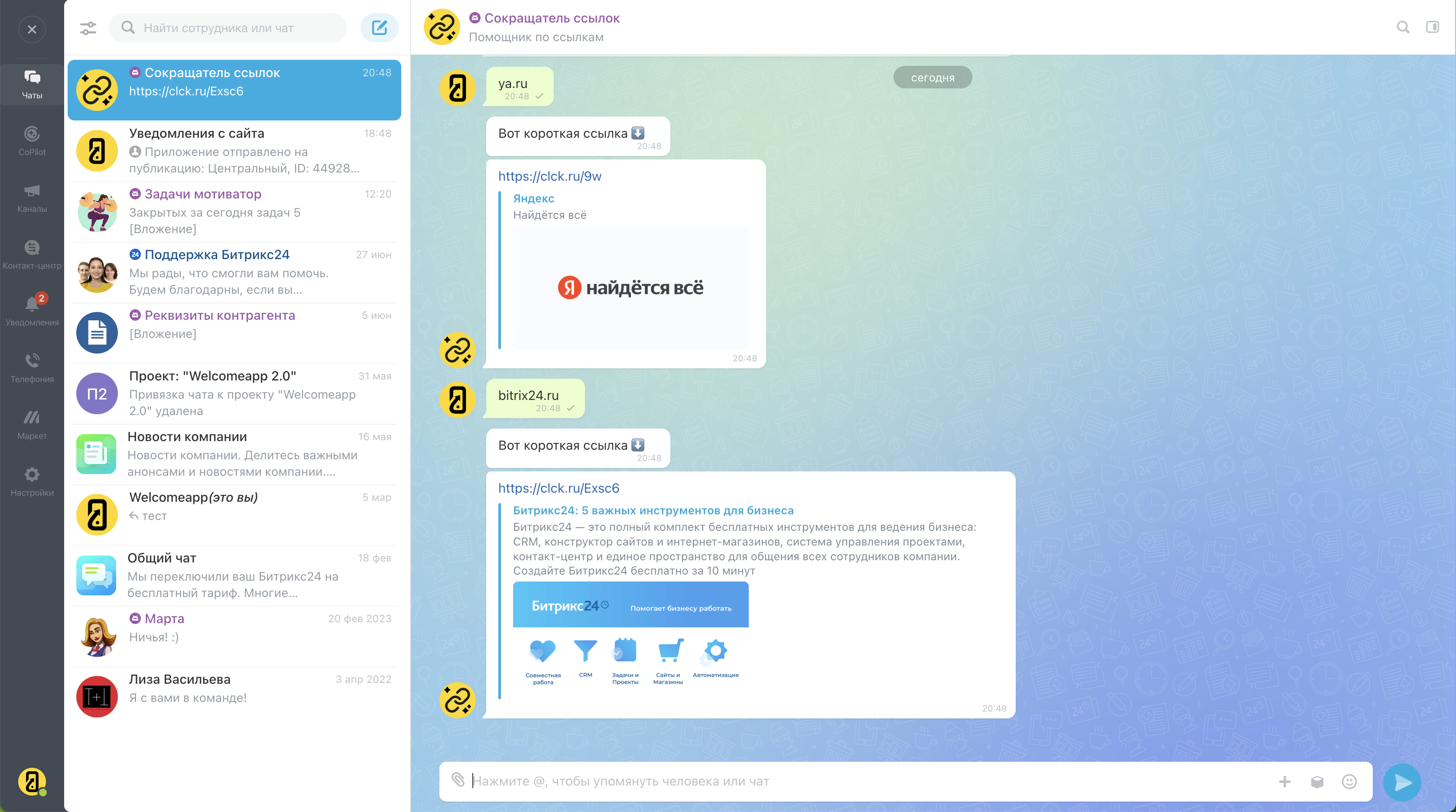 Мы с радостью представляем вам нашего инновационного чат-бота для мгновенного и удобного сокращения длинных ссылок прямо в мессенджере Битрикс24. Теперь вы сможете легко управлять ссылками и делать их более привлекательными для ваших клиентов.