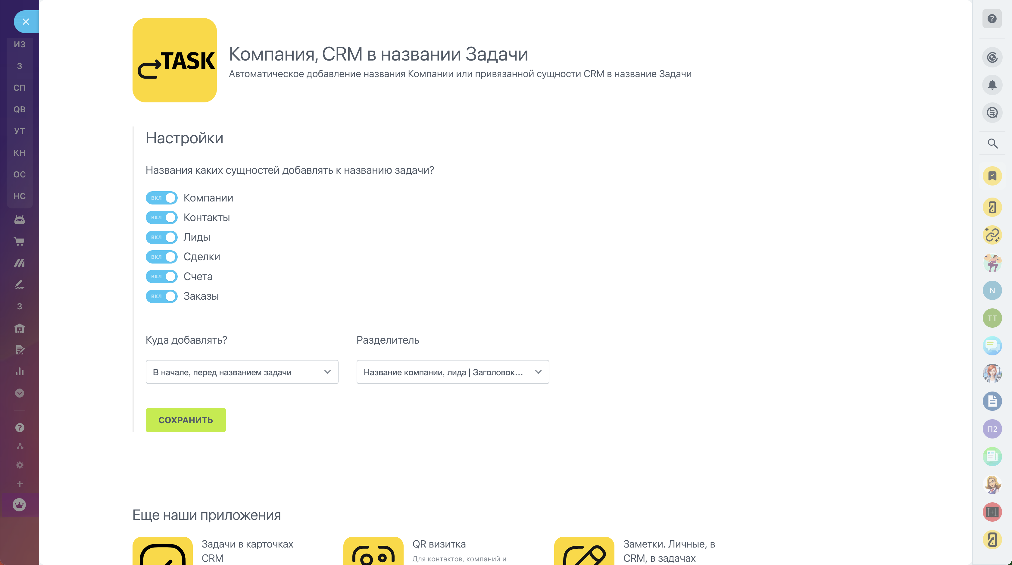 Представляем наше приложение — ваш личный супергерой в мире задач и CRM! С ним вы забудете о хаосе в задачах типа "Подготовить КП" или "Выставить счет". Теперь каждое задание будет как на ладони, ведь наше приложение автоматически добавляет к названию задачи названия привязанных CRM сущностей: Компании, Контакта, Лида, Сделки, Счета, Заказа.
