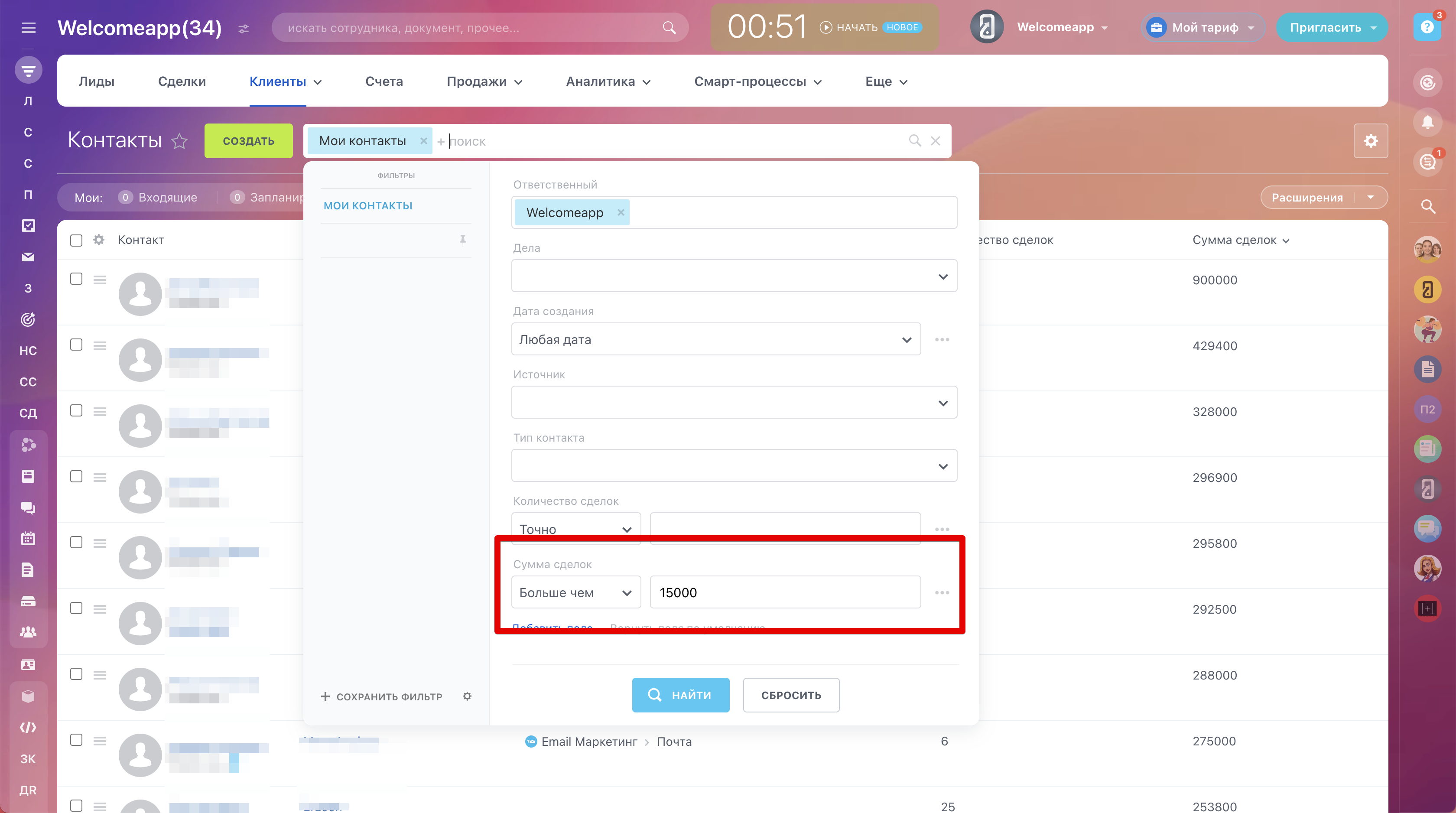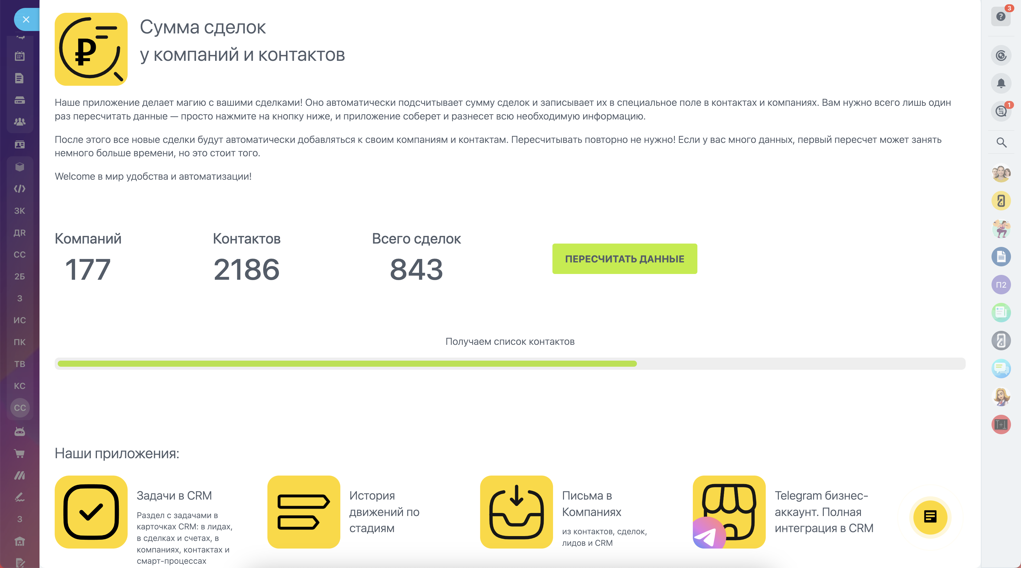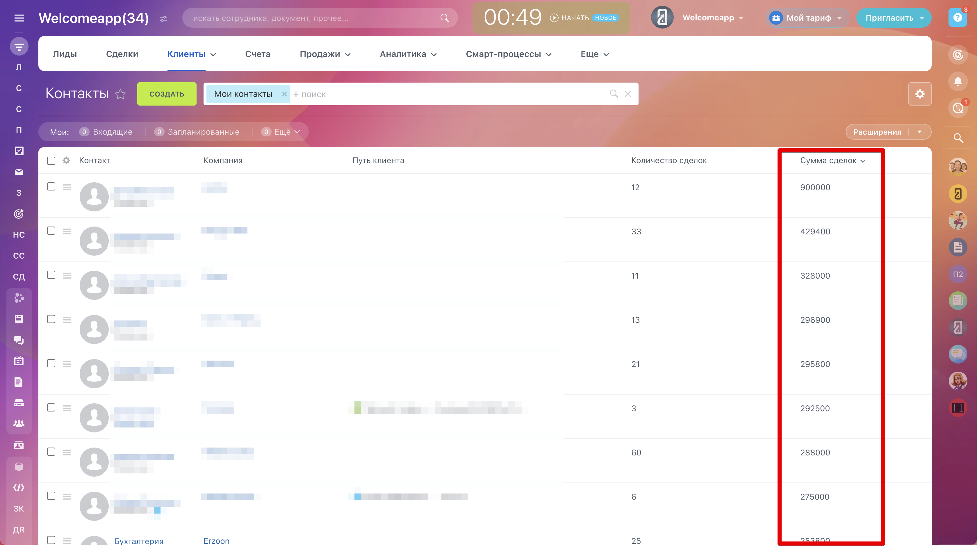 Наше приложение создает специальное поле у контакта и компании, где записывает сумму сделок с ними. Теперь на стандартных страницах списка компаний и контактов в Битрикс24 вы сможете видеть всю нужную информацию. Вы также можете использовать это поле в фильтрах, выводить его в карточку контакта или компании и применять для автоматизации в роботах и триггерах.