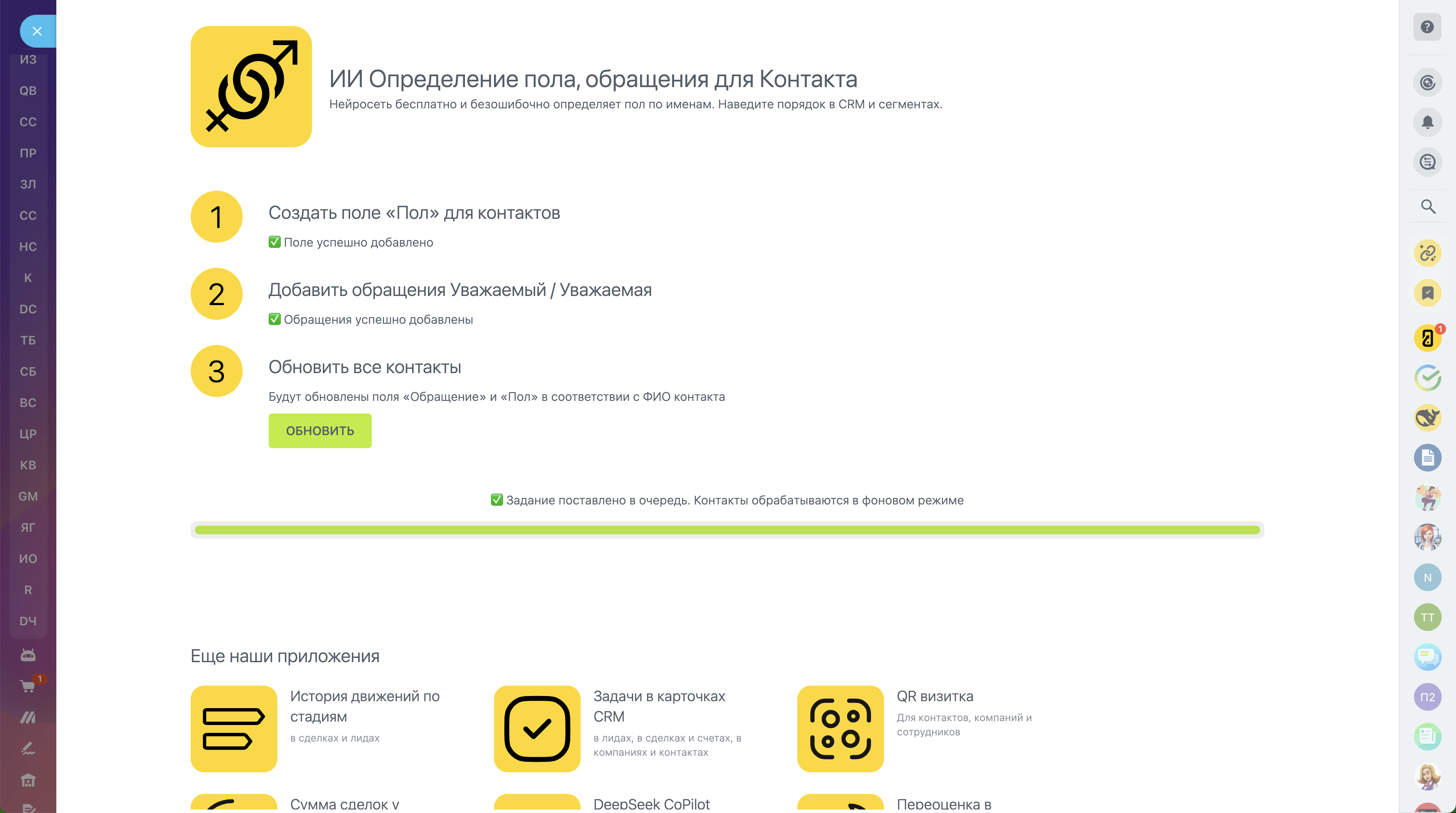 Запустите фоновый процесс, который заполнит поля «Пол» и «Обращение» у всех контактов в CRM за несколько кликов. Больше не нужно править данные вручную! - Автообновление в реальном времени