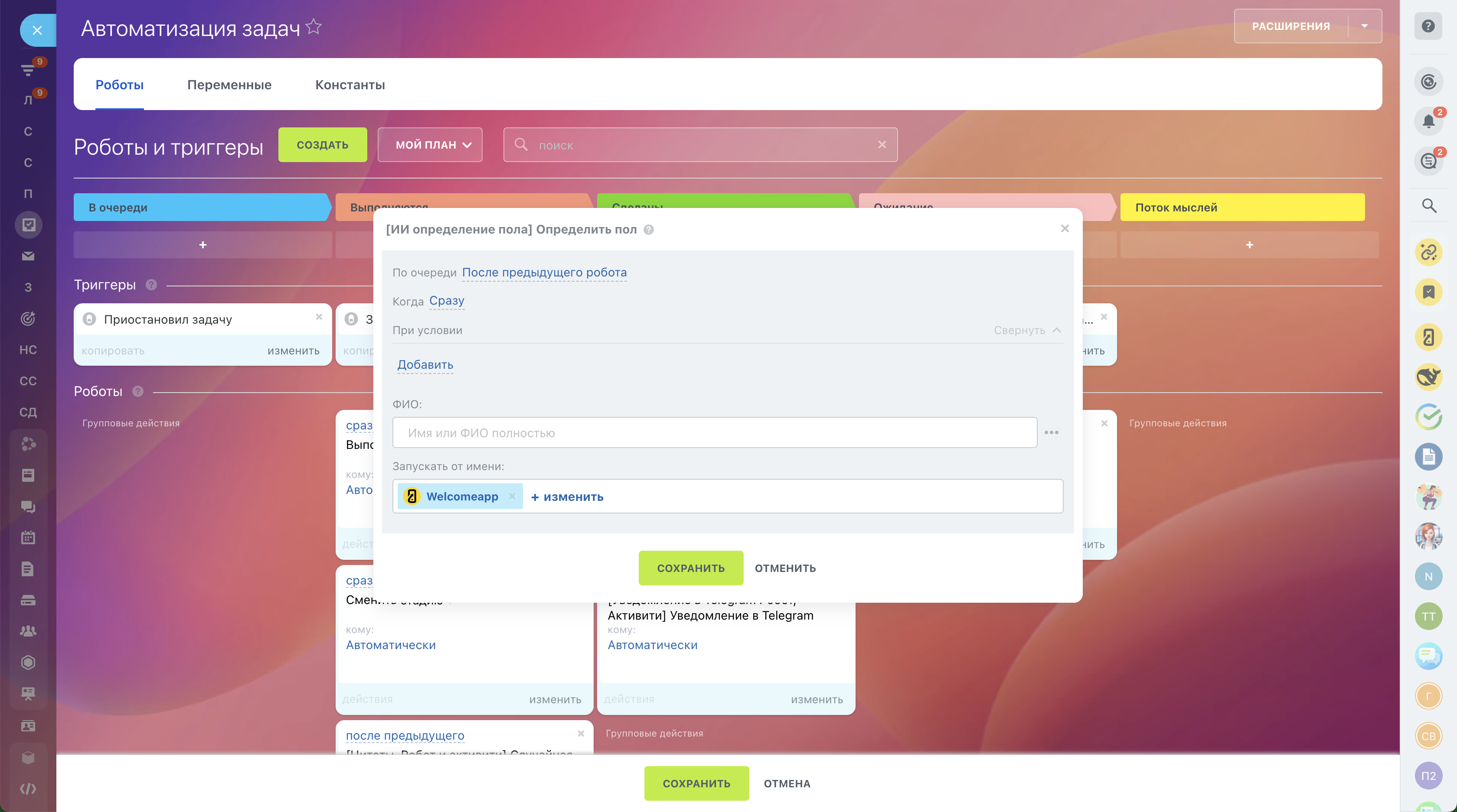Приложение само следит за новыми контактами и изменениями. Как только данные обновляются — поля «Пол» и «Обращение» моментально заполняются. Ваша CRM всегда актуальна! - Робот и активити бизнес-процессов для мгновенного определения