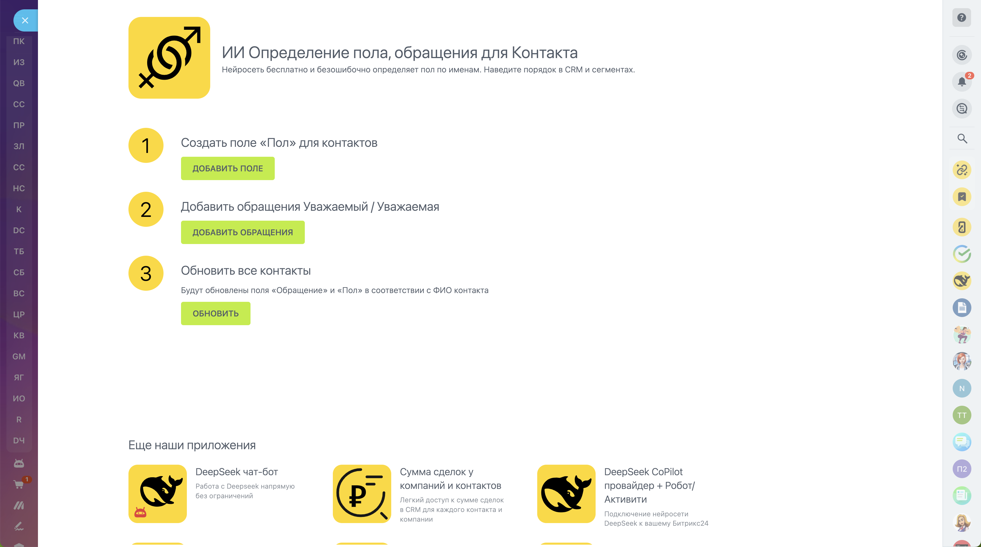 Автоматизируйте сегментирование клиентов и персонализируйте коммуникации без лишних усилий! Наше приложение анализирует имя контакта с использованием искусственного интеллекта, чтобы определить пол и правильно оформить обращение. Никаких скрытых платежей, токенов или сложных настроек — только точность и экономия вашего времени! ИИ определяет имена в любом формате, даже написанные транслитом!