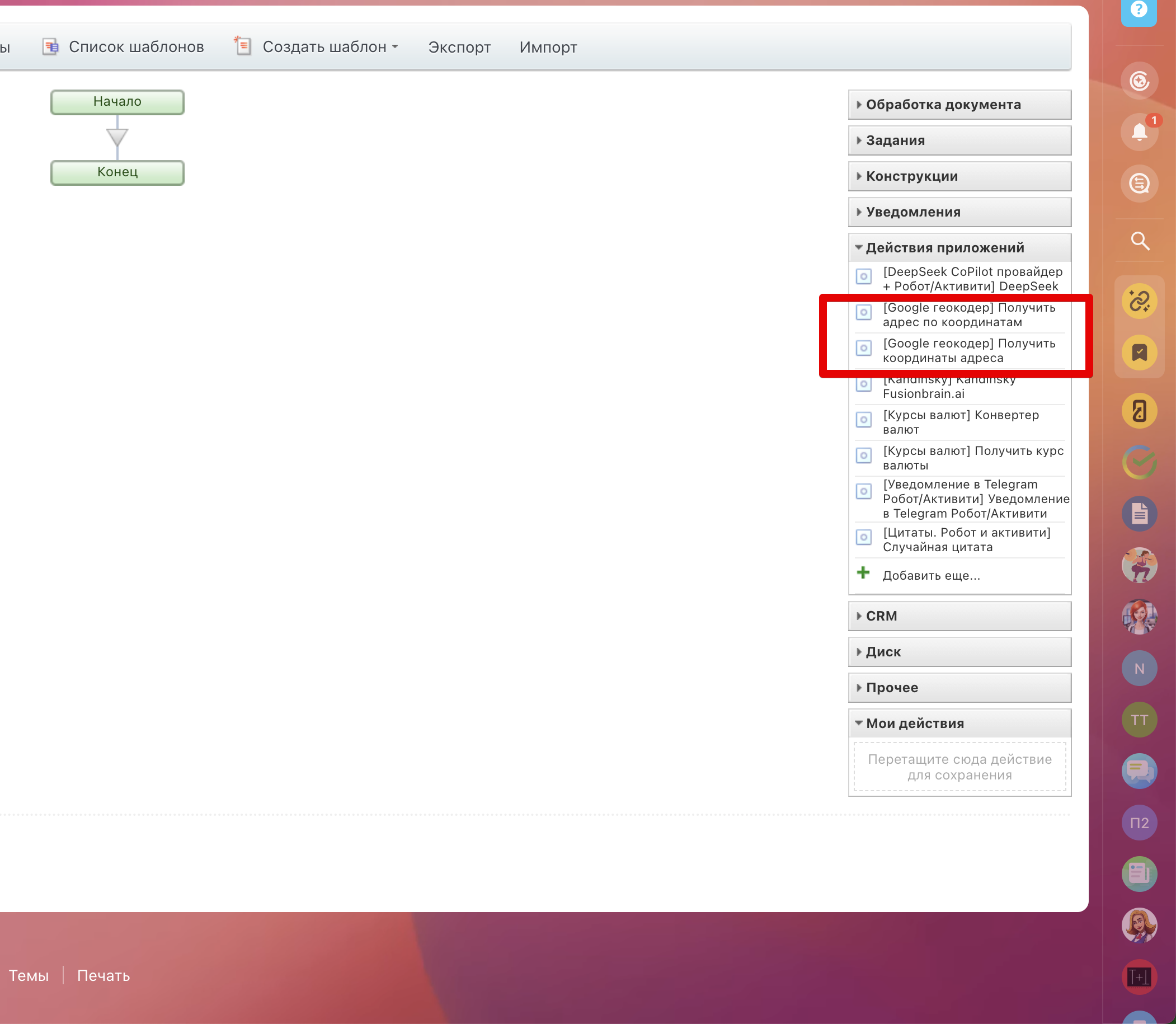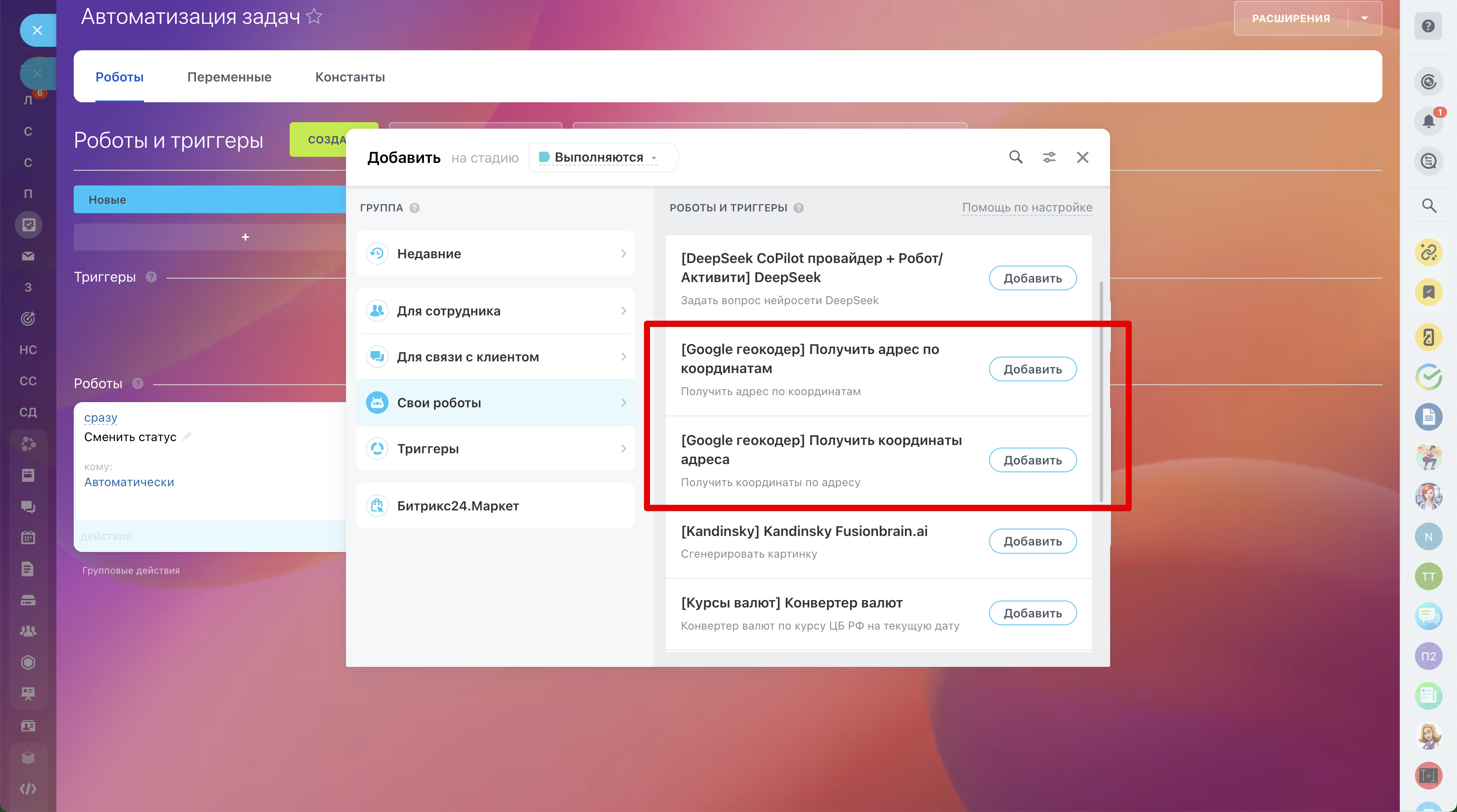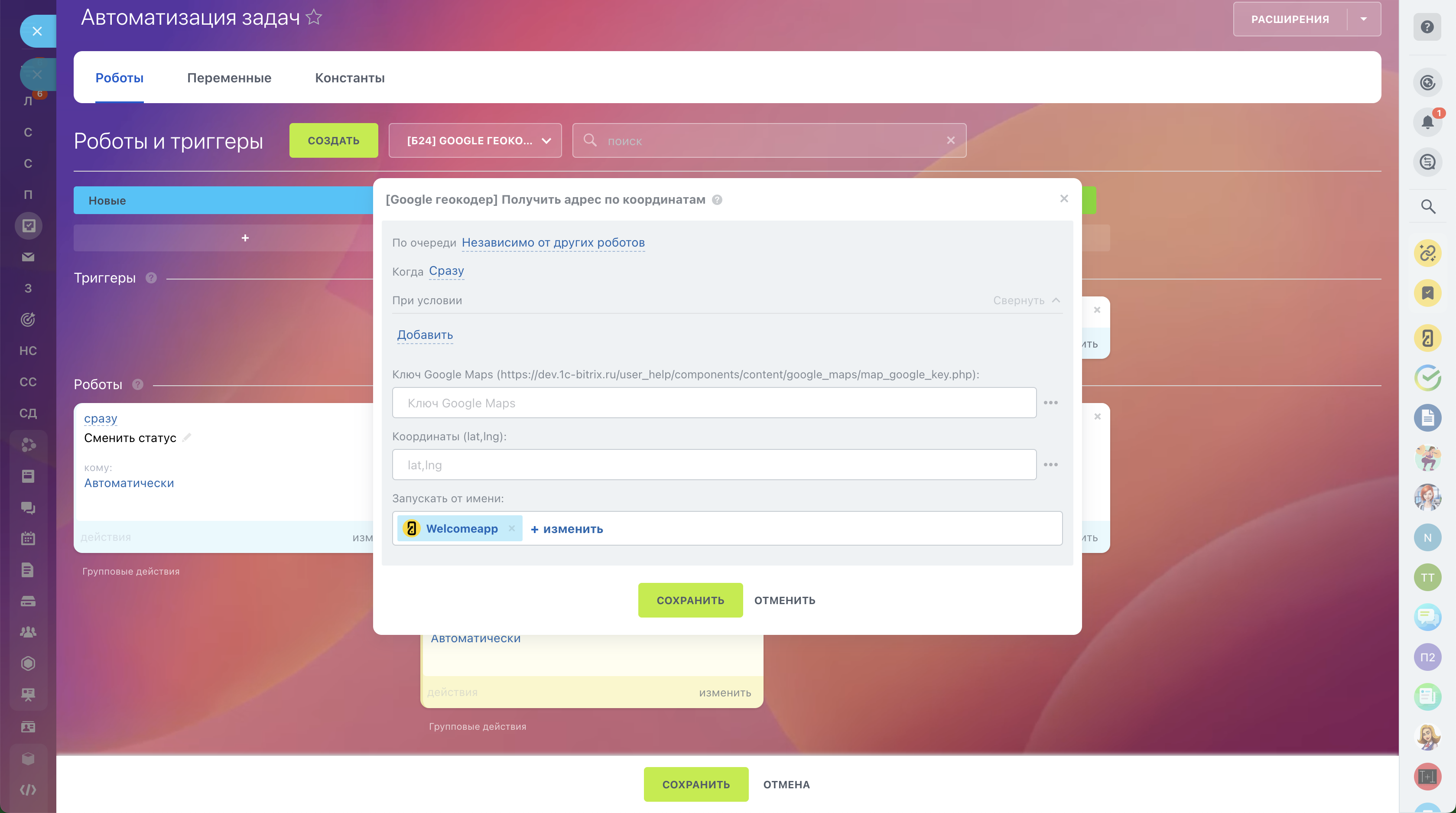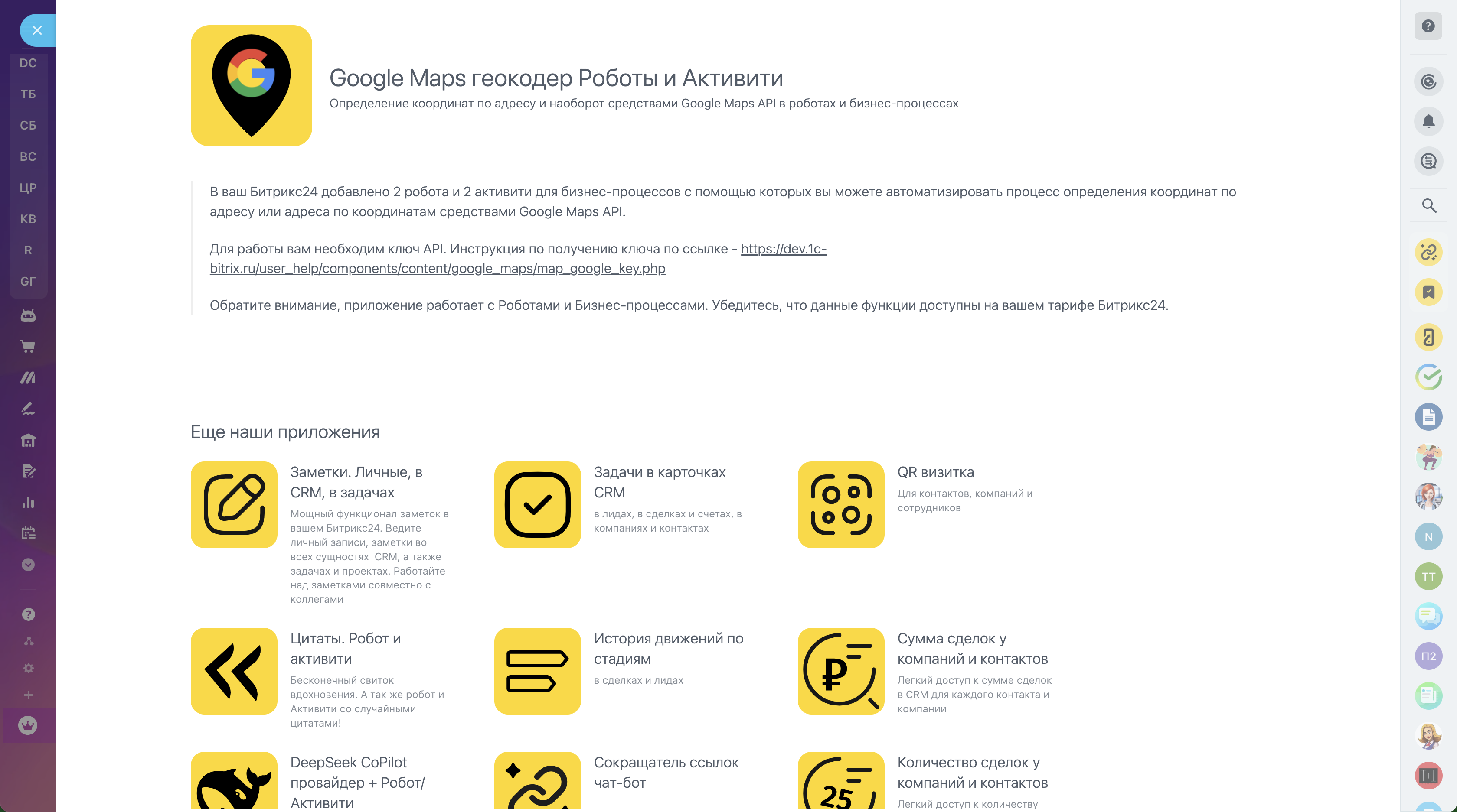 Наше приложение расширяет функционал CRM Битрикс24, добавляя два робота и два активити для бизнес-процессов. С их помощью вы можете автоматизировать преобразование адресов в географические координаты и координат в адреса, используя Google Maps API.