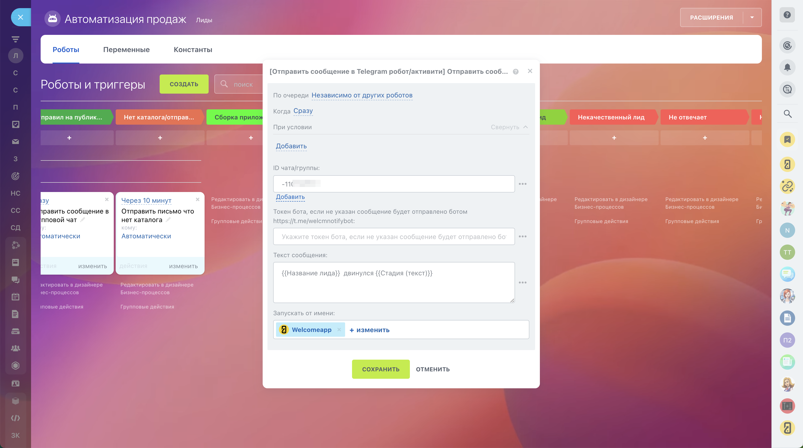 - Мгновенные уведомления: Настройте отправку важных сообщений себе или своей команде без лишних усилий стандартным функционалом Битрикс24.