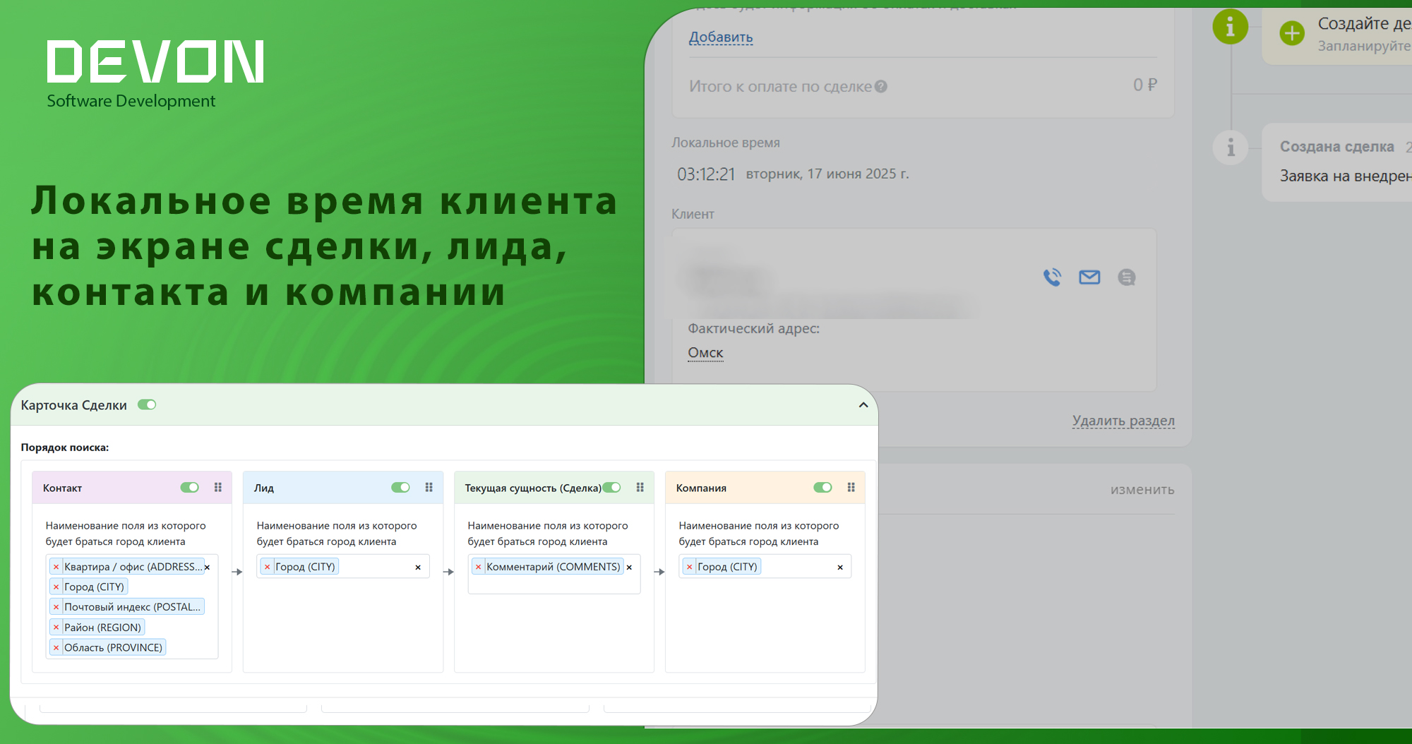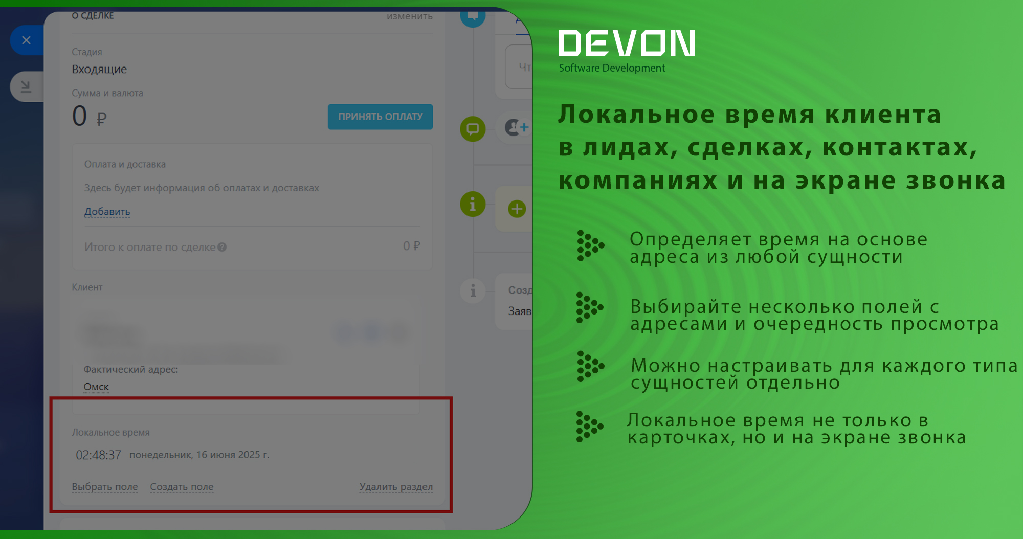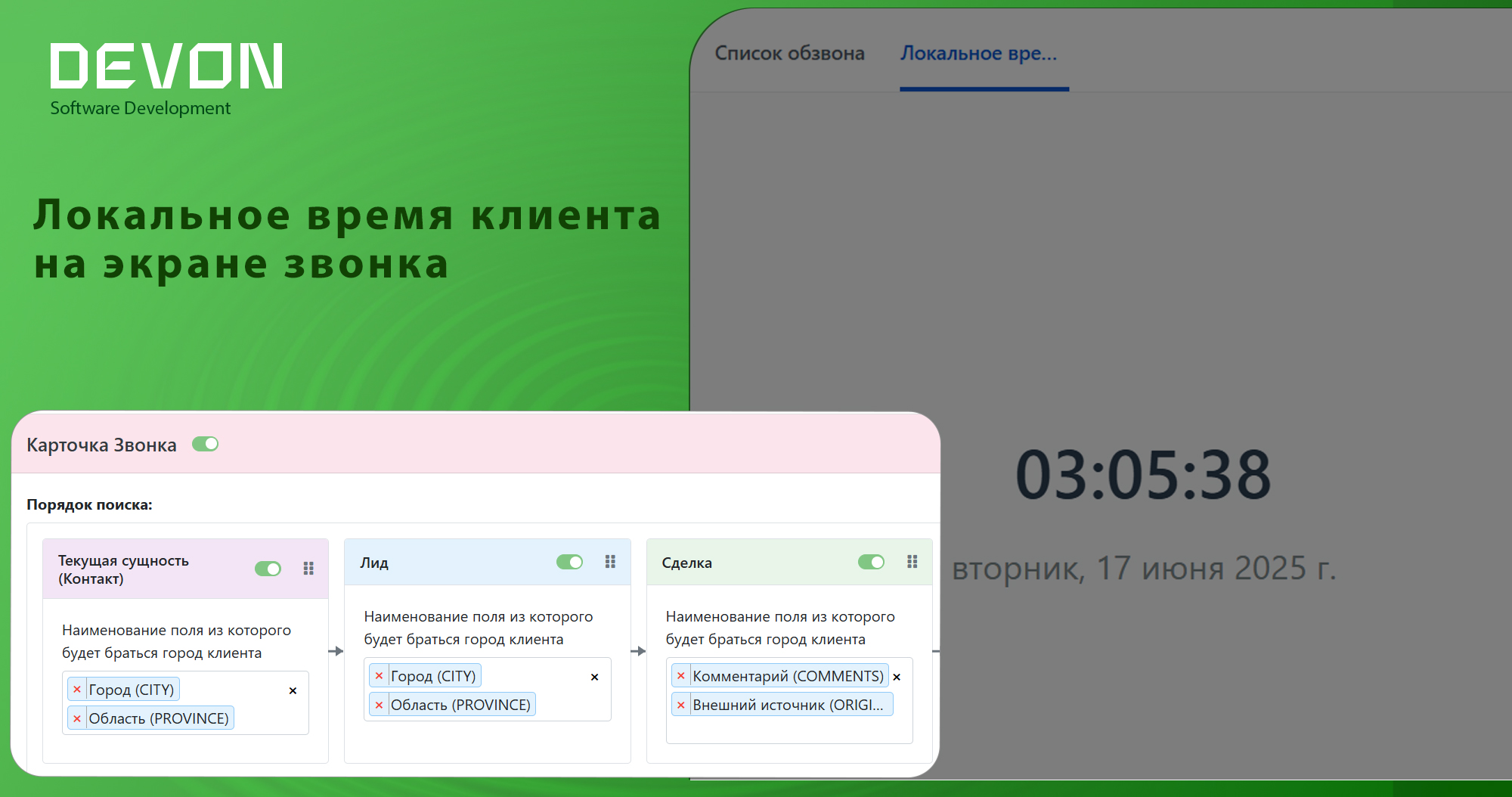 Покажи время в городе клиента прямо в карточке или на форме звонка
