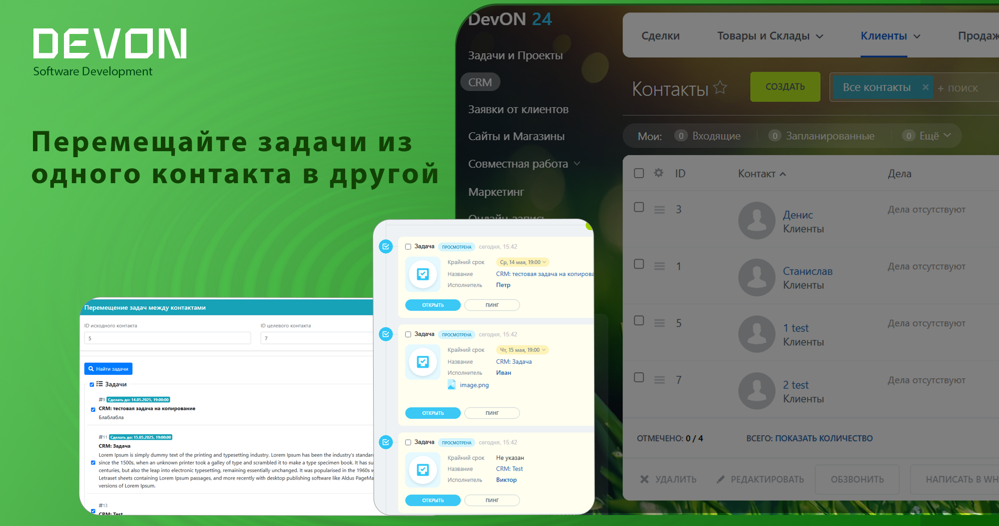 Легко перемещайте задачи из одного контакта в другой вручную. Можно встроить в бизнес-процесс.