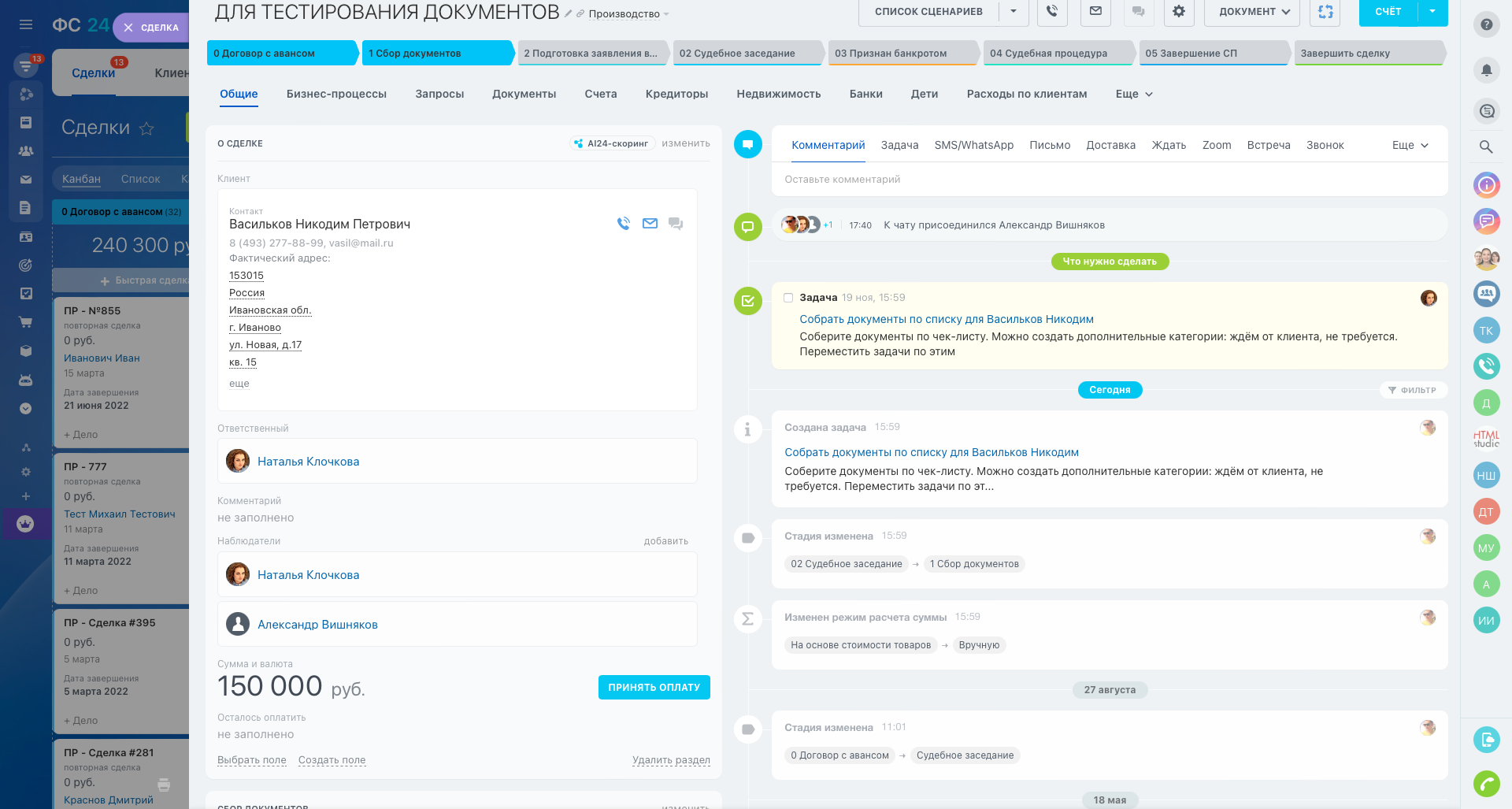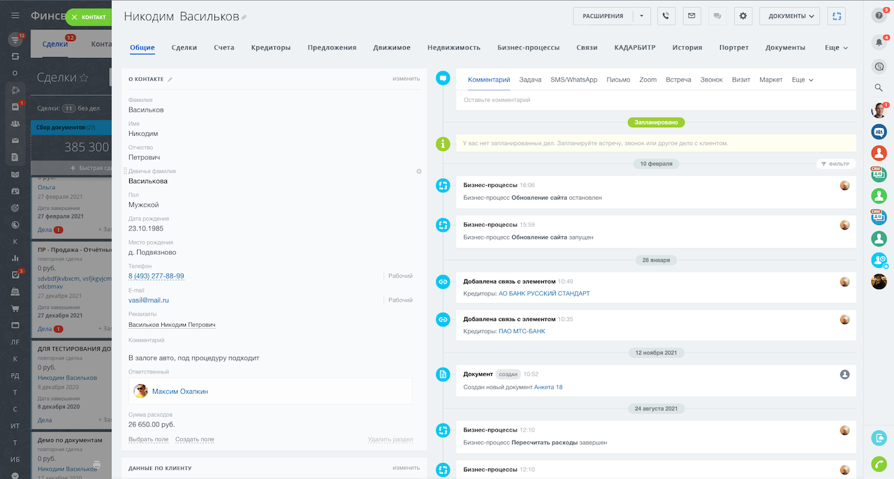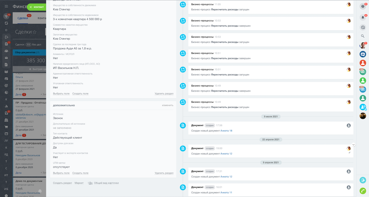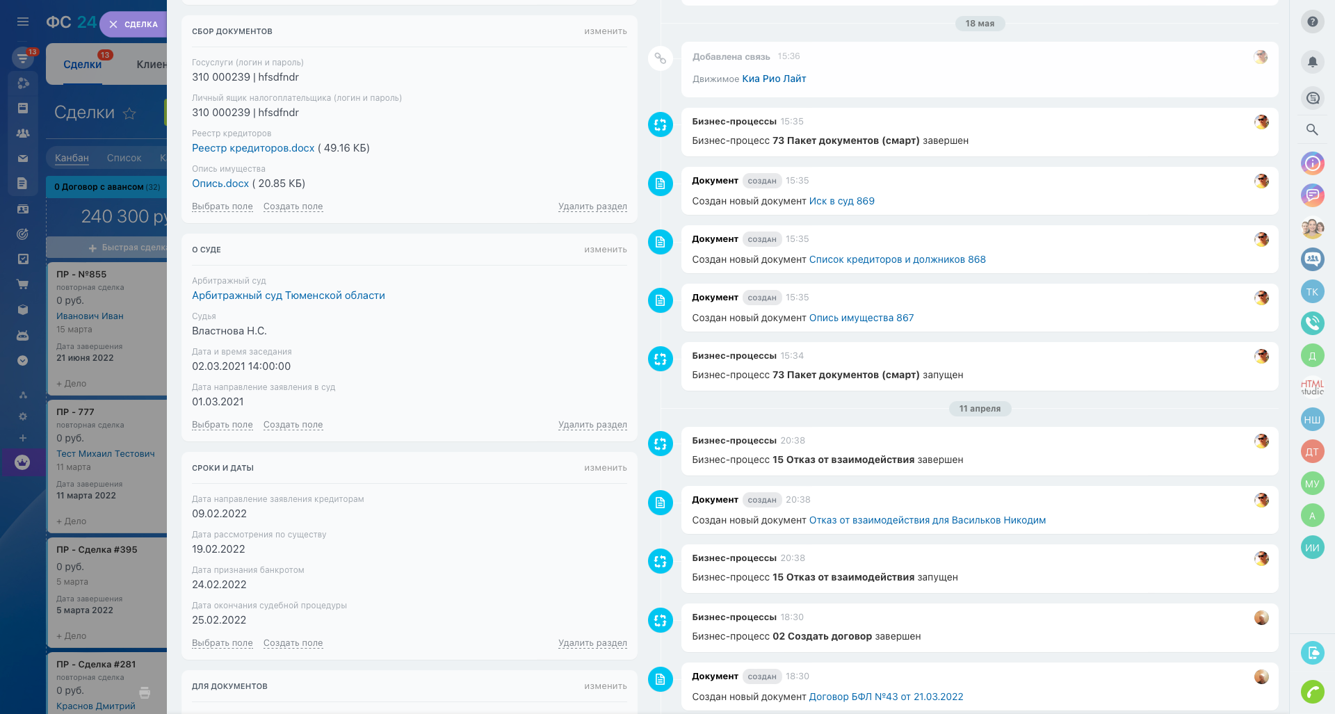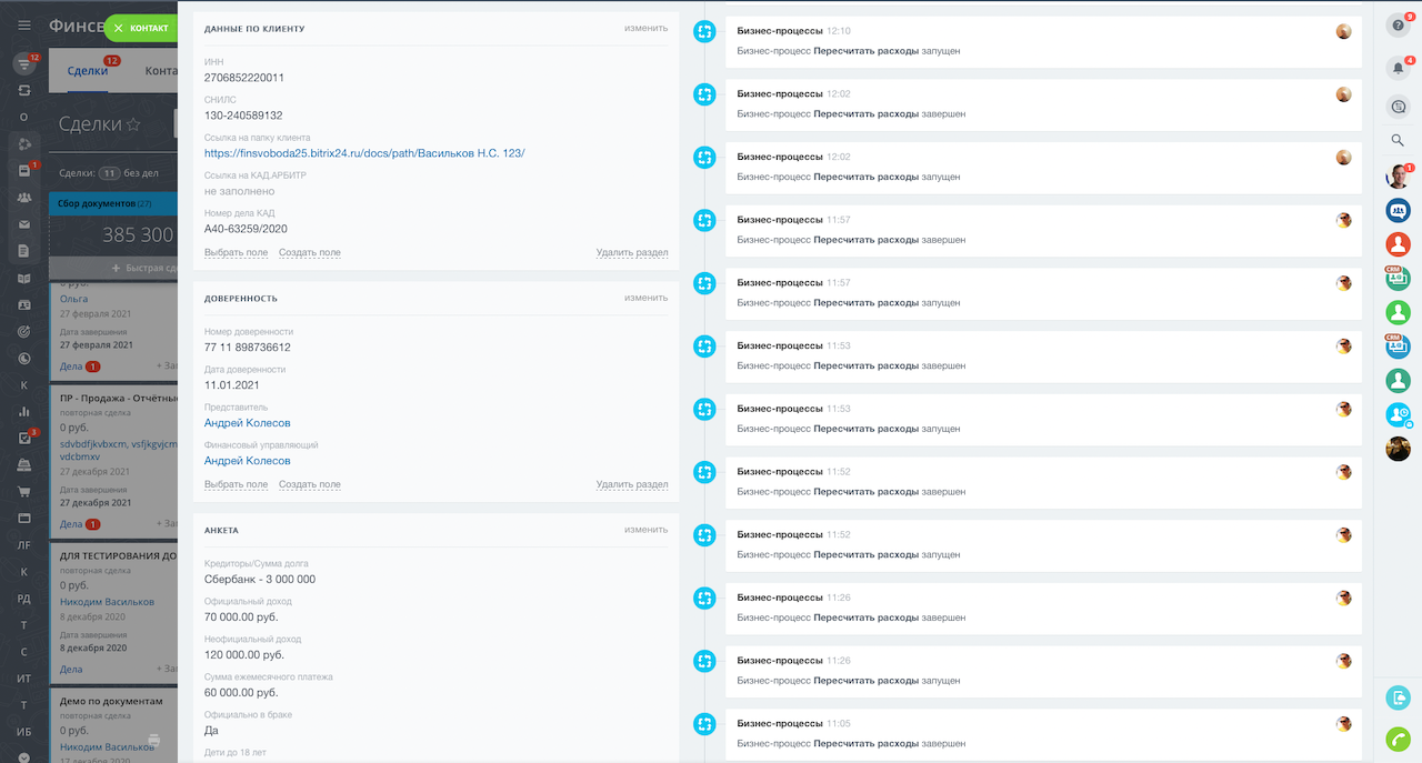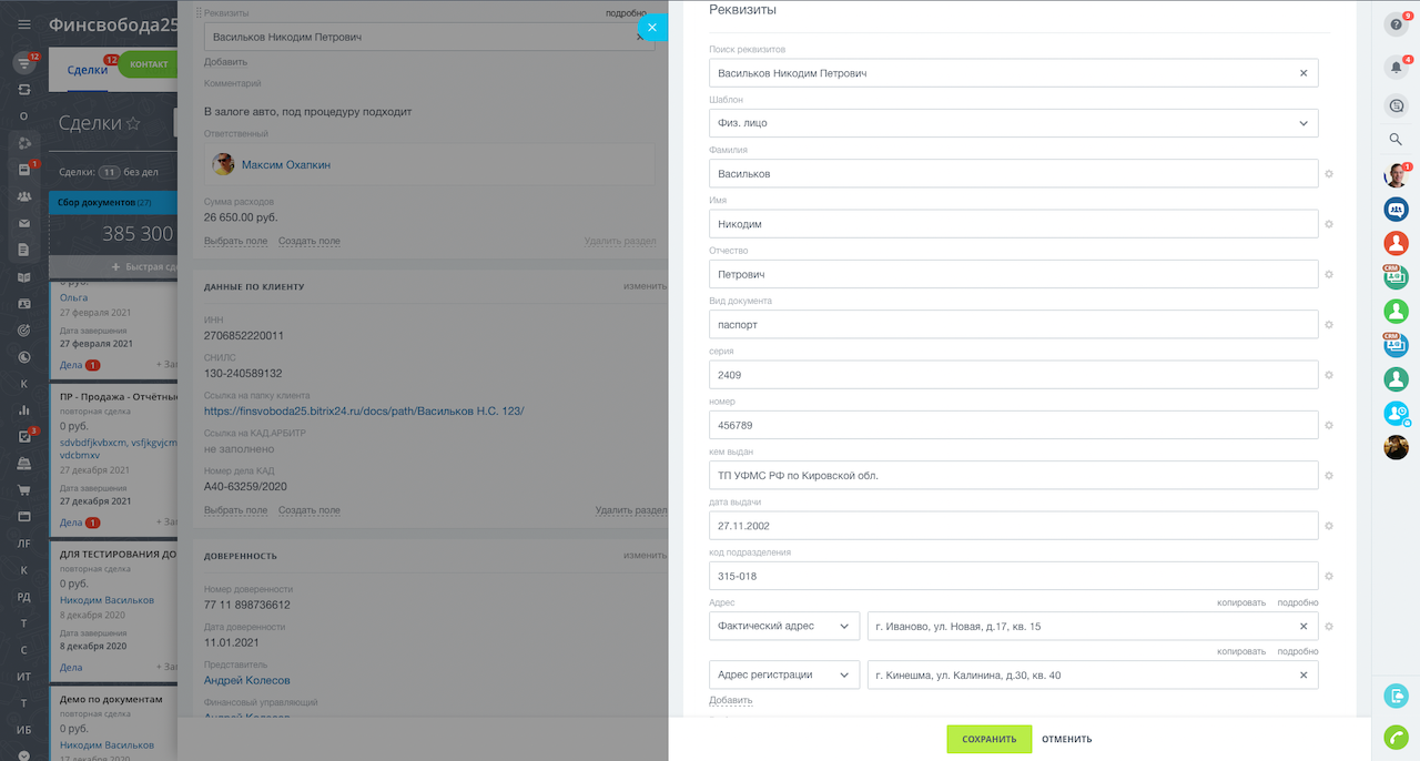 Разработаны специальные поля для хранения важной информации по клиенту. На основании этих полей можно создавать документы (договор, счёт, ПКО, опись, заявление к кредиторам и д.р.). В Битрикс24 есть диск, на нём создаётся папка с привязкой к клиенту, теперь документы можно безопасно хранить в одном месте. - Создание шаблонных юридических документов.
