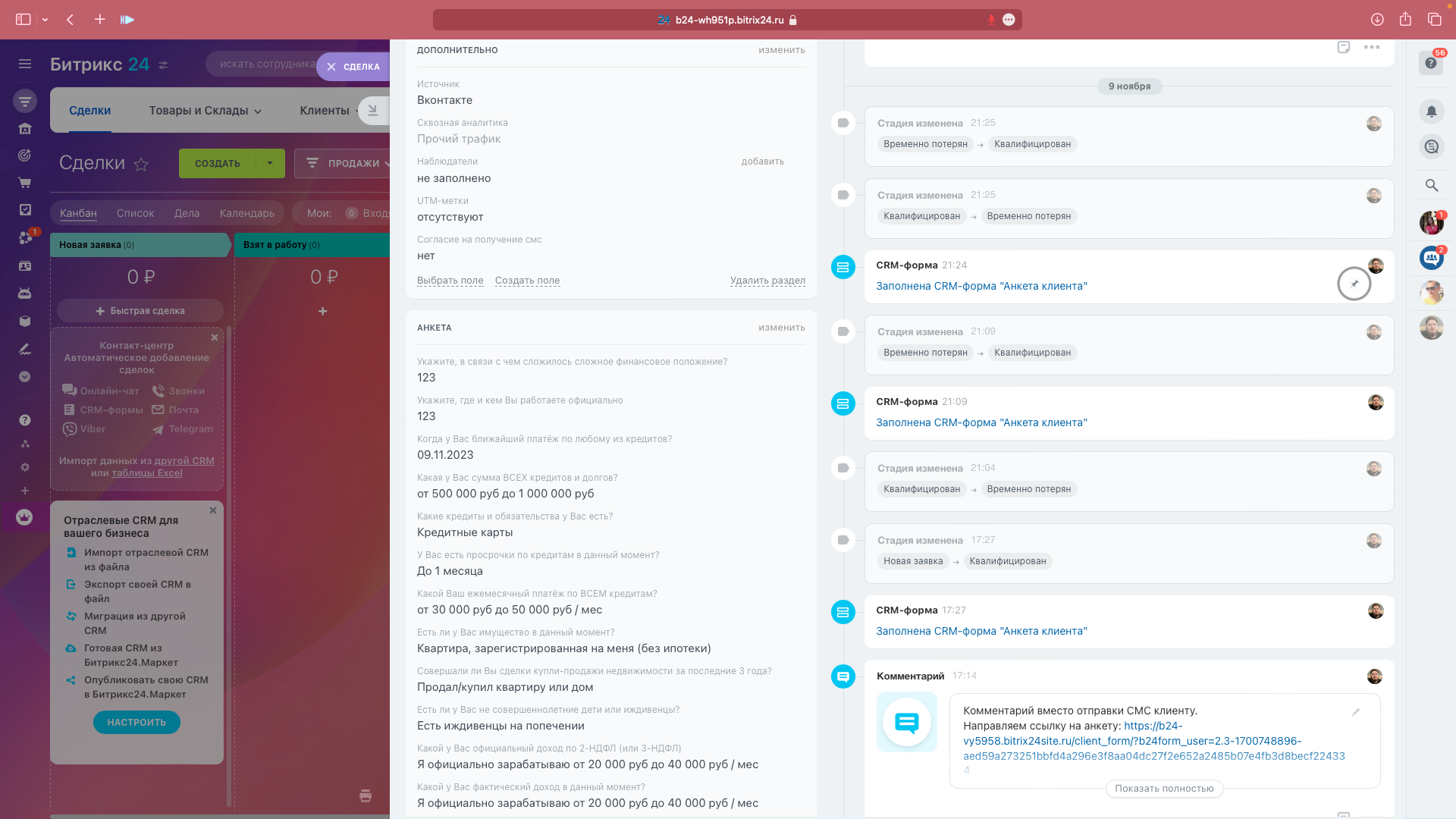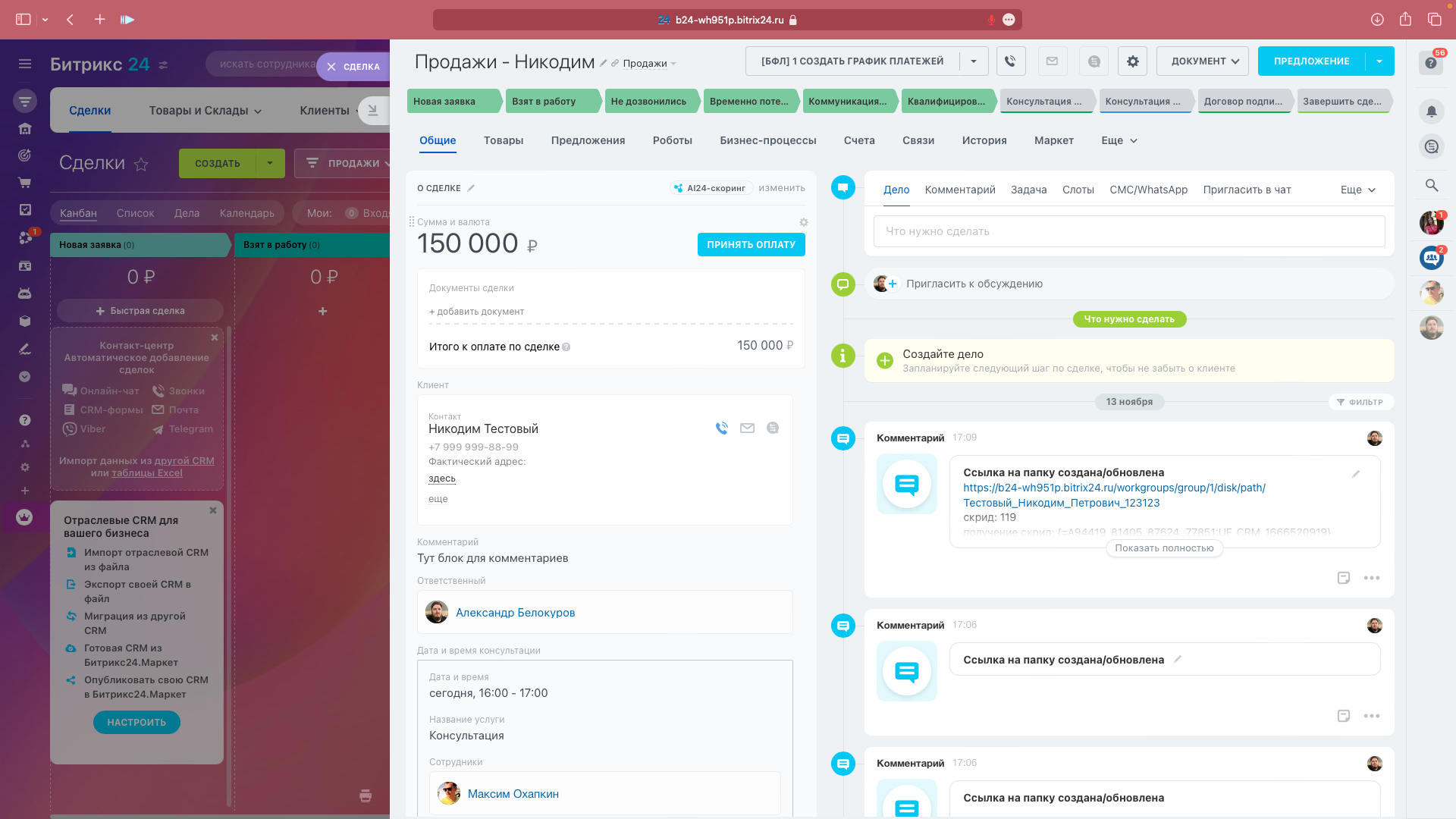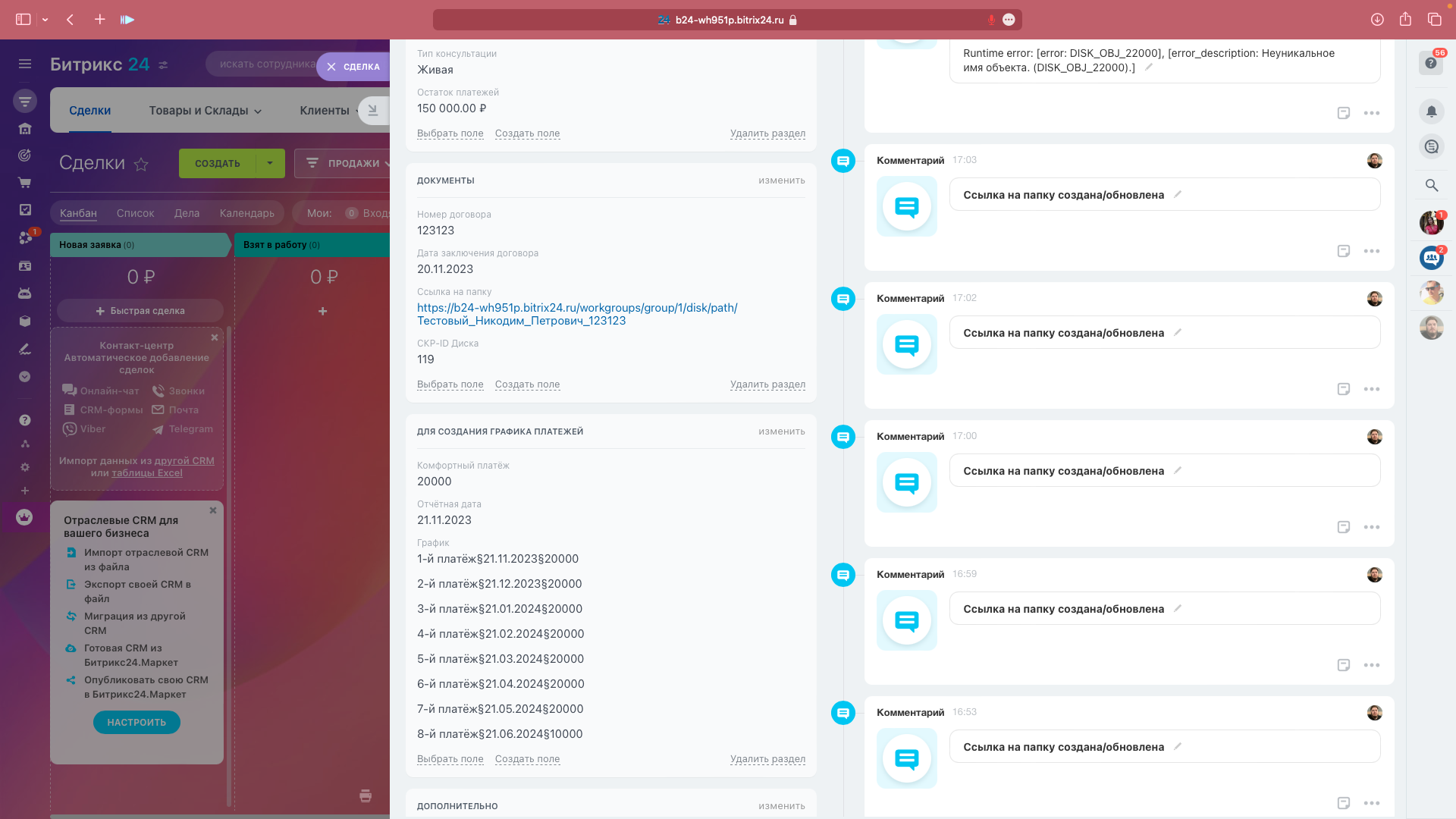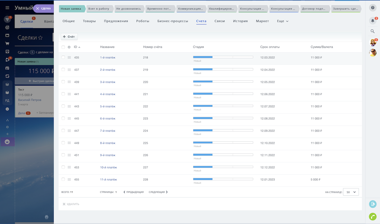Задействован инструмент счетов в Битрикс24. Счёт = платёж по графику. В счетах есть срок оплаты и статус (оплачен или нет). В вкладке счета удобно контролировать оплаты, можно построить отчёт по дебиторской задолженности как по клиентам, так и по менеджерам. - Общее пространство для хранения информации по клиенту.