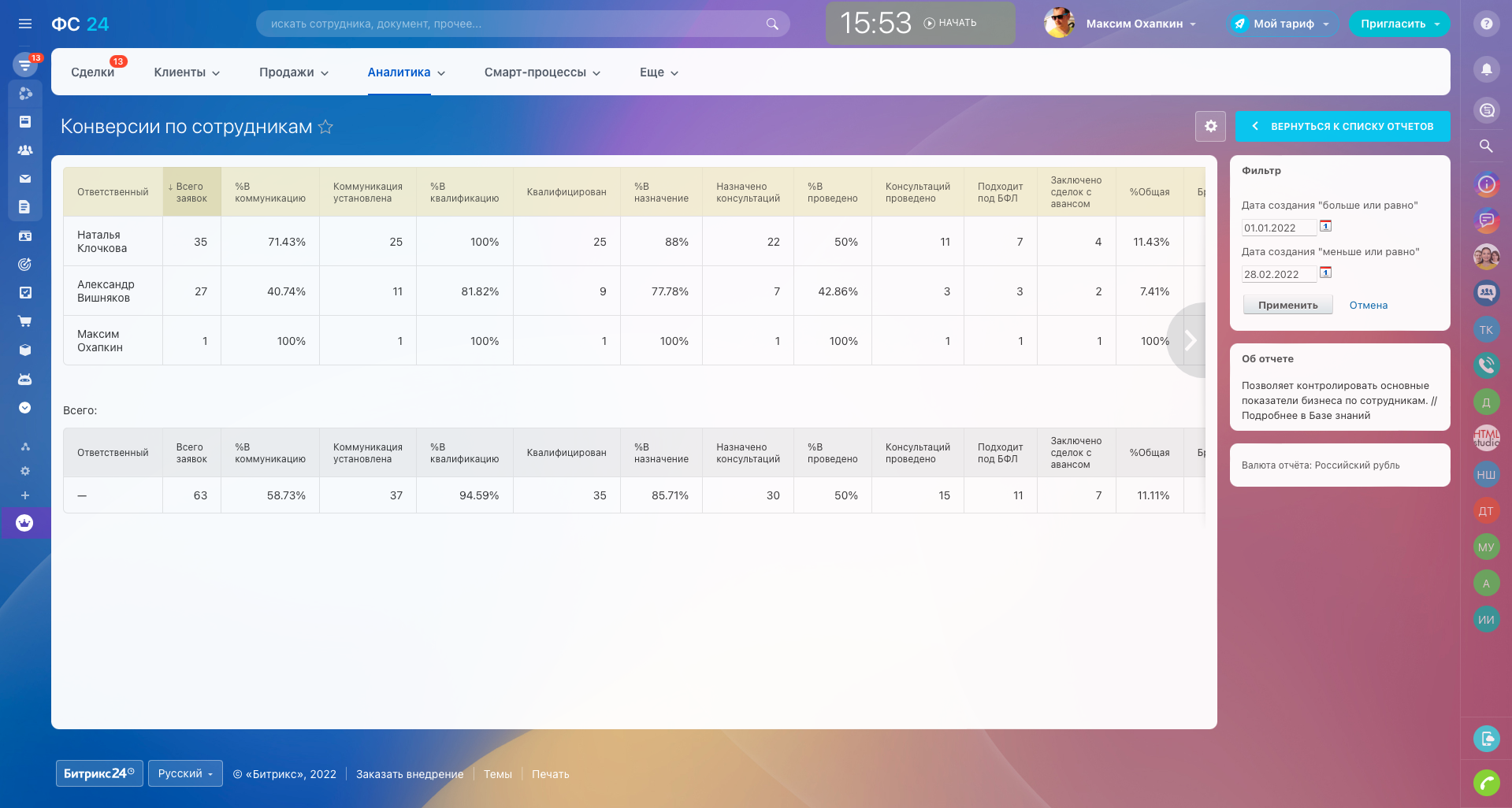 - Конверсии по сотрудникам - Показывает конверсии из стадии в стадию в разрезе сотрудников.