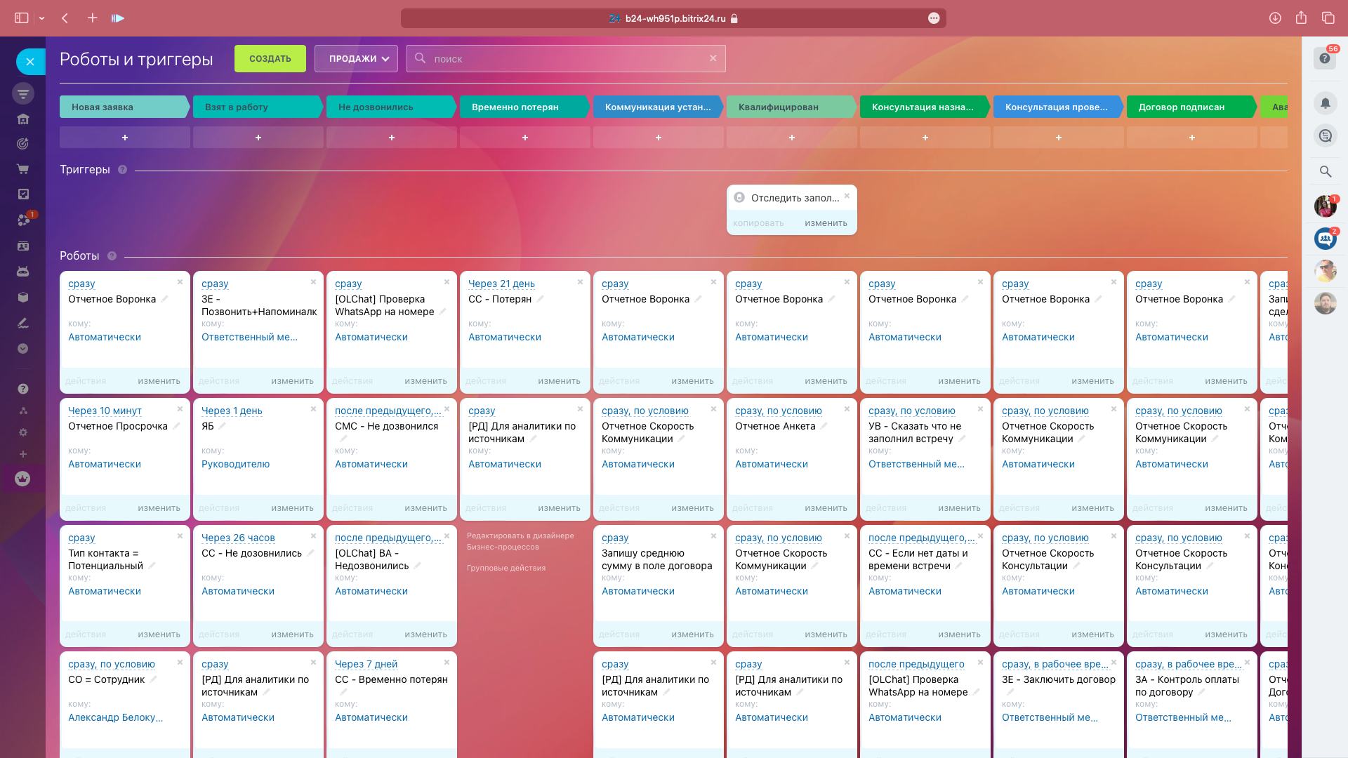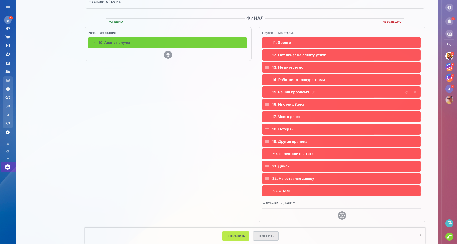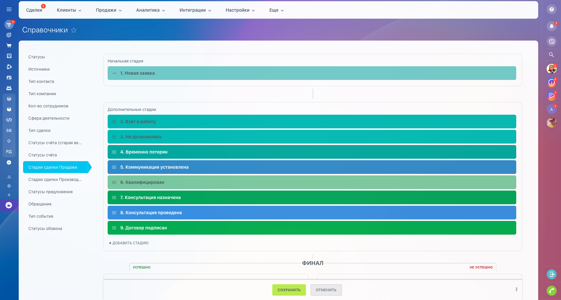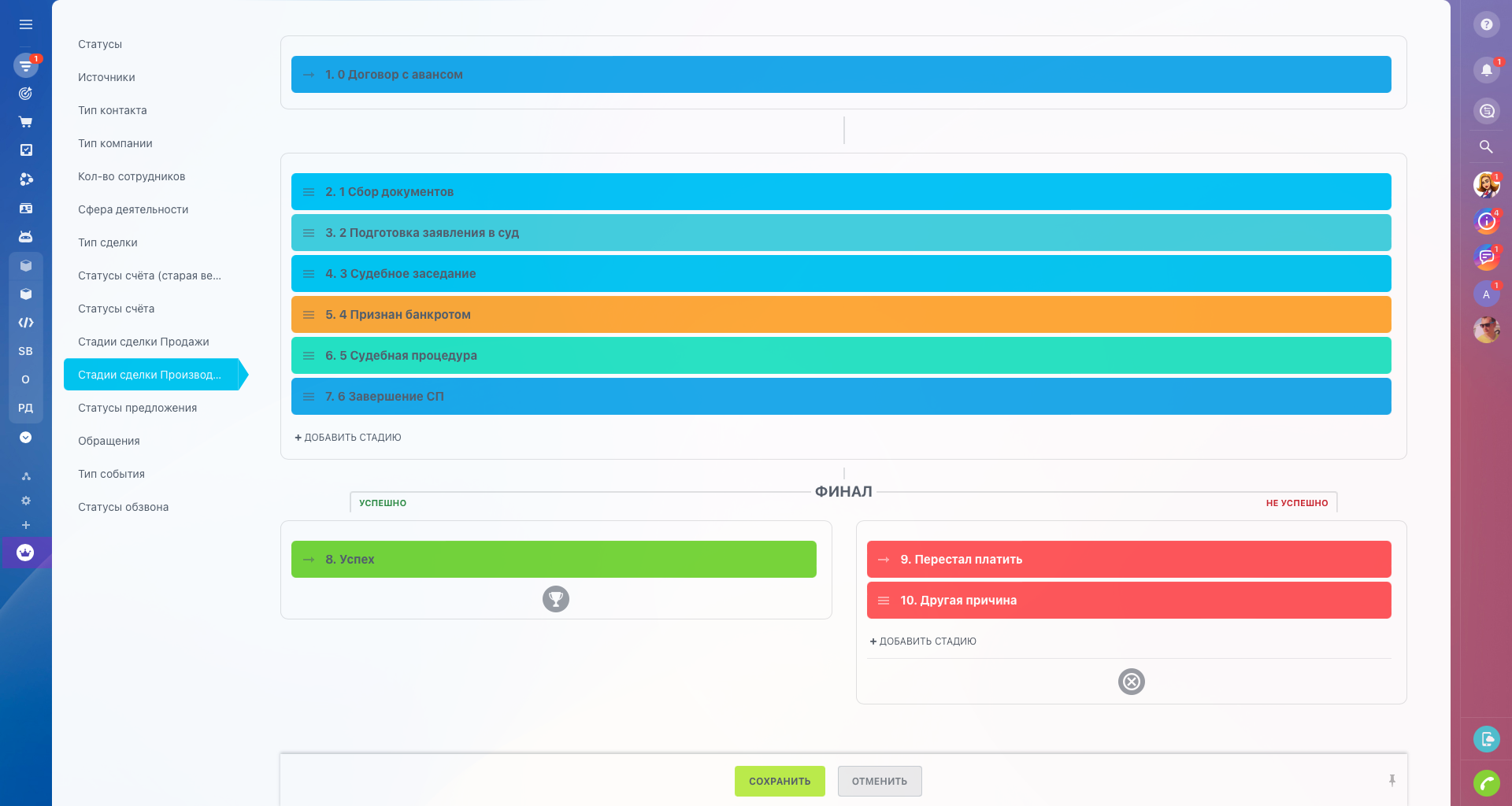 - Продажи: Новая заявка, Взят в работу, Не дозвонились, Временно потерян, Коммуникация установлена, Квалифицирован, Консультация назначена, Консультация проведена, Договор подписан, Аванс получен (Победа), Сделка провалена (Дорого, Нет денег на оплату услуг, Не интересно, Работает с конкурентами, Решил проблему, Ипотека/Залог, Много денег, Потерян, Другая причина, Перестал платить, Дубль, Не оставлял заявку, СПАМ).