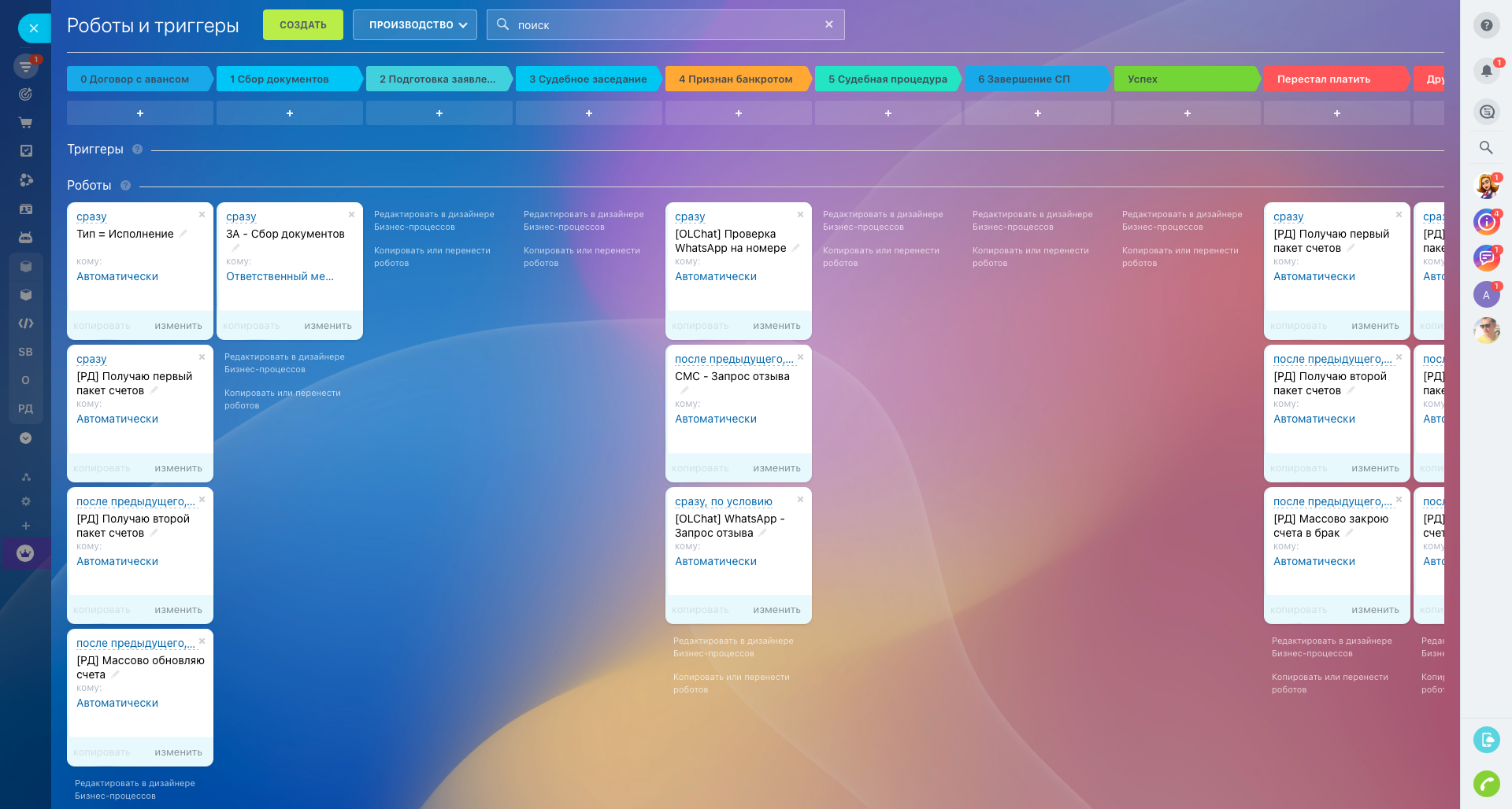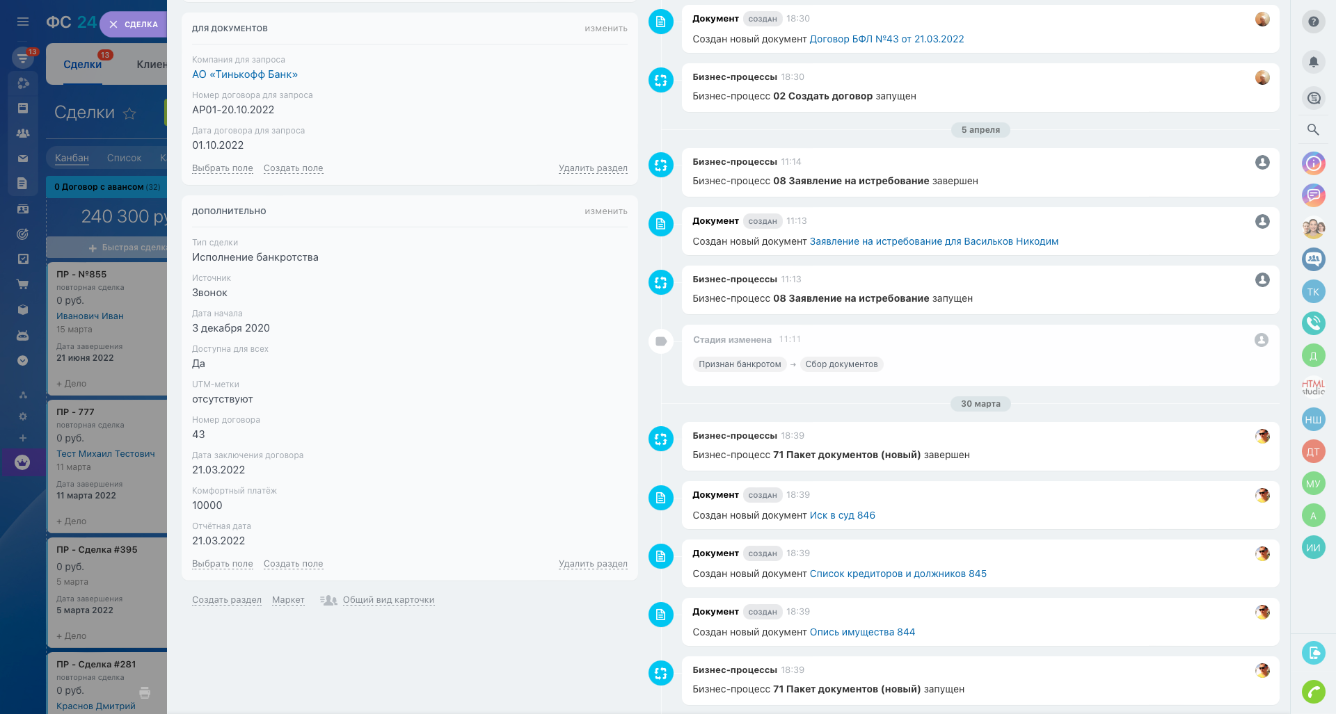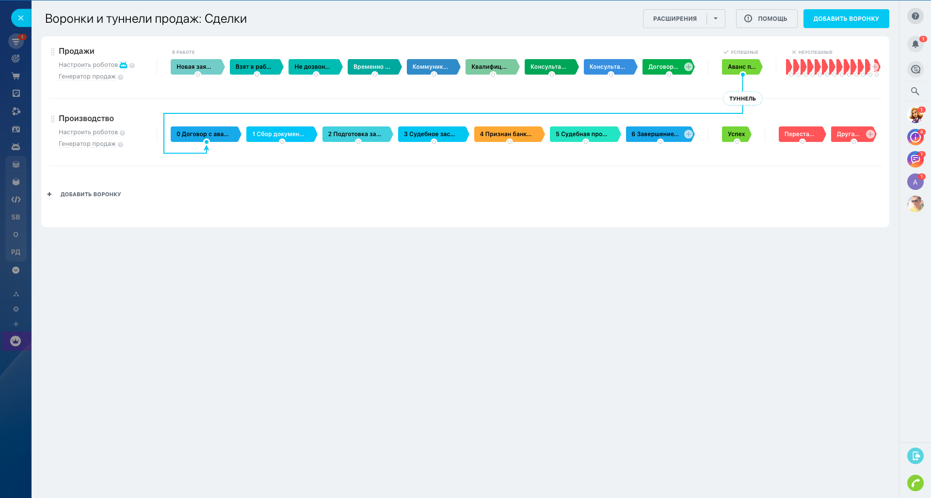 - Производство: 0 Договор с авансом, 1 Сбор документов, 2 Подготовка заявления в суд, 3 Судебное заседание, 4 Признан банкротом, 5 Судебная процедура, 6 Завершение СП, Упех, Сделка провалена (Перестал платить, Другая причина).