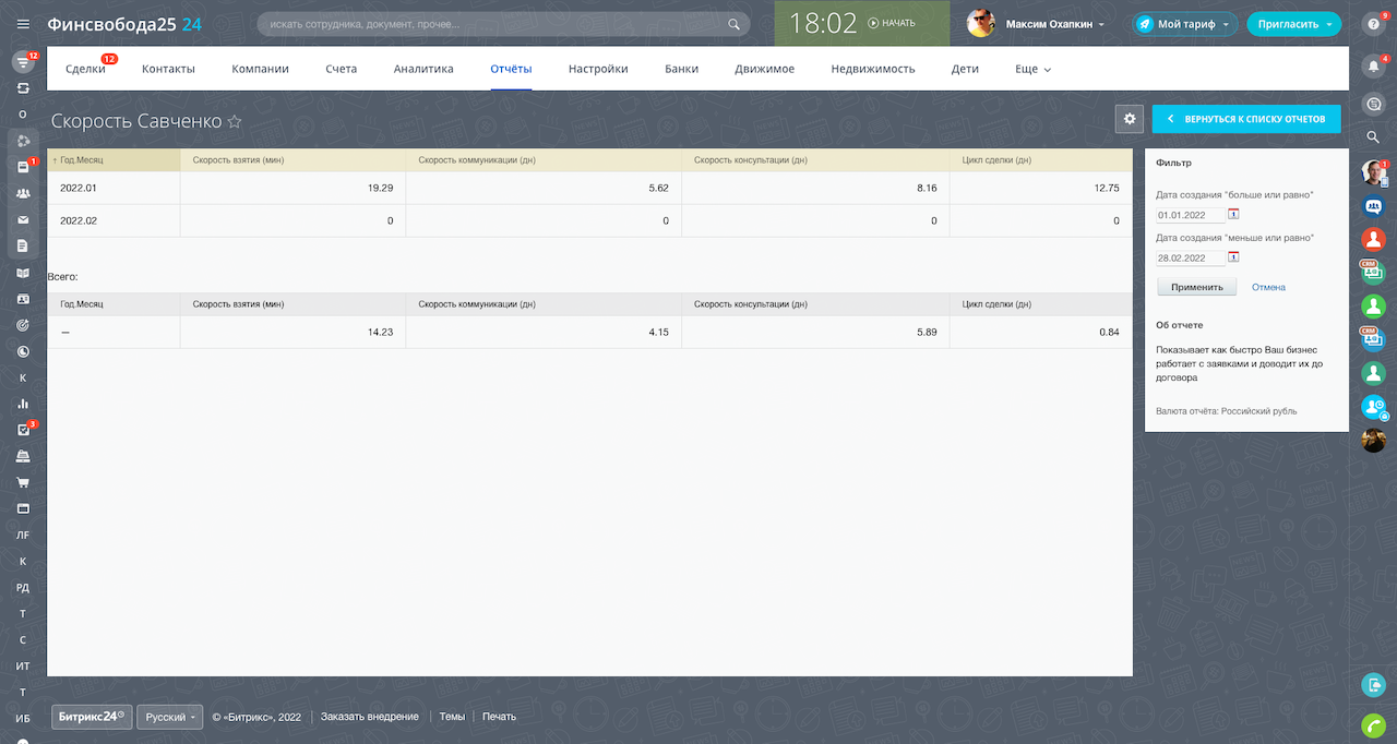 - Скорость Савченко - показывает с какой скоростью работает Ваш бизнес (скорость взятия в работу новой заявки, выход на коммуникацию, проведения консультации и цикл сделки.