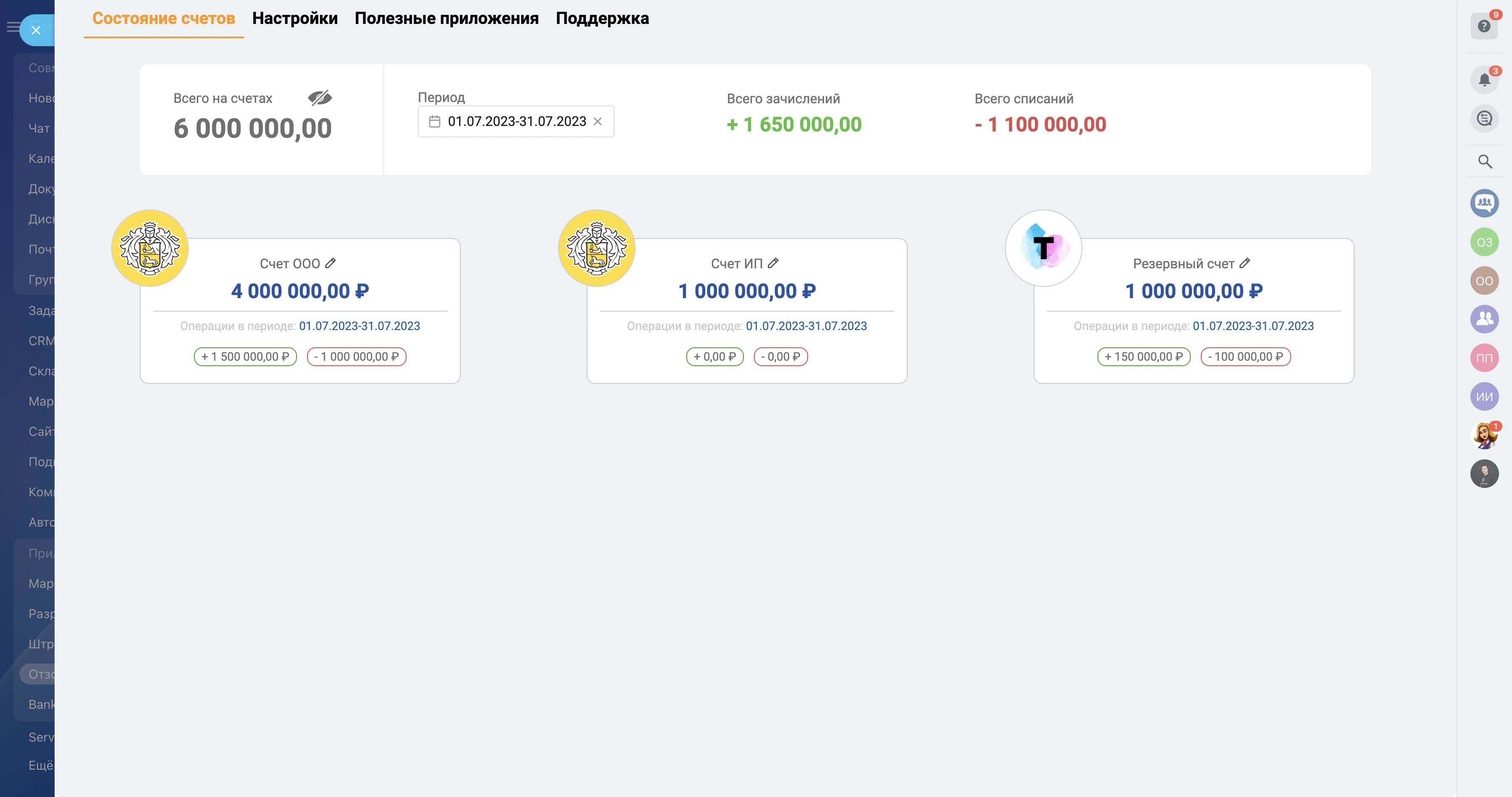 Приложение позволяет на один дашборд вывести состояние и операции по счетам в разных банках.