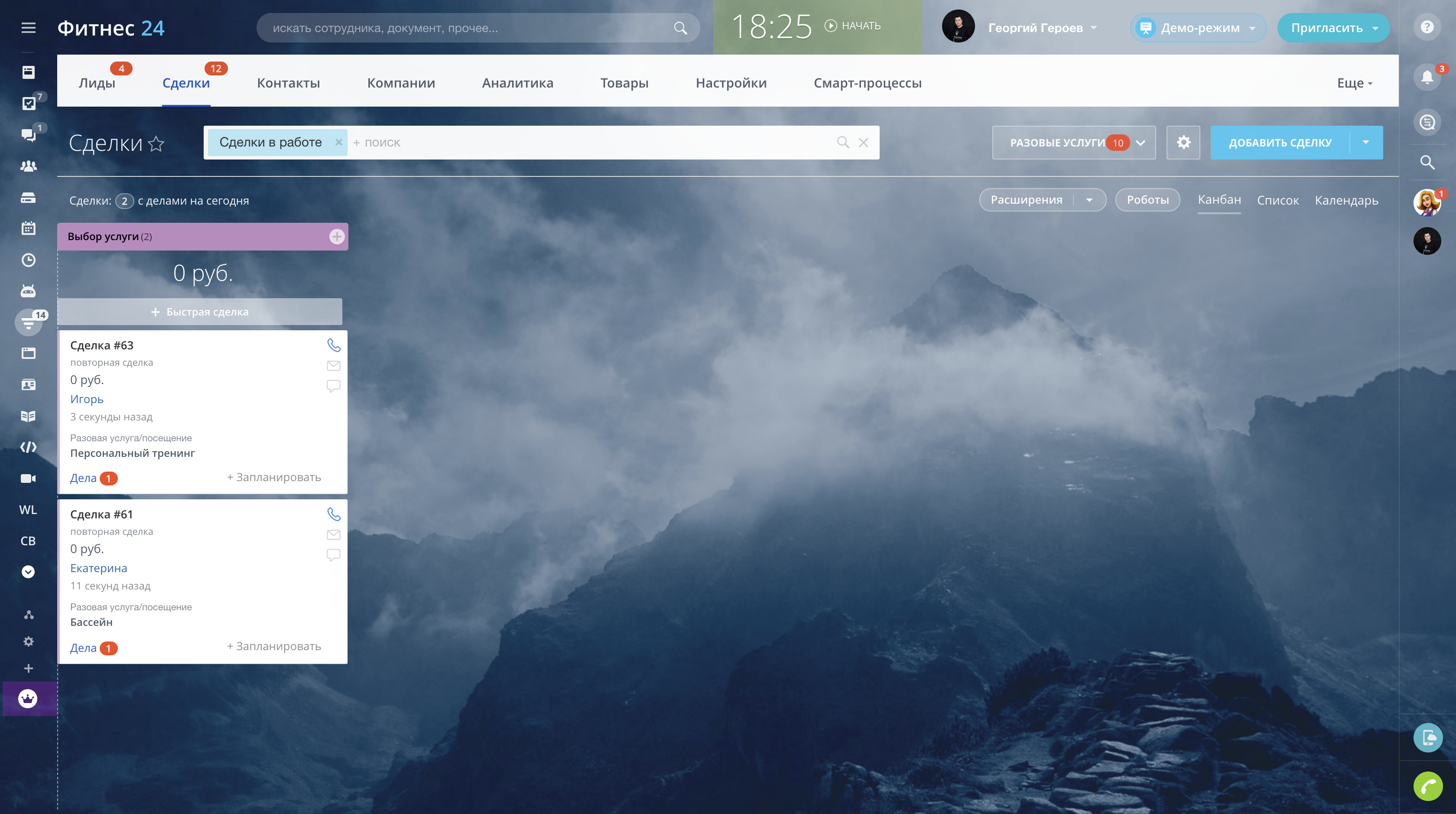 Готовое решение для фитнес-клубов и спортивных центров. CRM специально сконфигурирована для вашего бизнеса и готова к работе. Решение позволяет продавать как разовые услуги, так и абонементы на посещение.