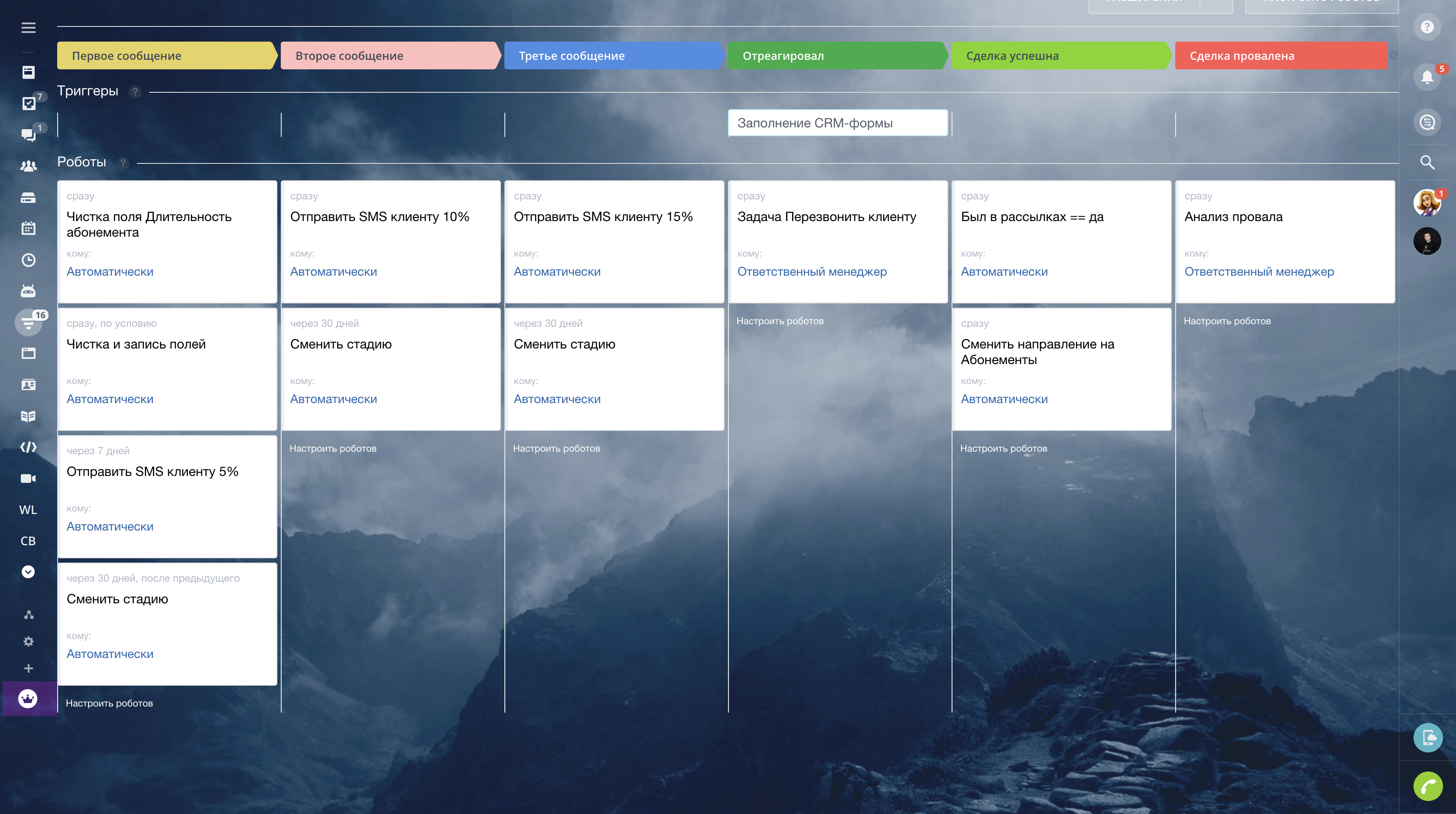 Сделка провалена - сюда переходят сделки, по которым клиенты не отреагировали на рассылку. Автоматический переход происходит через 30 дней после последнего сообщения.