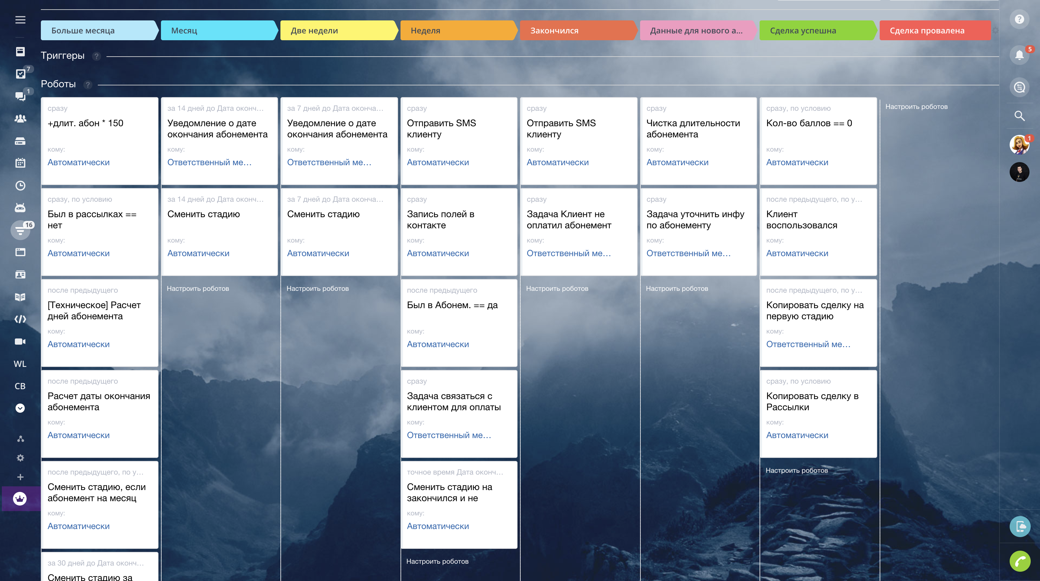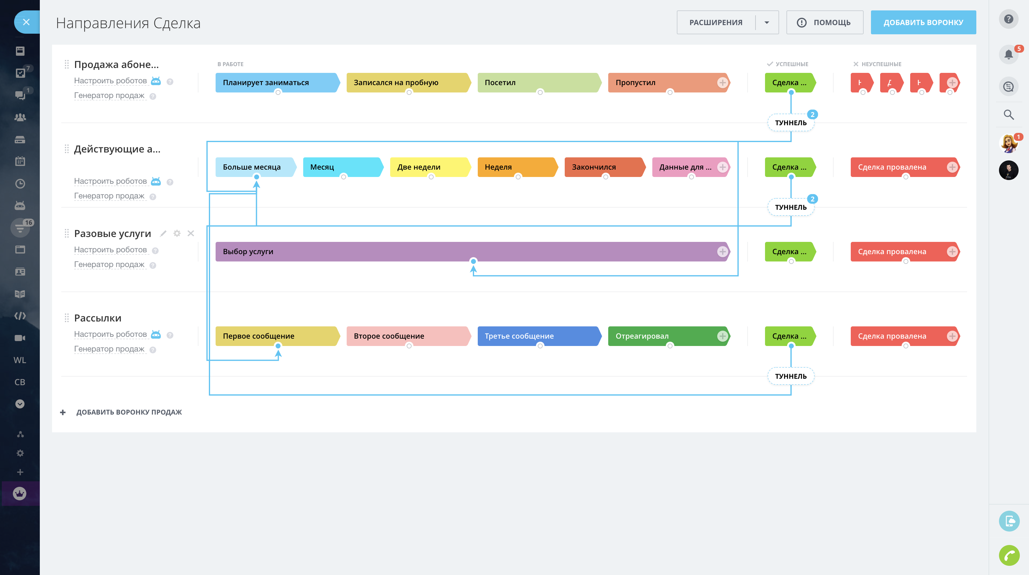 В этой воронке находятся сделки по которым идет стимулирующая рассылка. Сделки могут попасть сюда автоматически (если клиент не продлил действующий абонемент) или же можно переместить сделку сюда вручную из другой воронки (сменить направление).