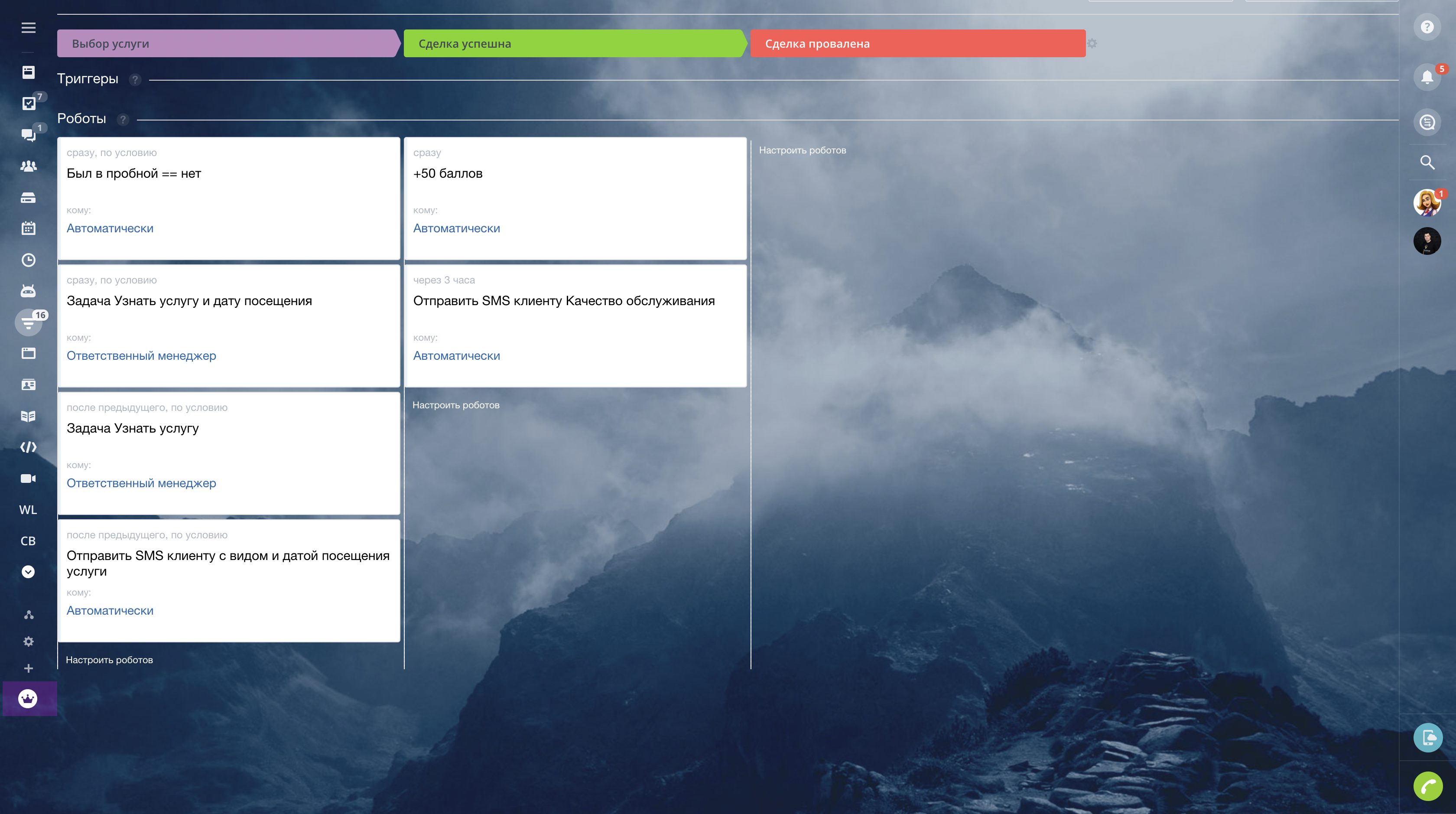 Сделка успешна – завершаем сделку как успешную, если клиент оплатил услуг и услуга оказана. Клиенту отправляется СМС с предложением дать обратную связь