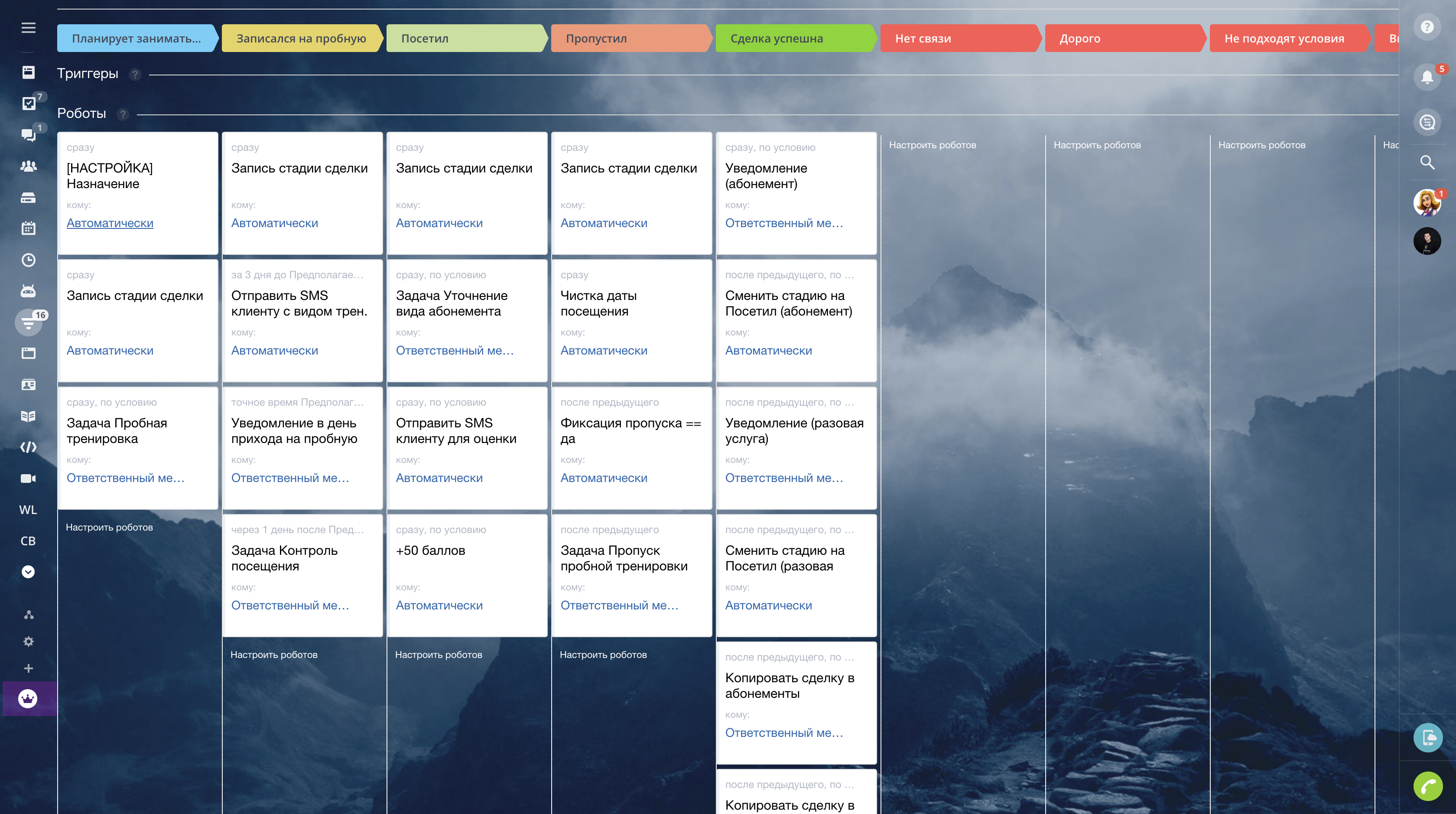 Записался на пробную – здесь находятся сделки, по которым запланирована пробная тренировка. При переходе в эту стадию клиенту автоматически отправляется СМС с информацией о тренировке.