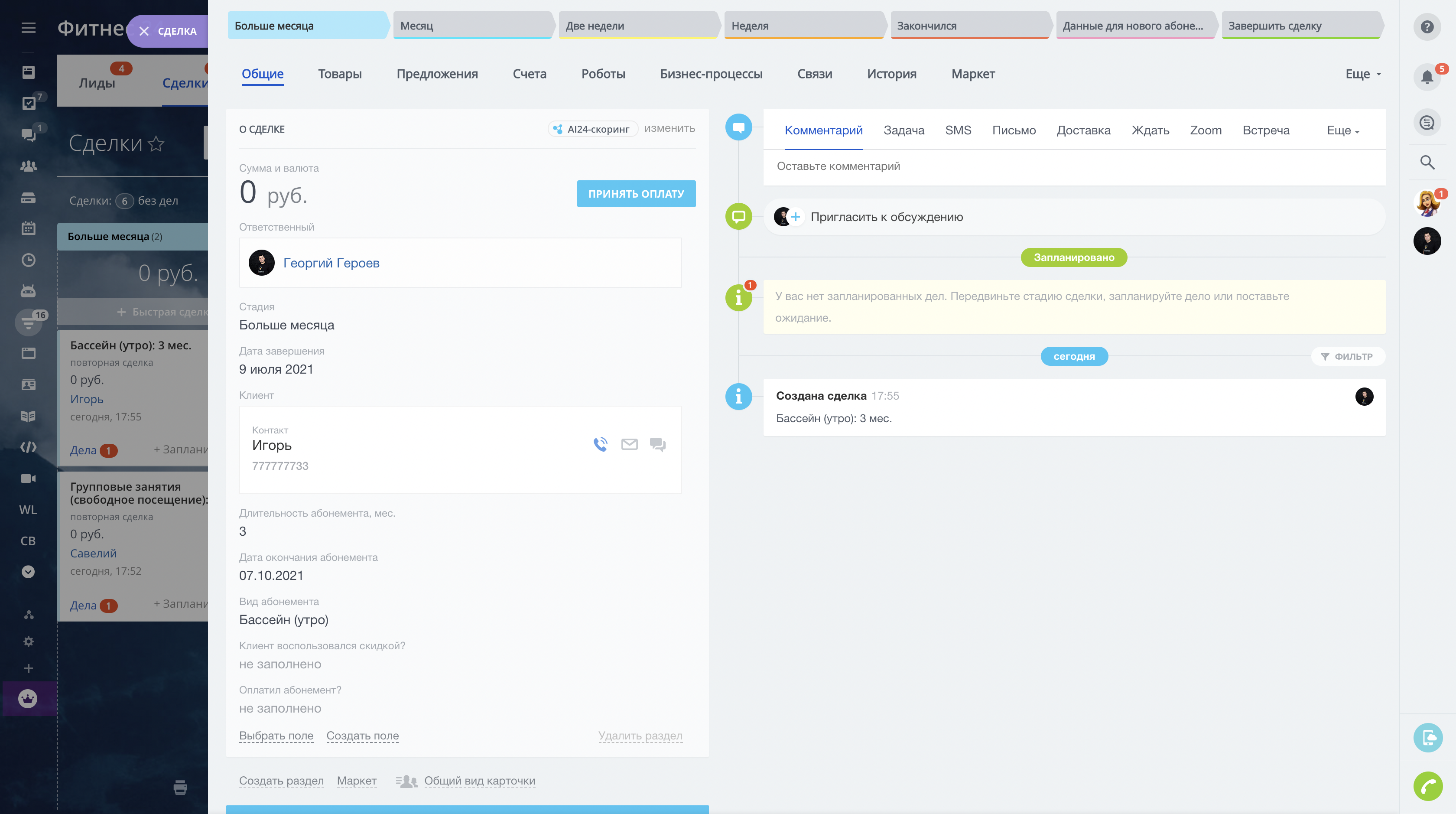 Если клиент сразу приобретает абонемент, то сделку можно закрыть как успешную прямо с этой стадии. После заполнения обязательных полей будет создана сделка в воронке абонементов