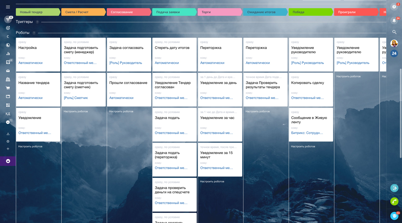 Для того, чтобы систематизировать работу с тендерными заявками отлично подходит CRM Битрикс24. Автоматизация должна делать работу сотрудников компании проще, понятнее и прозрачнее. Роботы автоматически ставят задачи, контролируют сроки и отправляют необходимые уведомления сотрудникам. Мы стремимся упросить процесс, чтобы свести к минимуму трудозатраты и человеческий фактор.