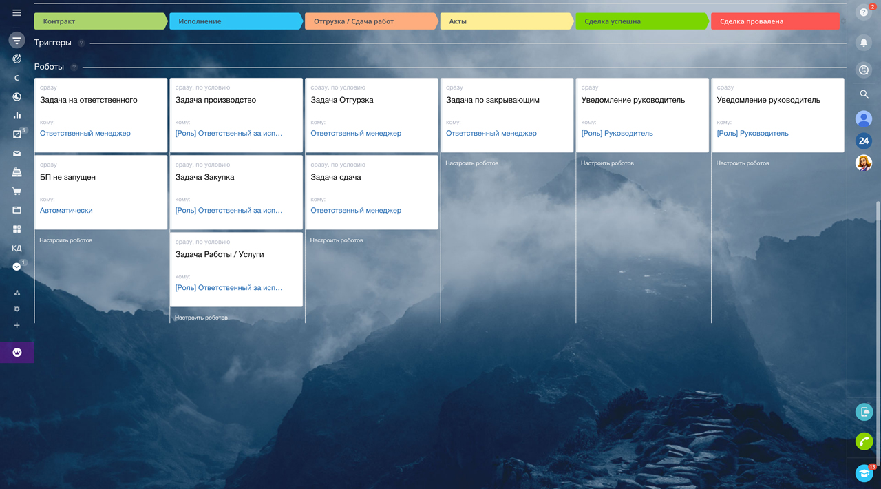 Торги - эта стадия предназначена для участия в аукционе. Робот напоминает ответственному о торгах за 1 день, за 1 час и за 15 минут. В тарифах "Команда", "Компания" и коробочных версиях бизнес-процесс добавляет дату и время аукциона в календарь компании и календарь ответственного.