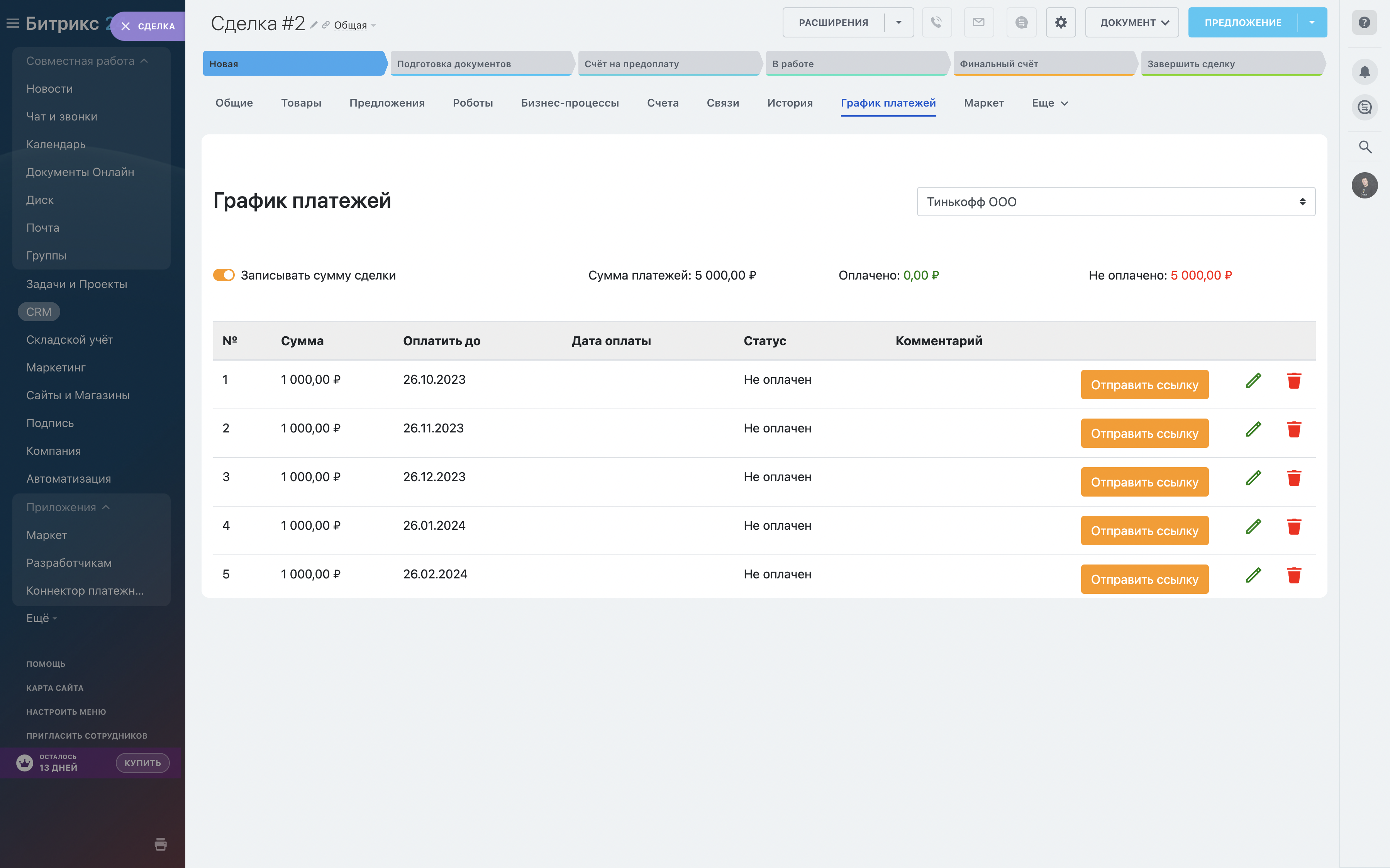 На отдельной вкладке в сделке вы можете сформировать график платежей для клиента. По каждому платежу можно отправлять ссылки на оплату (запускается бизнес-процесс отправки ссылки как в сценарии со своим типом поля). Бизнес-процесс необходимо создать самостоятельно с параметром «plink» с типом «строка». В бизнес-процессе вы можете самостоятельно выбрать способ отправки ссылки: на почту, по смс или в мессенджер. Статус платежа после успешной оплаты изменится автоматически и будет проставлена дата оплаты.