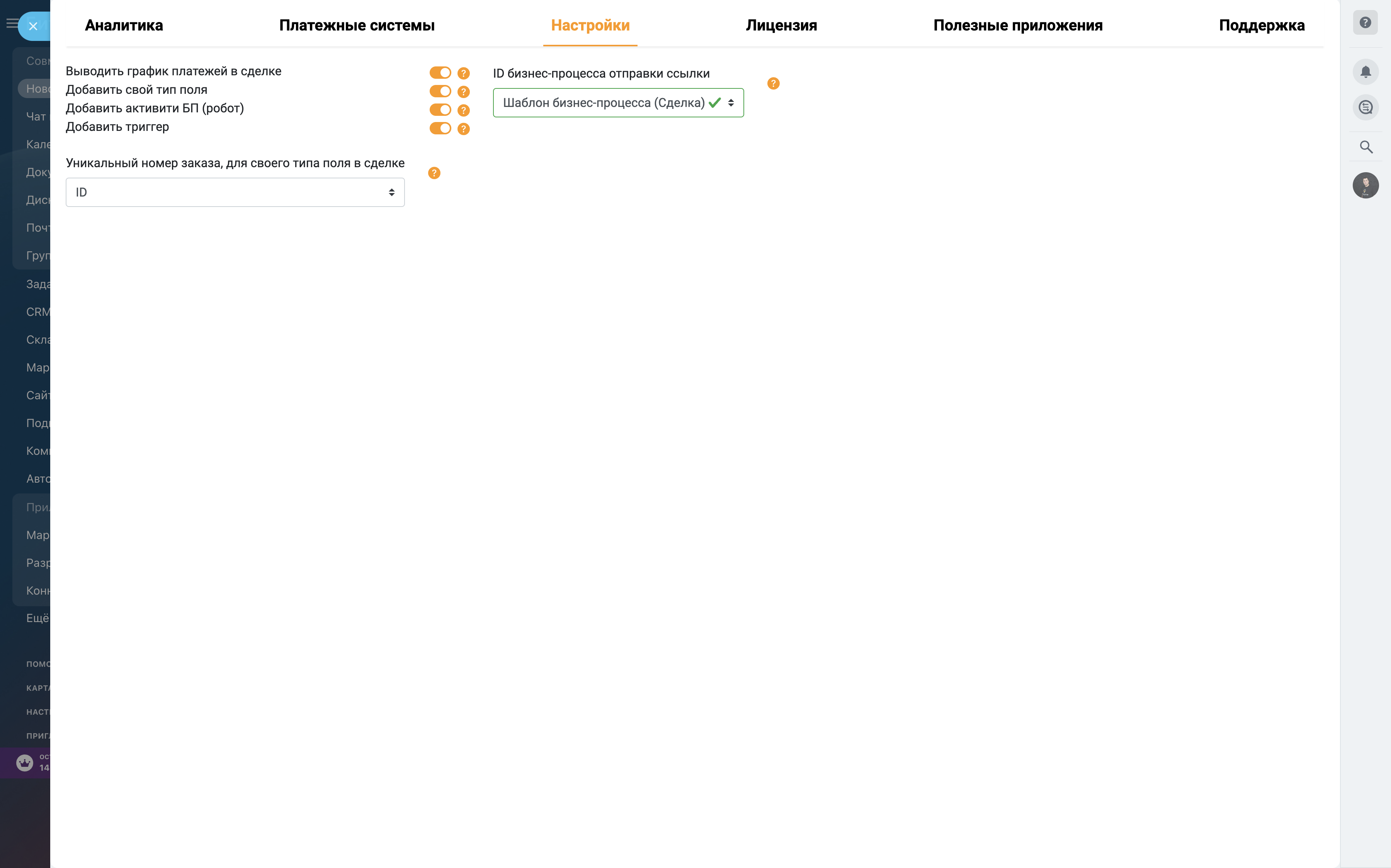 В левой части сделки добавляется в нужное место интерфейс формирования и отправки ссылки на оплату (необходимо вручную создать пользовательское поле с типом "Платежная ссылка"). Кнопка "Получить ссылку" формирует ссылку и показывает ее на экране (можете отправить ее вручную удобным способом). Кнопка "Получить и отправить ссылку" позволяет получить ссылку и передать ее в параметр бизнес-процесса, который автоматически отправит ссылку клиенту. Бизнес-процесс необходимо создать самостоятельно с параметром «plink» с типом «строка». В бизнес-процессе вы можете самостоятельно выбрать способ отправки ссылки: на почту, по смс или в мессенджер.
