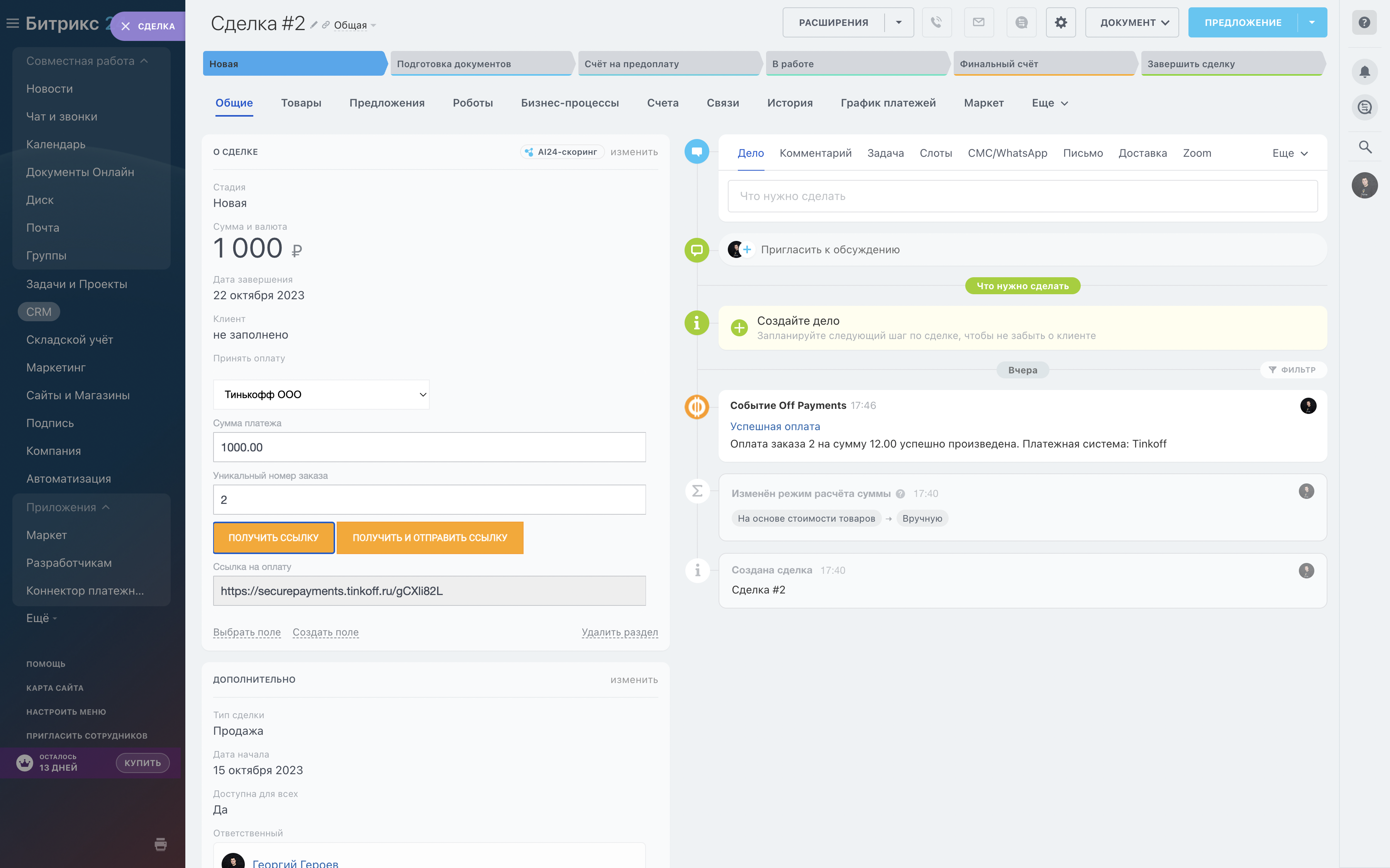 Приложение добавляет триггер ([Коннектор платежных систем Off Payments] Оплачено), который передвигает ссылку на стадию, где установлен триггер при успешной оплате.