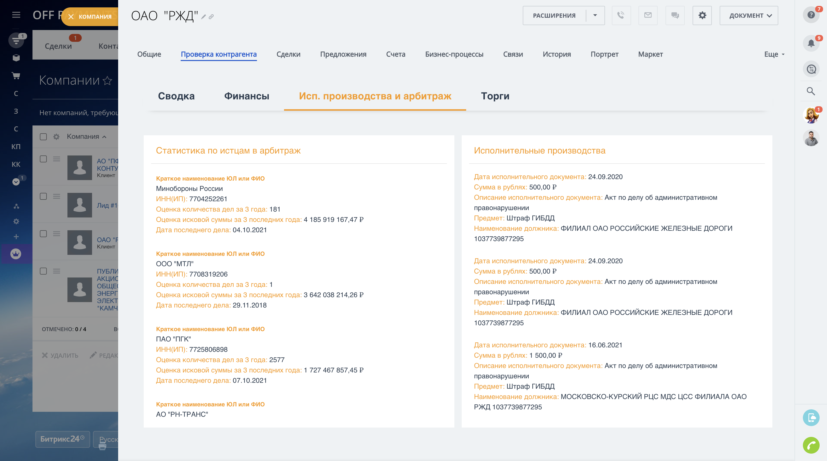 Приложение "Контур.Проверка контрагентов" позволяет по ИНН в компании получать отчет из сервиса Контур Фокус. Данные выводятся на отдельной вкладке в компании в Битрикс24.
