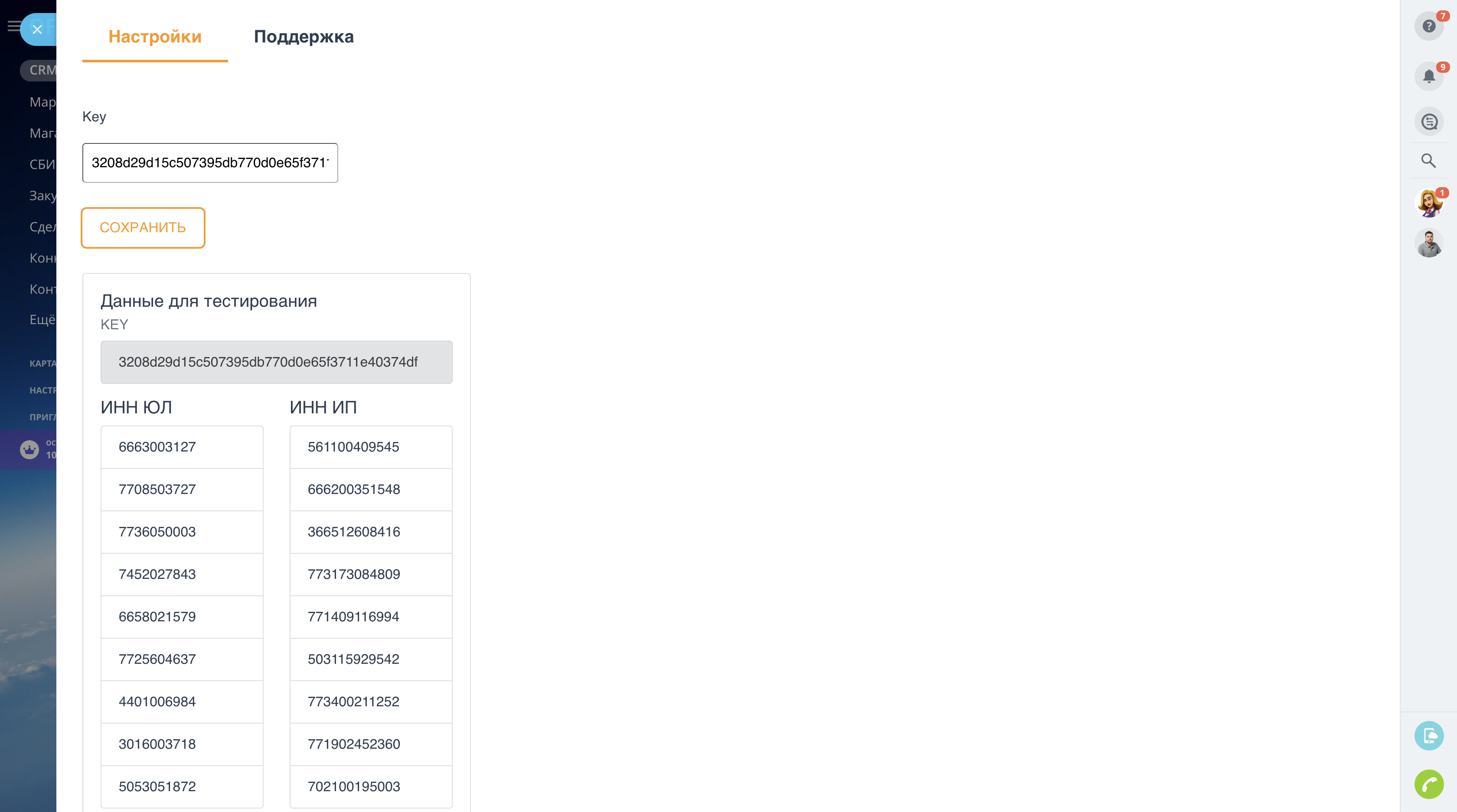 На вкладке с настройками приложения уже введен тестовый ключ (Key). Чуть ниже список тестовых ИНН для ООО и ИП. Для тестирования вы можете использовать любой ИНН, он должен быть введен в реквизиты компании.