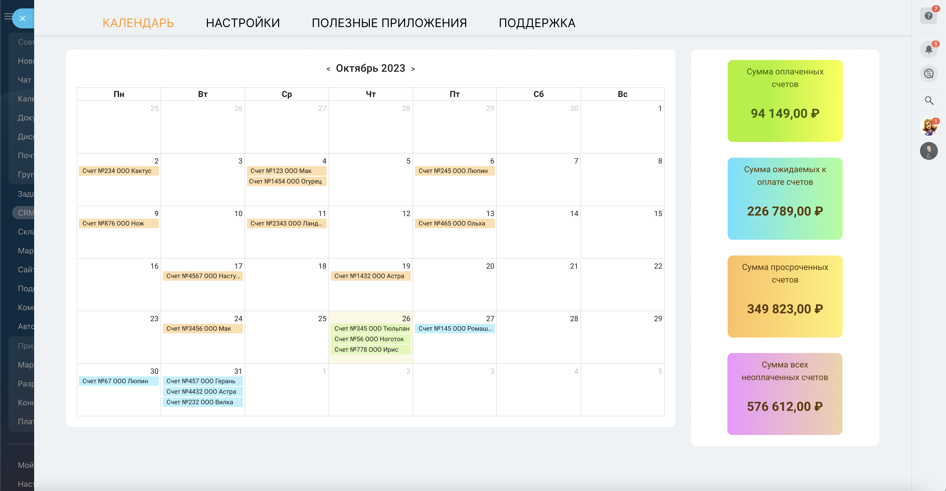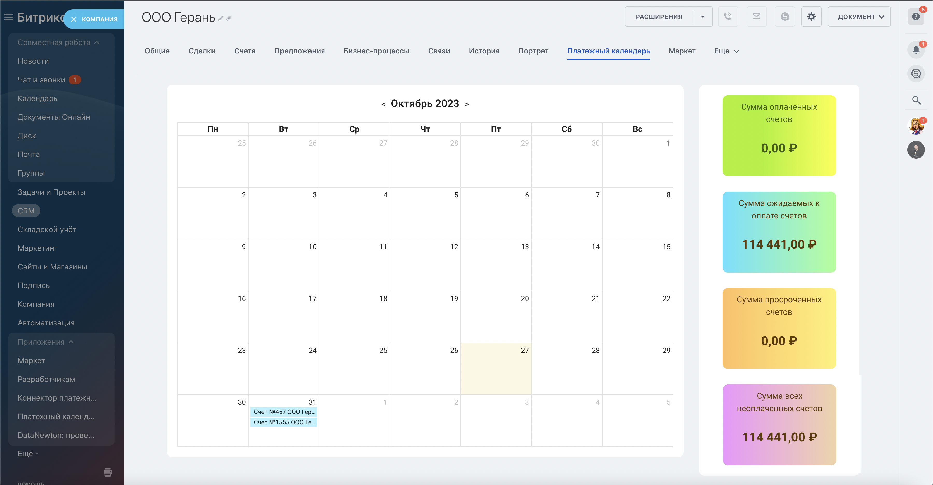 Приложение работает со штатными счетами Битрикс24, выводя их в удобном представлении календаря.