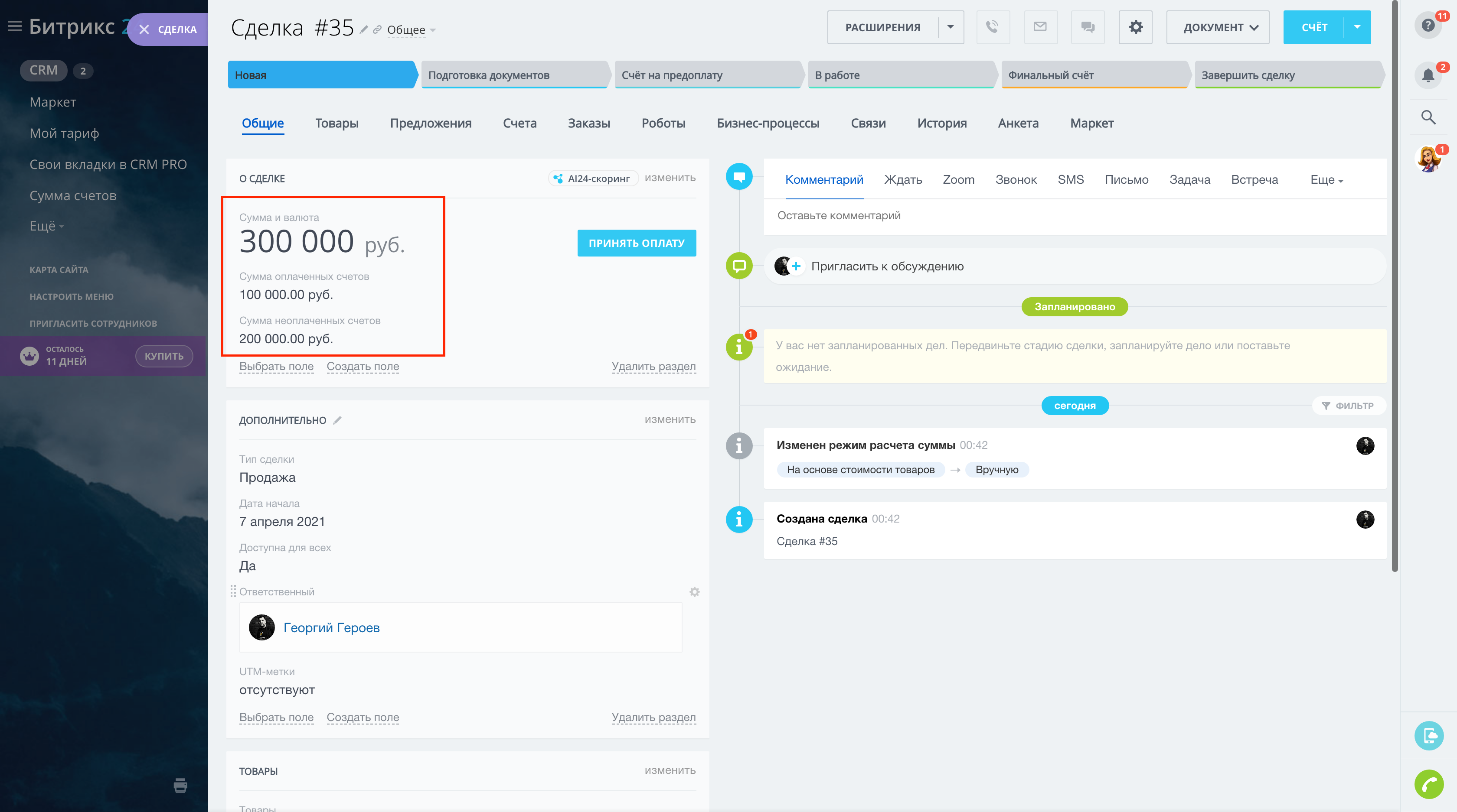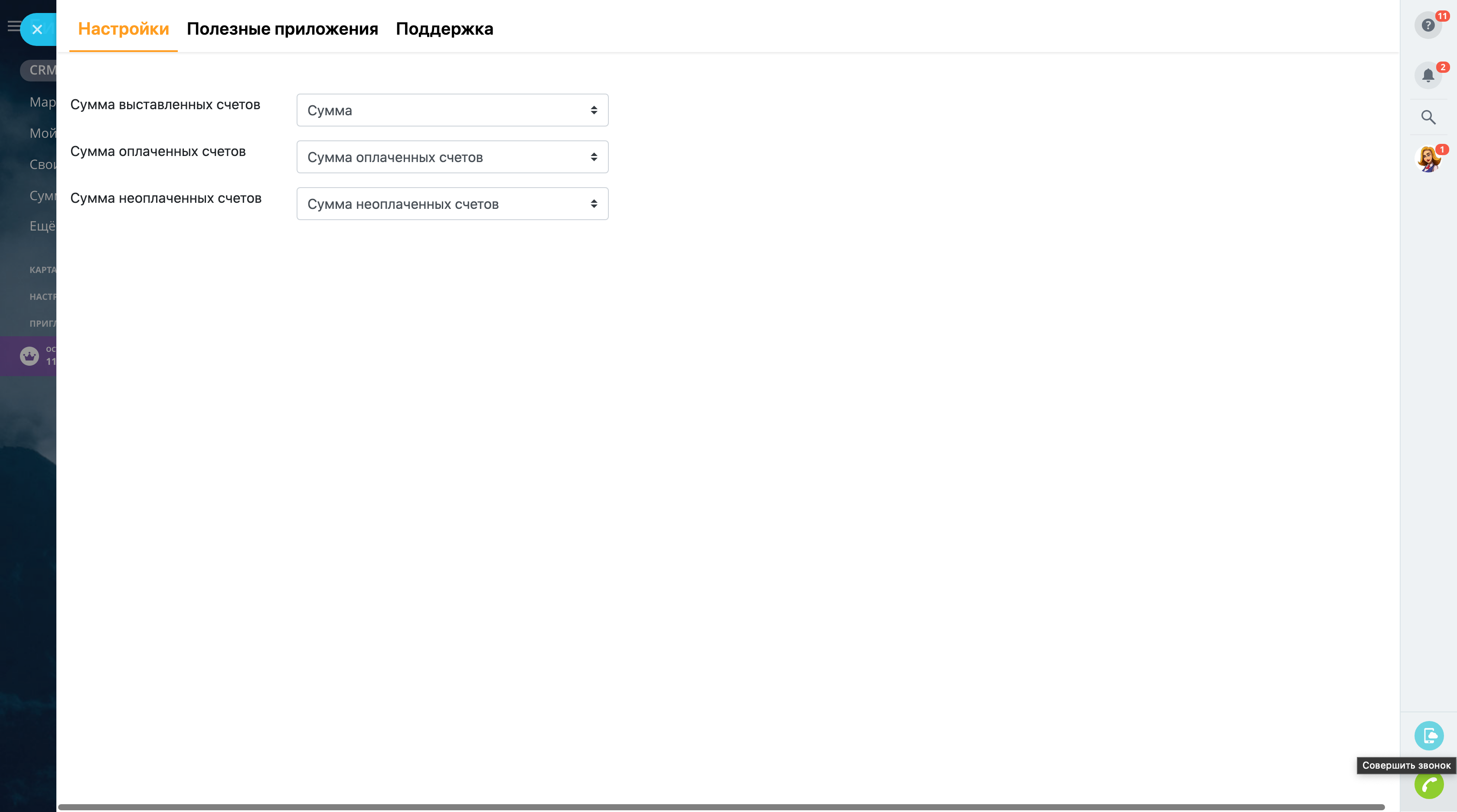 Приложение позволяет получать данные по всем счетам, привязанным к сделке и записывать сумму выставленных, сумму оплаченных и сумму неоплаченных счетов в поля сделки.