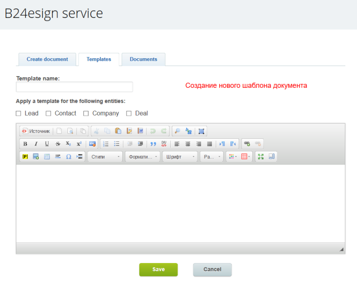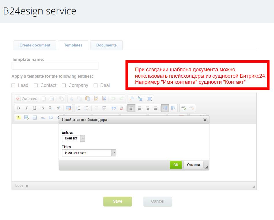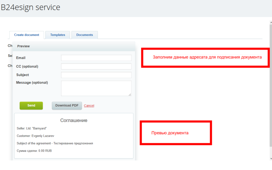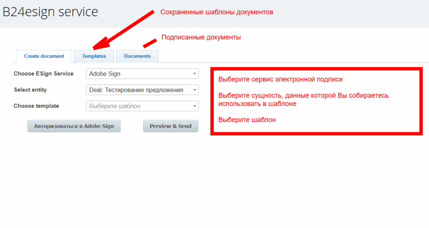 Используя приложение, пользователь может создать документ, составленный на основе сущностей портала Битрикс24, и подписать его.