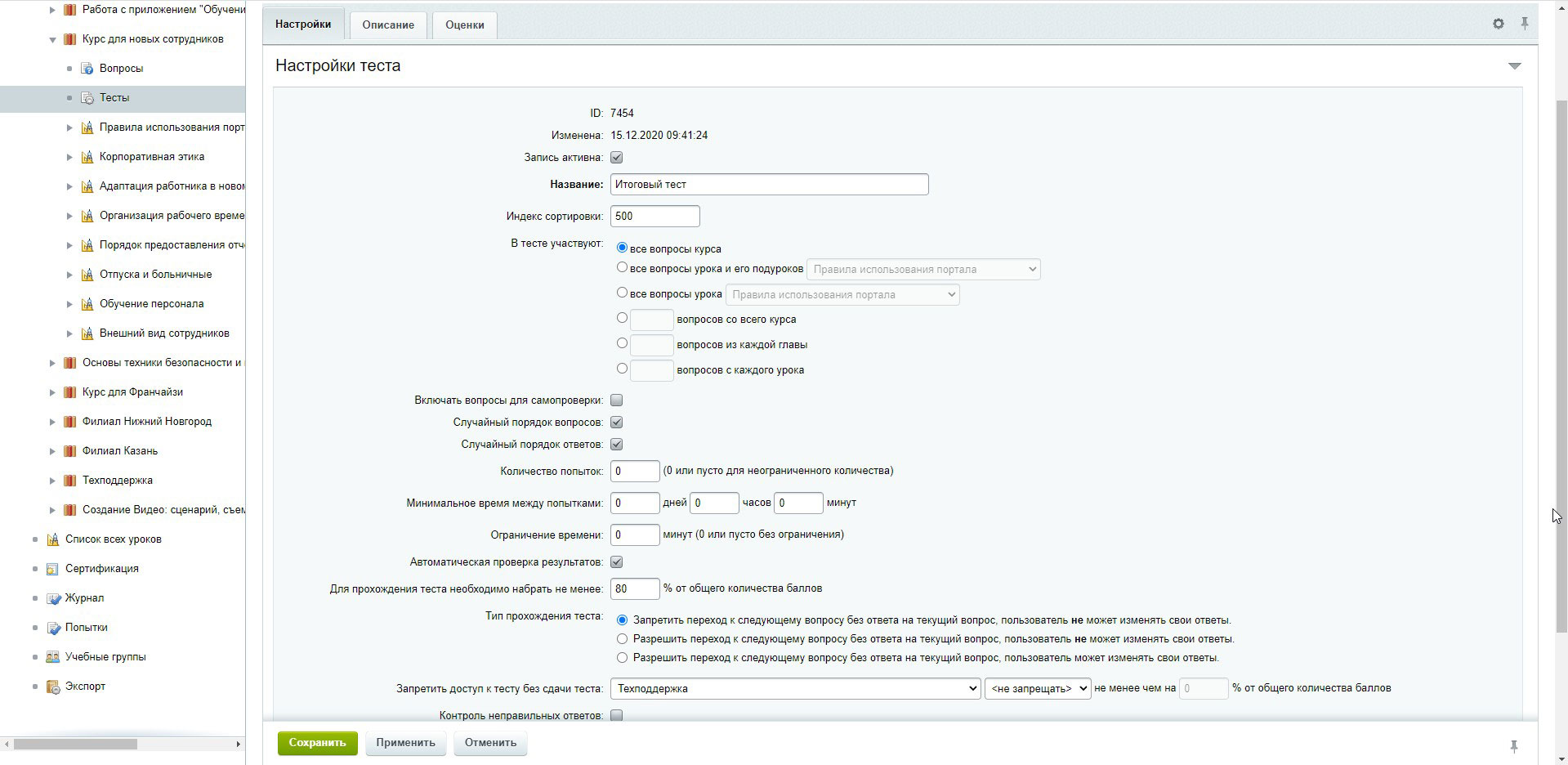- Можно видеть каждую попытку сдачи теста, процент прохождения и набранные баллы.