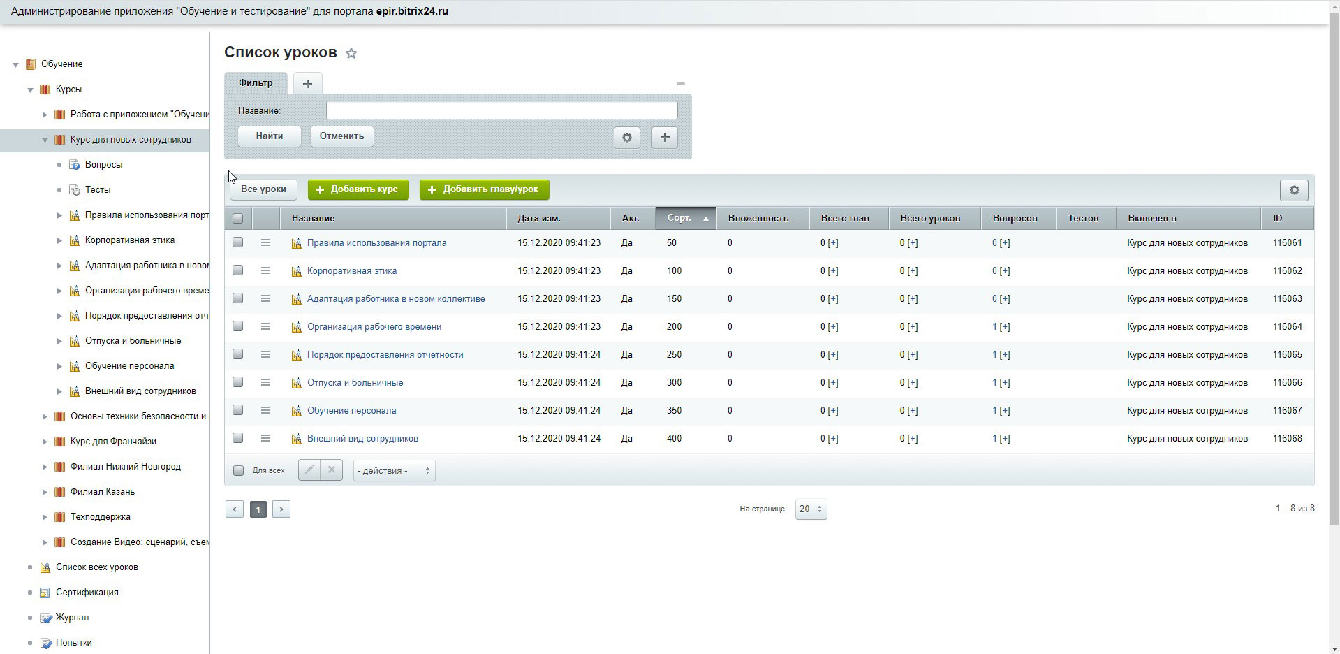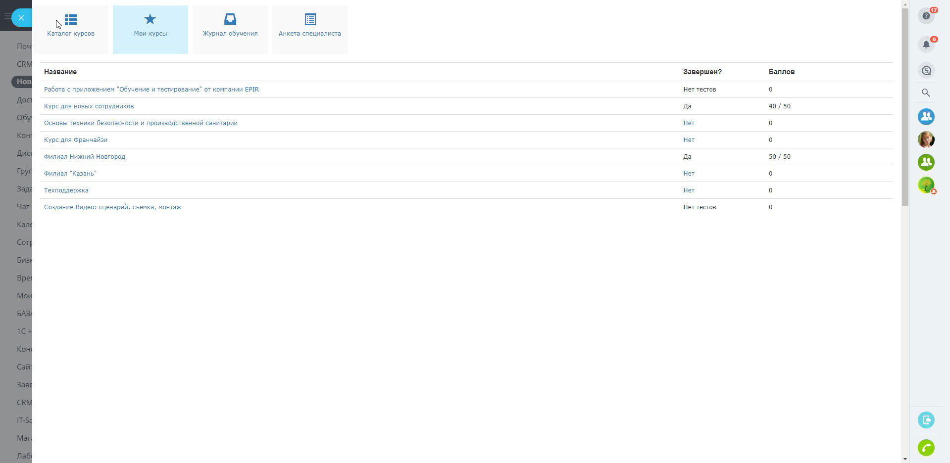 Приложение «Обучение и Тестирование» позволяет автоматизировать корпоративное обучение, создать базу знаний компании, контролировать уровень квалификации персонала во всех структурных подразделениях компании. Приложение позволяет быстро создать обучающие курсы из имеющихся у Вас материалов. Вы можете проводить обучение и тестирование как внутренних сотрудников компании, получающих доступ к курсам через Битрикс24, так и для неограниченного количества внешних пользователей, получающих доступ к вашим курсам по вашему приглашению.