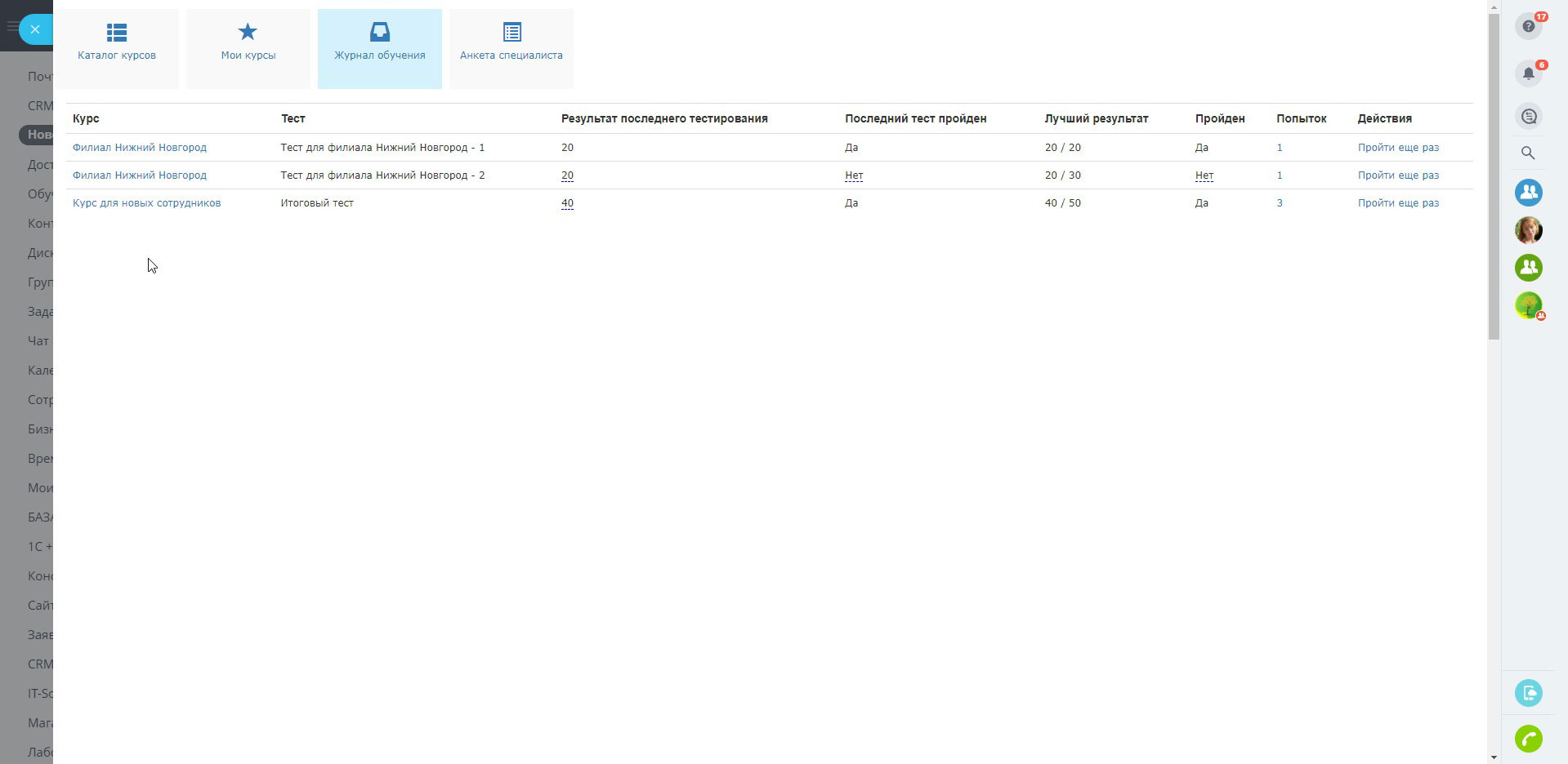- Журнал тестирования. Просмотр истории обучения доступен и учащимся, и преподавателям.