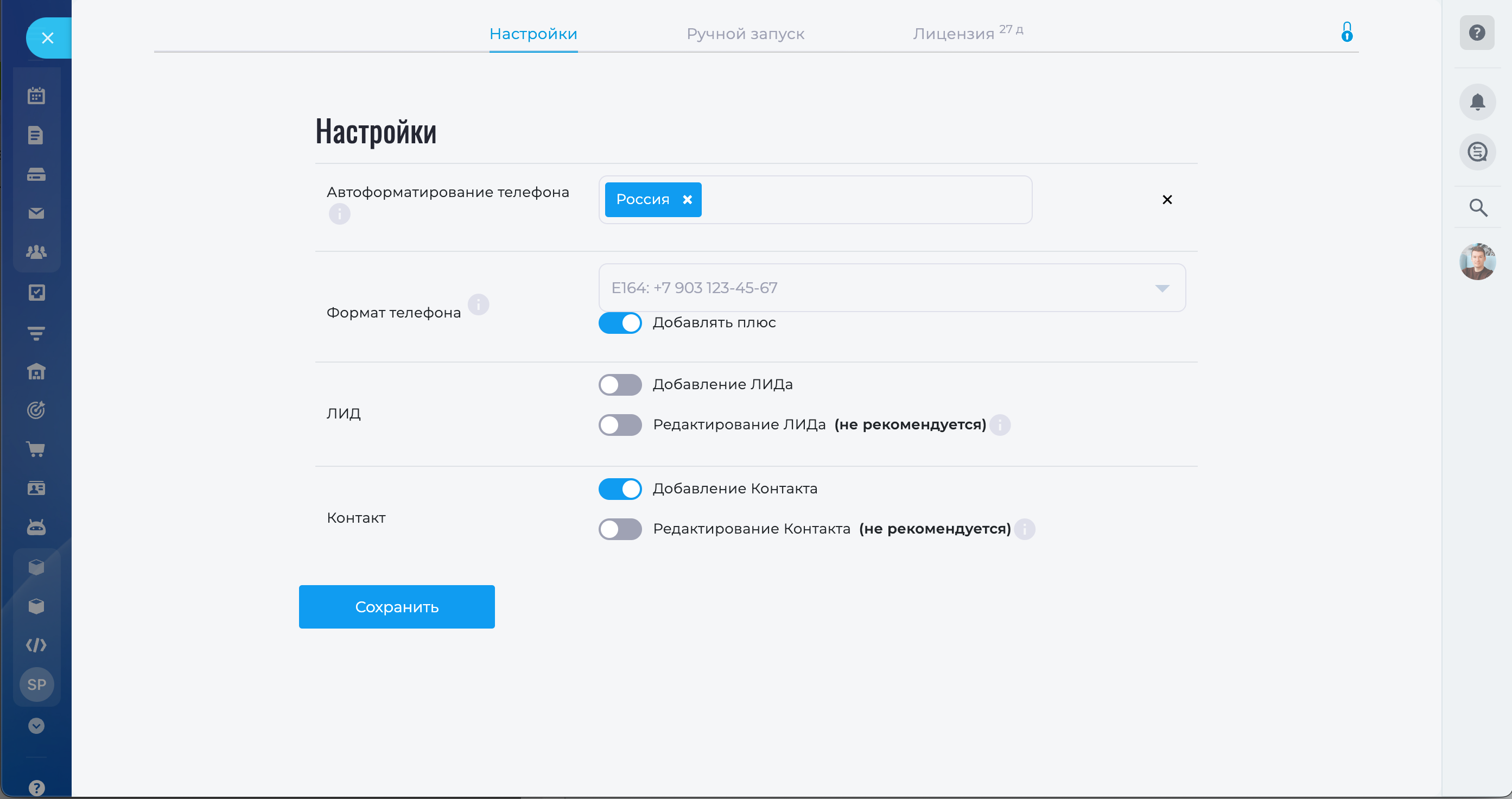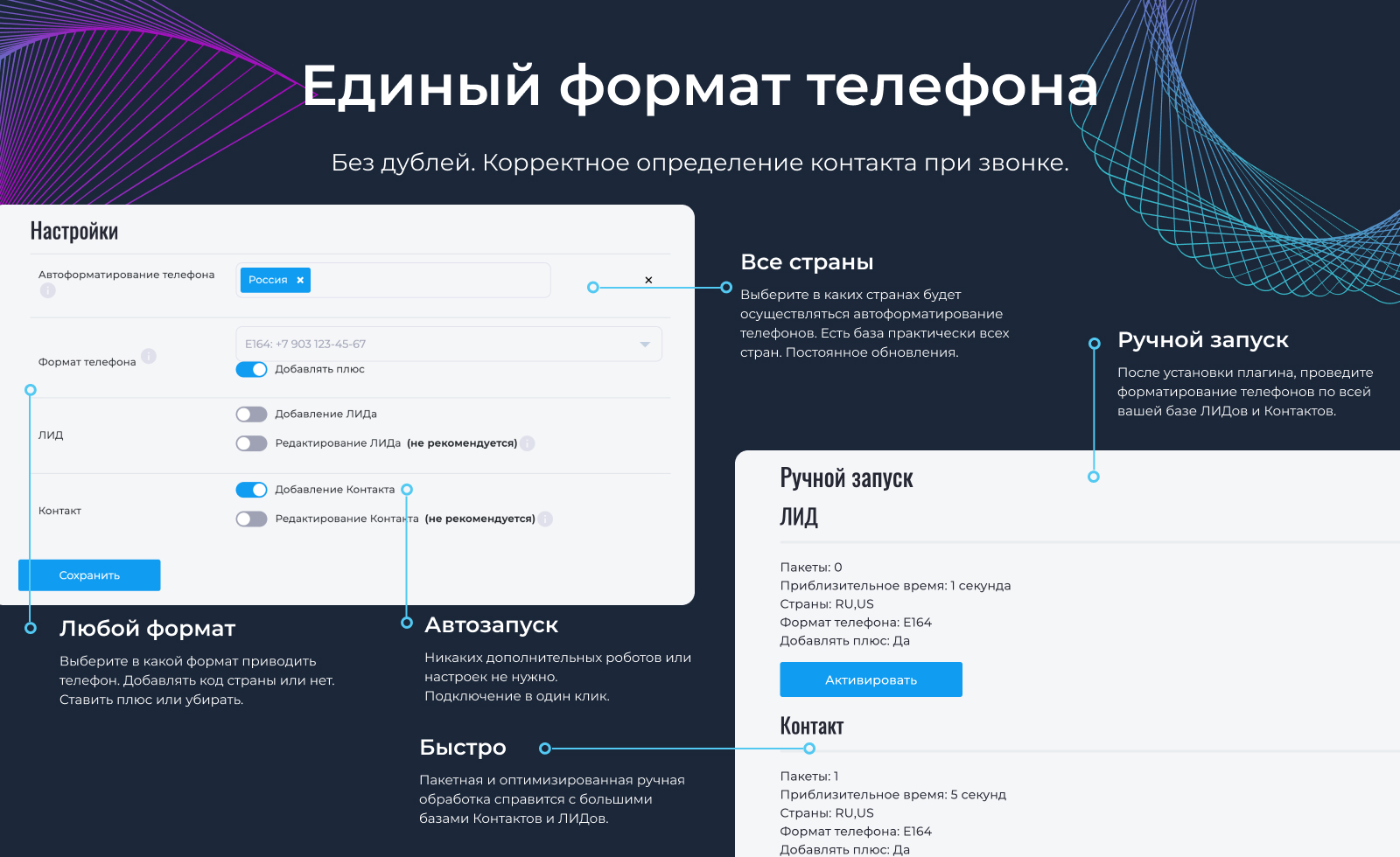 - Форматирование всей базы. Плагин пройдется по всей базе ЛИДов и Контактов и приведет их в единый формат.