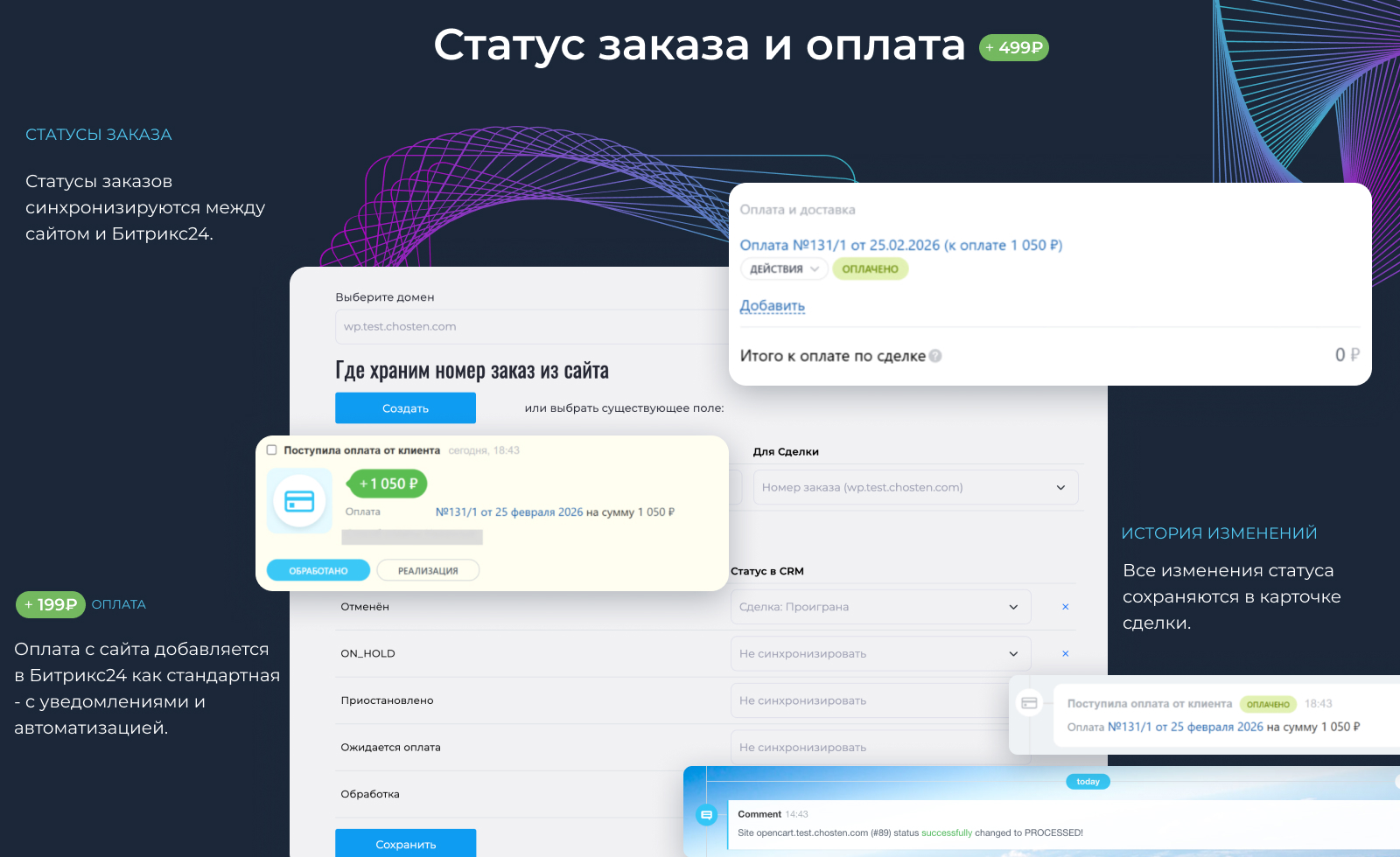 • Уведомления об оплатах. Платежи с сайта отображаются в CRM как родные — с уведомлениями и автоматизациями;