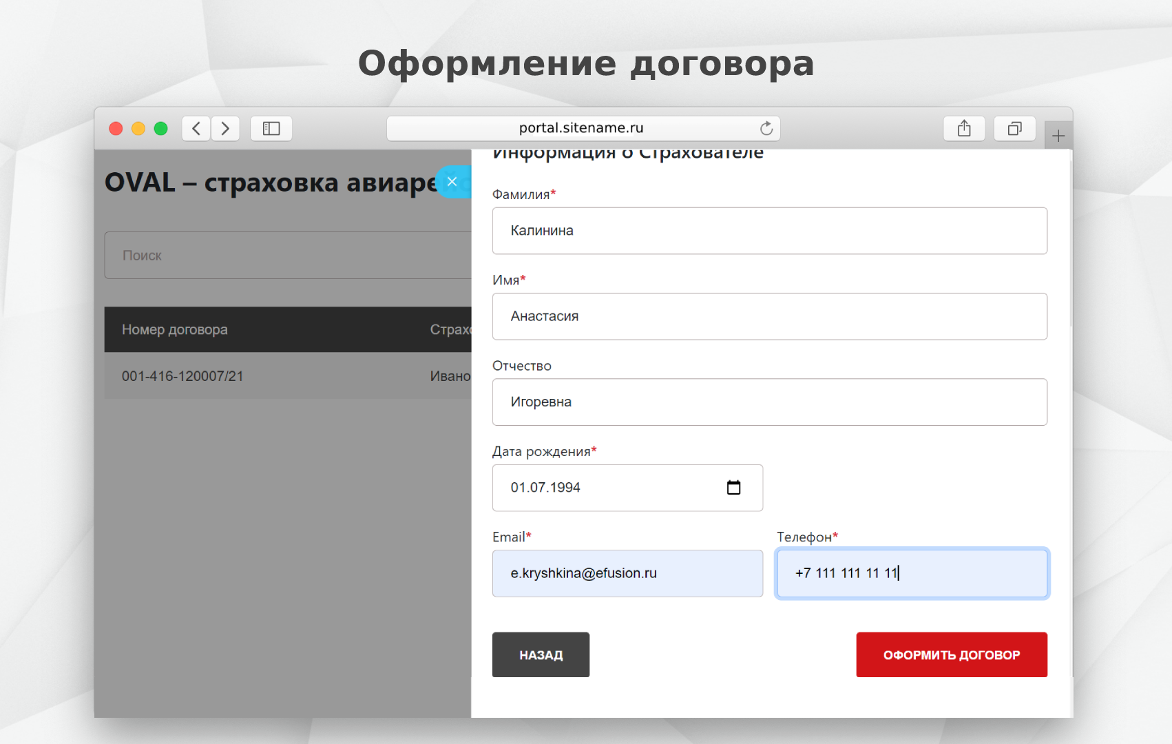 Для оформления страховки необходимо будет ввести свои контактные данные и нажать кнопку "Оформить договор".
