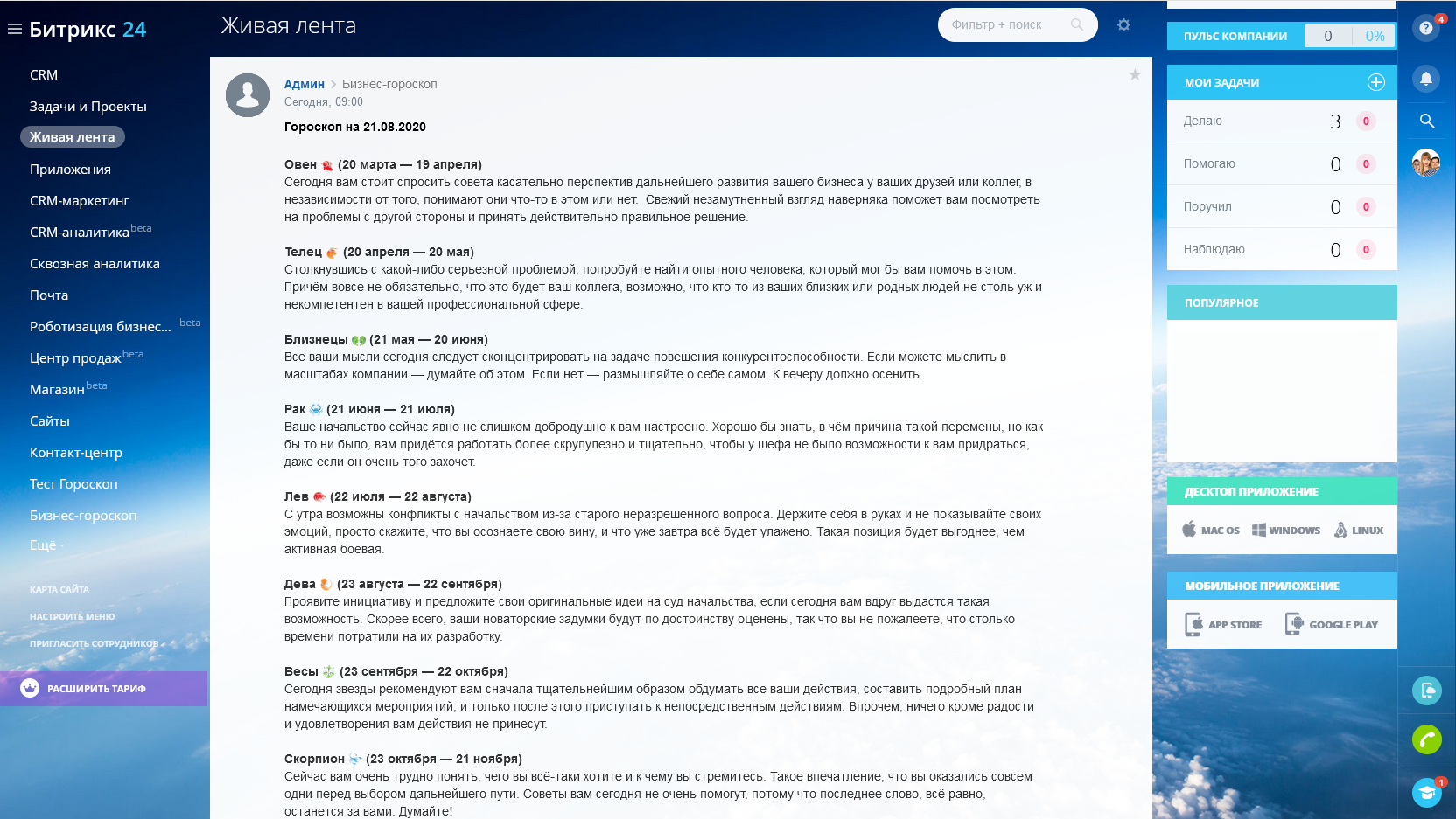 Приложение бизнес-гороскоп публикует в Живой Ленте Битрикс24 деловой гороскоп на каждый день. Ваши сотрудники будут настроены на свершения и победы каждый день!