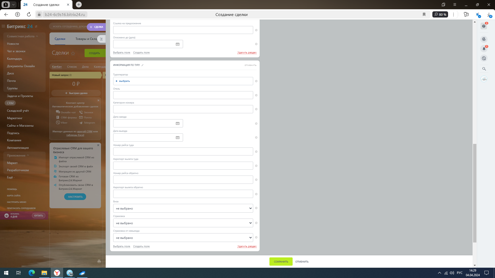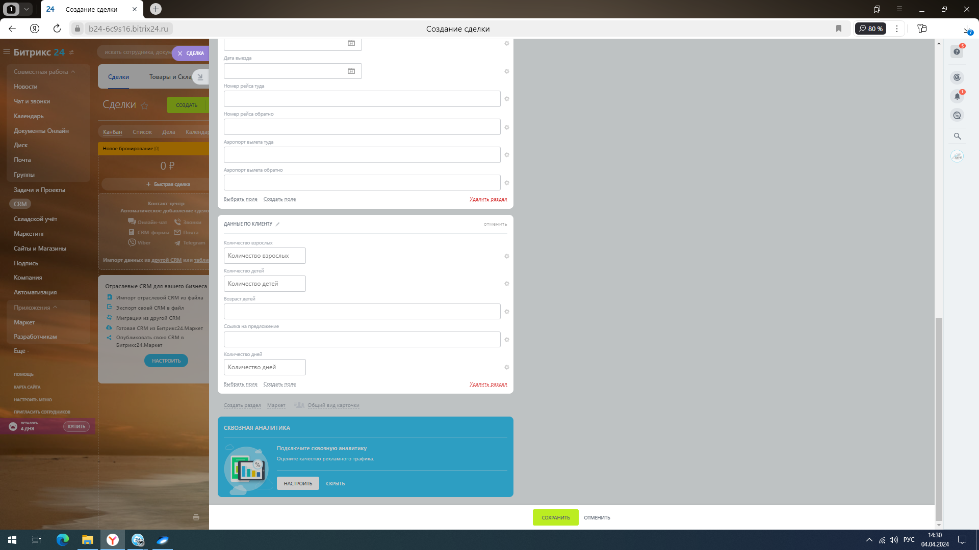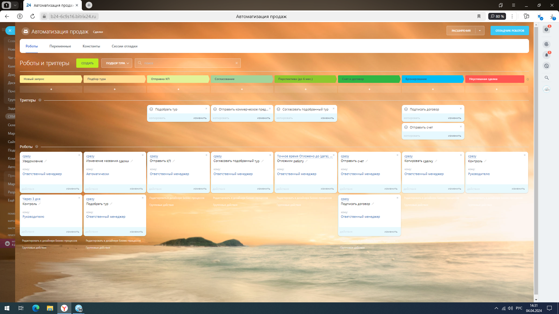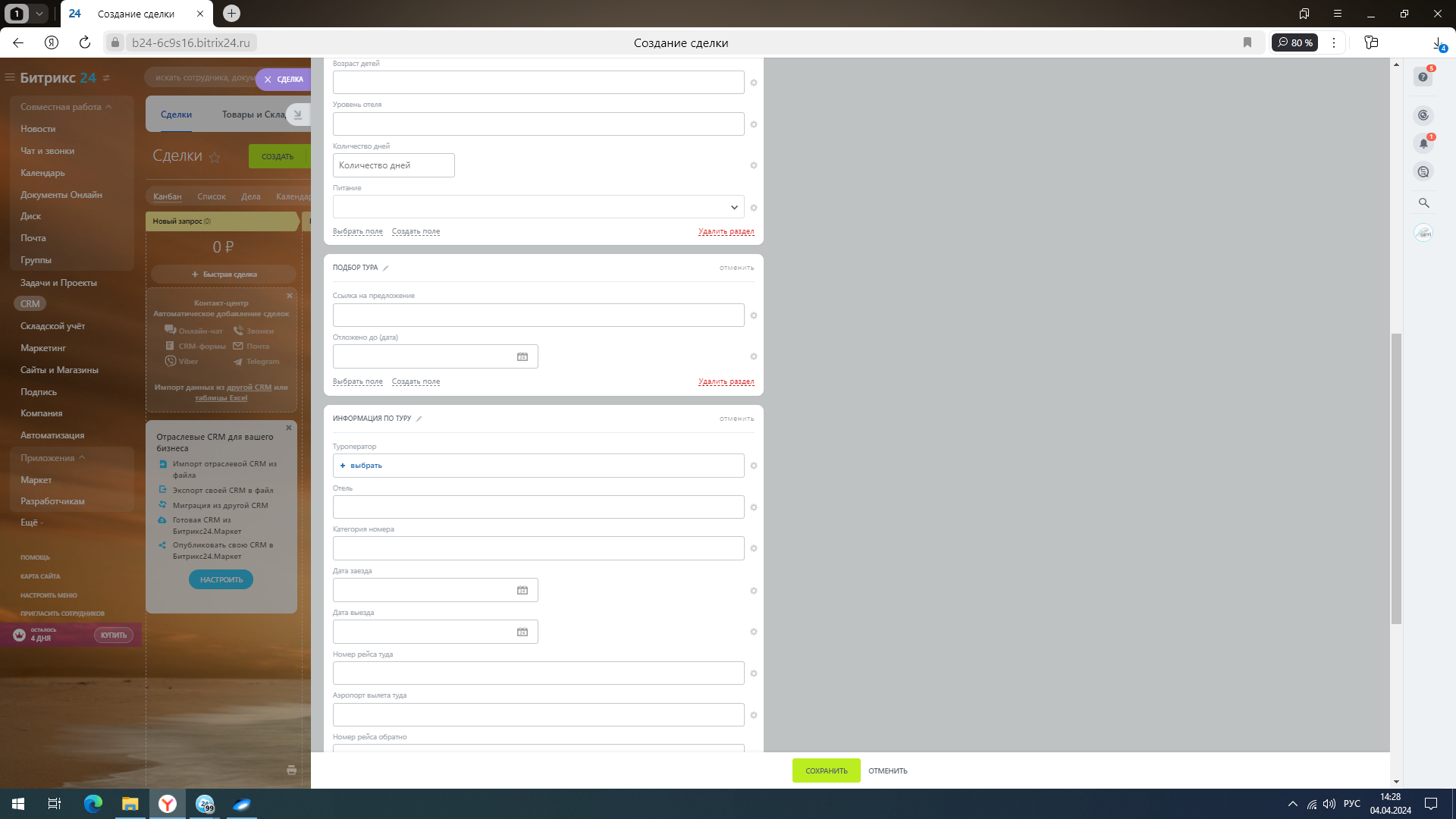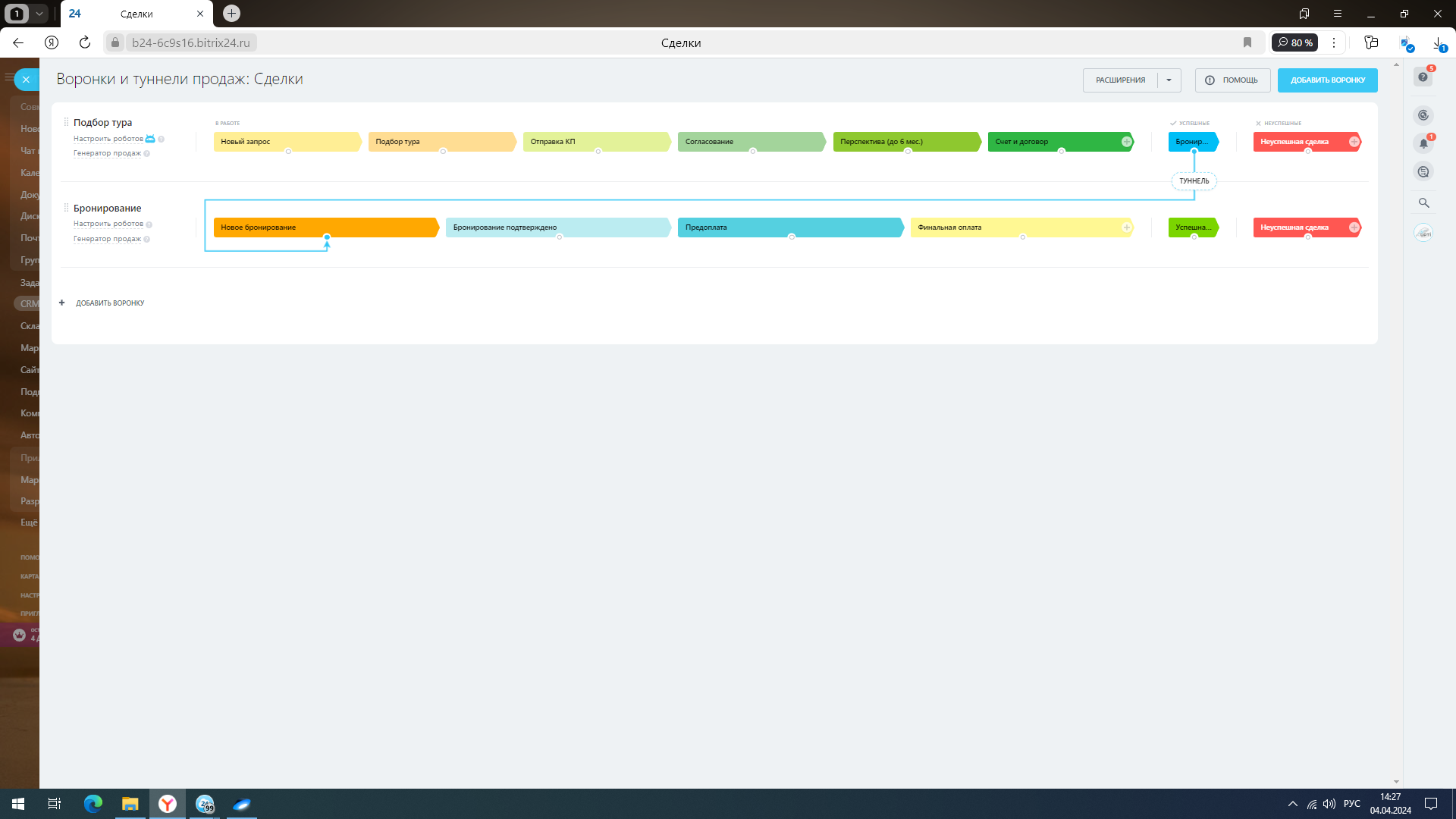 CRM для вашего бизнеса полностью настроена. При настройках учли все этапы Сделки. Созданы воронки сделок: · Подбор тура · Бронирование